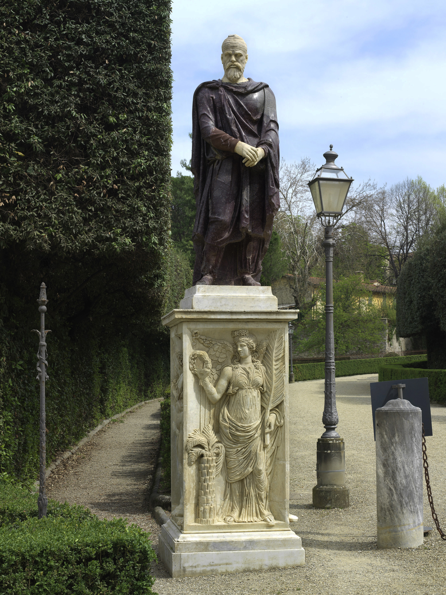 La scultura, maggiore del vero, raffigura un personaggio barbato vestito di tunica, bracae e mantello affibbiato sulla spalla destra. Sulla testa l’uomo indossa un cappello, detto pileus, che consente di identificarlo come un Dace appartenente all’élite aristocratica e sacerdotale. L’opera ha condiviso le vicende collezionistiche del suo vicino il Dace comatus, alla cui scheda si rimanda per i dettagli. Anche in questo caso, si dovrà pensare ad una scultura originariamente pensata per il decoro di un grande complesso pubblico di età traianea (verosimilmente il Foro di Traiano).Le statue di Dace conobbero una notevole fortuna in epoca rinascimentale e barocca come ornamento di palazzi, giardini e ville (De Lachenal 1987; De Lachenal 1991 pp. 609-621). A Firenze, nel Museo dell’Opera del Duomo, si conserva un precoce esempio di recupero post antico di questa iconografia su un corpo di profeta destinato alla decorazione della facciata della cattedrale già alla fine del XIII secolo. La figura, attribuibile alla bottega di Arnolfo di Cambio e posta a fianco di quella di Bonifacio VIII in trono, presentava, come altre figure di martiri e santi presenti nella decorazione della facciata (Le printemps 2013 pp. 272-273, nn. I.12, b-c ), una testa antica adattata a un corpo realizzato ex novo. Oggi non abbiamo difficoltà a riconoscere nelle fattezze del volto (caratterizzato da una pronunciata bombatura della fronte e occhi profondamente infossati) e coronato dal caratteristico turbante, un Dace “pileato”, così come ricorre frequentemente nell’iconografia ufficiale di età traianea (Capecchi 1992 p. 28-35). E’ interessante rilevare che la testa oggi conservata nel museo dell’Opera del Duomo presenta stringenti affinità dimensionali e iconografiche proprio con la testa del pileato in marmo bianco montata sul corpo porfiretico conservata a Boboli.