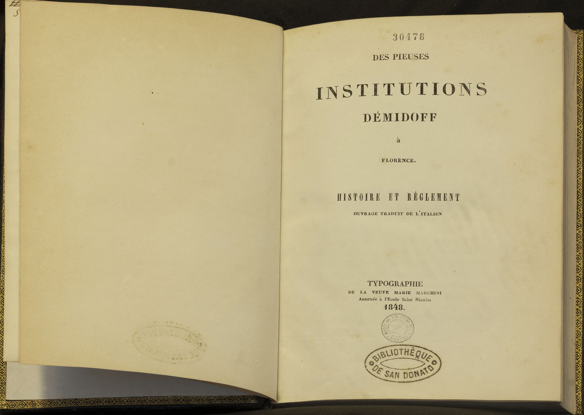 L'esemplare, come mostra il timbro di provenienza, proviene dalla dispersa biblioteca della fastosa villa edificata a Firenze da Nikolaj Demidov. Il volume è contrassegnato anche dalle sigle “SW.2”, “Meuble H2” che sono, probabilmente, tracce dell’antica collocazione del libro nella biblioteca. Il volume contiene regole e organizzazione della scuola maschile per i poveri che Nikolaj aveva fondato a Firenze nel 1828 nel quartiere di San Niccolò, e che fu poi largamente finanziata dal figlio Anatolij. Il testo si deve al direttore della scuola, il marchese Carlo Torrigiani.
