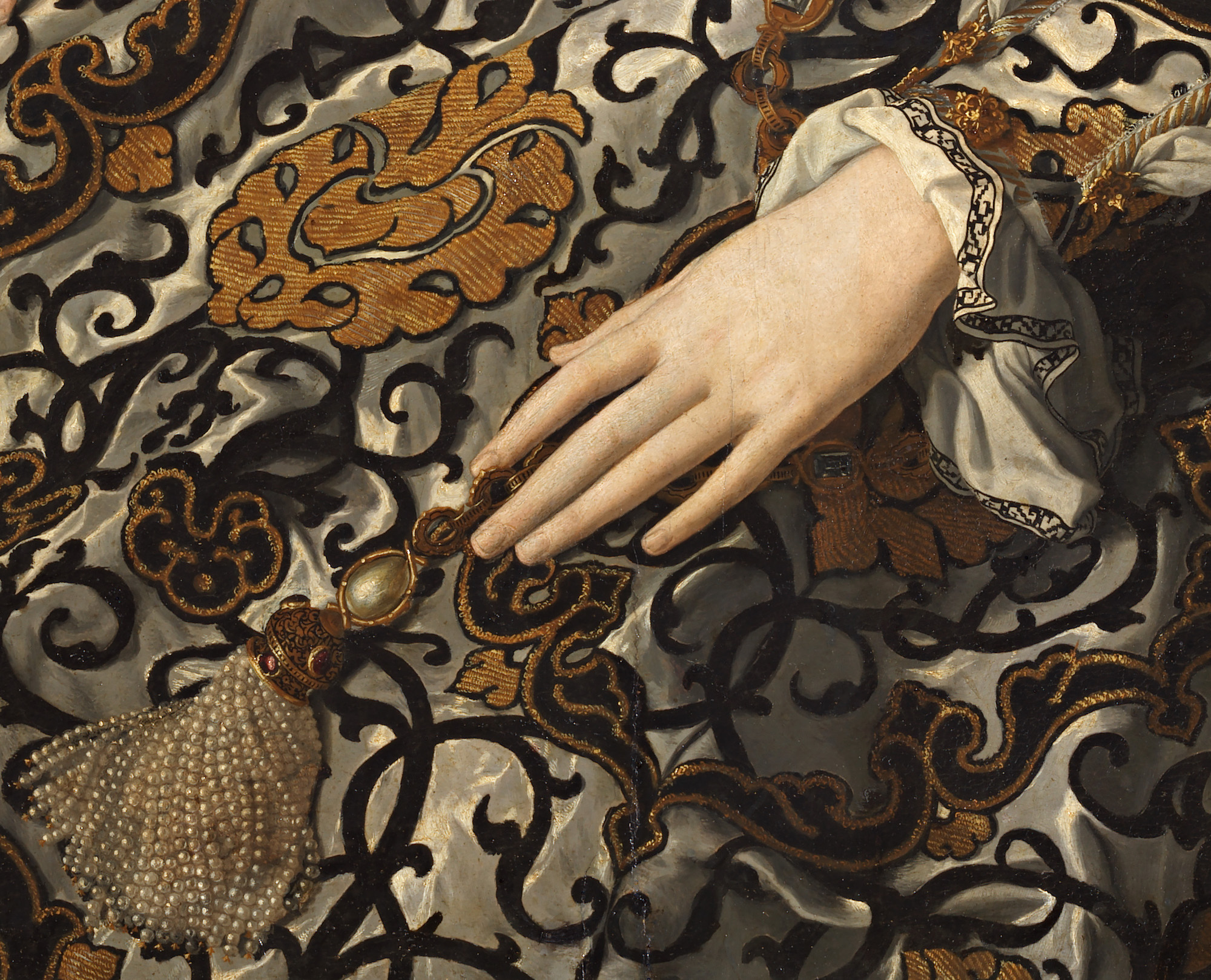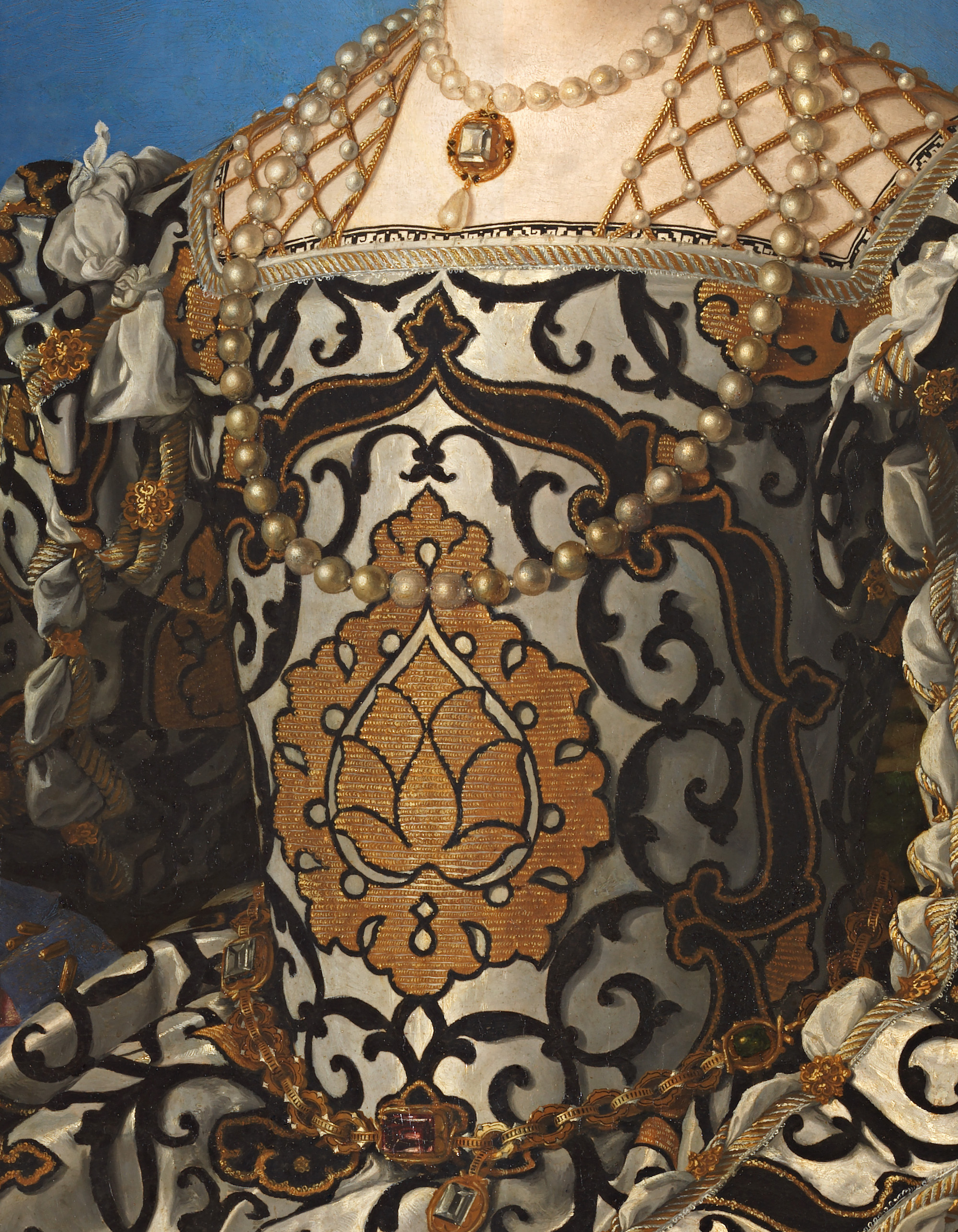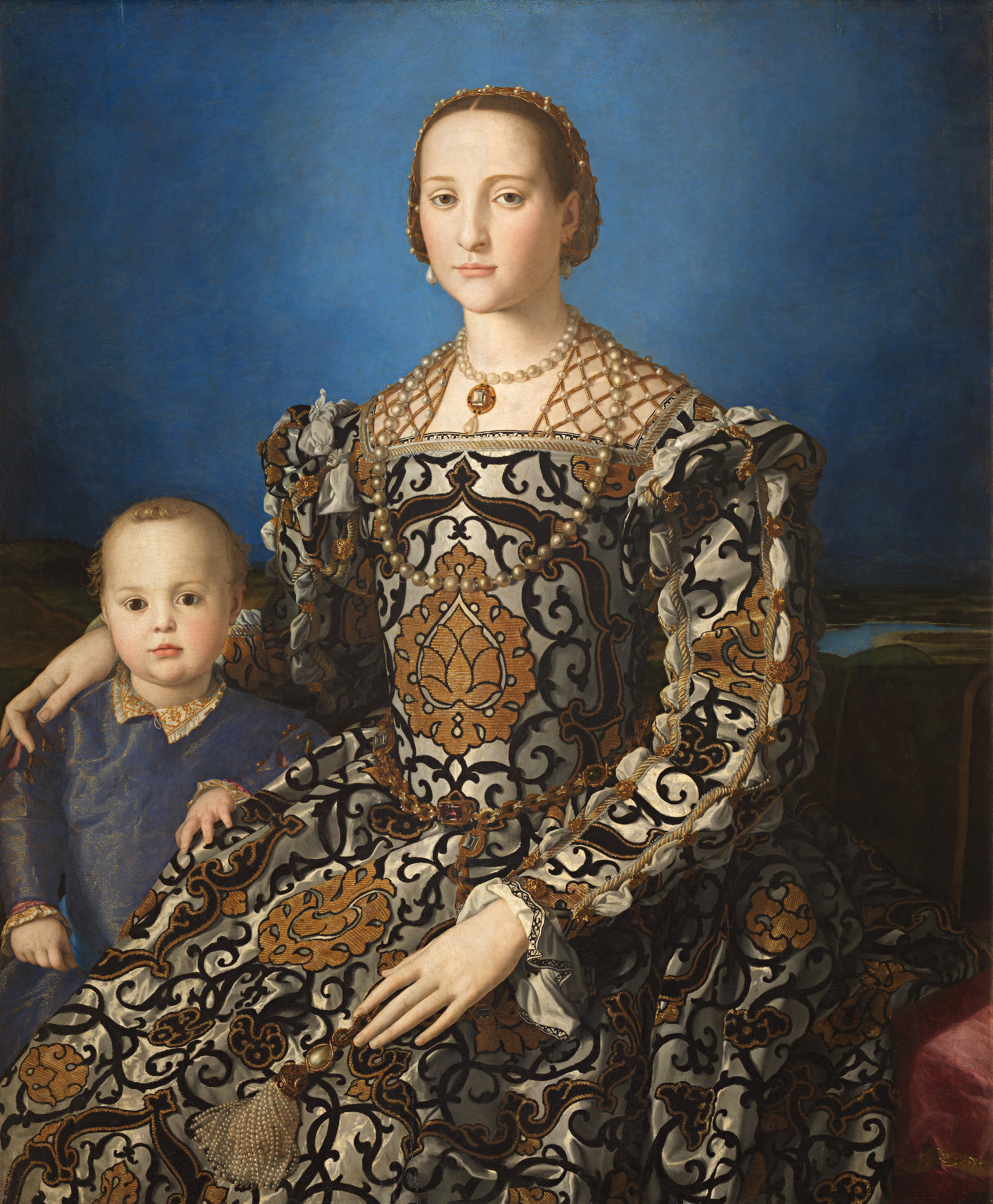 Lo spettacolare ritratto di Eleonora di Toledo assieme al secondogenito Giovanni è uno dei massimi capolavori del Bronzino, ed è l’opera che ha contribuito a consegnare all’immaginario collettivo lo splendore della sposa di Cosimo I de’ Medici. Eleonora, con la sua pelle candida, i suoi ricchi gioielli e l’abito maestoso, si staglia contro un magnetico sfondo blu che le conferisce un’aura di sacralità e dà al suo ritratto il valore di un’apparizione. L’immensa distesa di azzurro fu eseguita con il pigmento più costoso a disposizione, il blu lapislazzuli, tradizionalmente riservato nell’arte italiana al mantello della Vergine, quindi segno di devozione identificativo di Maria. Uno dei compiti di questo ritratto è sicuramente quello di esaltare il ruolo dinastico della Duchessa, garante della successione di casa Medici, rafforzata dalla nascita nel 1543 proprio di quel Giovanni che le sta a fianco, il secondo figlio maschio candidato alla carriera ecclesiastica come toccò al celebre antenato di cui portava il nome, il secondogenito del Magnifico Lorenzo, divenuto papa nel 1513. Altro elemento significativo è certamente la veste tessuta in un ‘broccato riccio’, un tessuto costosissimo, specialità della manifattura fiorentina, spesso riservato alla confezione di abiti liturgici. I motivi ripetuti nella stoffa, il melograno e la pigna, sono simboli cristiani di resurrezione e rigenerazione, adatti a indicare la fertilità della duchessa. Ma il dipinto non vuole certo restituire esclusivamente l’immagine di una buona moglie e madre cristiana. Eleonora fu donna di Stato, abile amministratrice, braccio destro del Duca. Nell’estate del 1545, mentre Bronzino ne eseguiva il ritratto, Eleonora aveva già ricoperto tre volte il ruolo di capo di Stato durante le assenze di Cosimo. Il taglio stesso del quadro, nel suo ritrarla fino alle ginocchia (ripetendo l’innovativa soluzione che Raffaello adottò per il ritratto di Leone X), conferisce imponenza e autorevolezza a questa donna il cui volto è l’emblema di uno spirito fermo e nobile. Bronzino riuscì a cogliere tutti i tratti della personalità di Eleonora e a comunicarli in uno straordinario ritratto che rappresenta una moglie e madre, ma anche una donna potente e indipendente.