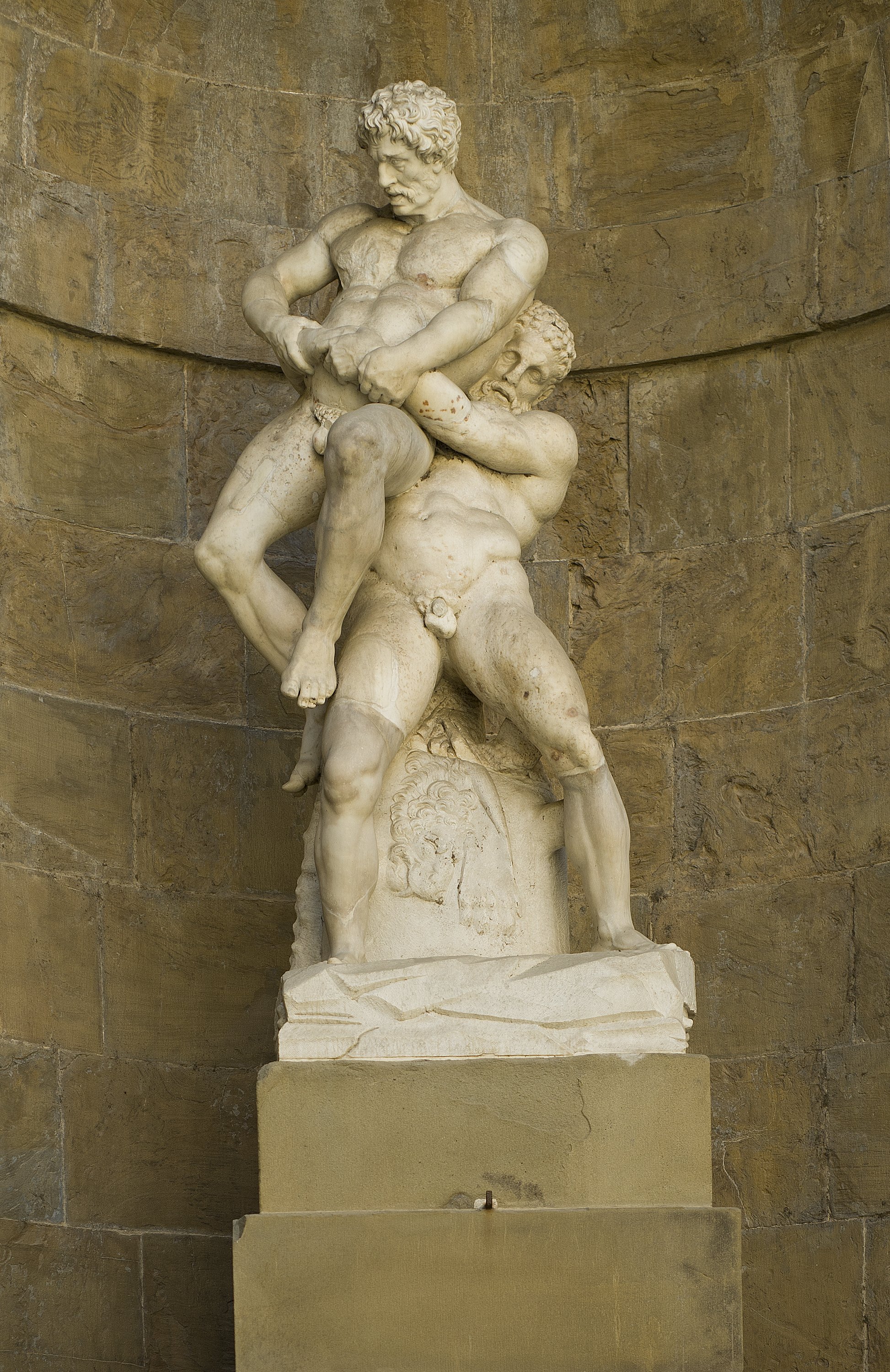 L'immagine di Ercole fu spesso utilizzata da Cosimo I de’Medici come strumento di propaganda ed eroica autorappresentazione. Il gruppo scultoreo raffigura la lotta tra l'eroe e Anteo, figlio di Gea, personificazione della Madre Terra, e di Poseidone, dio del mare. Il gigante Anteo assume nel marmo fiorentino le più comuni dimensioni dell’eroe Ercole. Re di Libia, Anteo sfidava i forestieri in combattimenti corpo a corpo dall’esito segnato: il gigante traeva la sua invincibilità da un portento, il semplice contatto con la madre Terra gli restituiva forza ed energia. Ercole avrebbe superato la prova di forza sollevando da terra il gigante, soffocato in una stretta micidiale. Lo schema iconografico della scultura fiorentina, raffigurante un combattente afferrato alle spalle dall’avversario, è diffuso nell'ambito della produzione vascolare greca a partire dalla fine del VI secolo a.C. Il motivo traeva ispirazione dalla pratica di un combattimento a mani nude, il “pancrazio”, compreso tra le discipline olimpiche già dal 648 a.C.