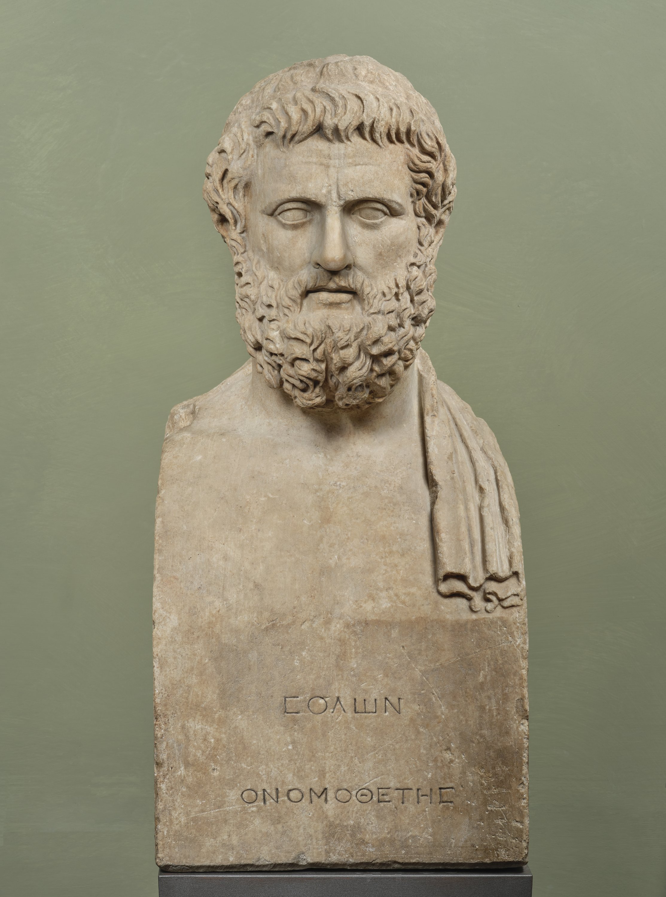 Sul lato frontale del fusto dell’erma è presente un’iscrizione in lingua greca che riporta il nome di Solone, accompagnato dalla definizione “il legislatore”. Se si accetta l’autenticità dell’iscrizione, tramite la regolarità dei caratteri è possibile datare il fusto alla fine del I secolo d.C. Riconoscendo chiaramente l’uso del trapano nella resa della barba e la presenza di alcuni ponticelli risparmiati, è possibile datare invece il ritratto all’età antonina (II secolo d.C.).