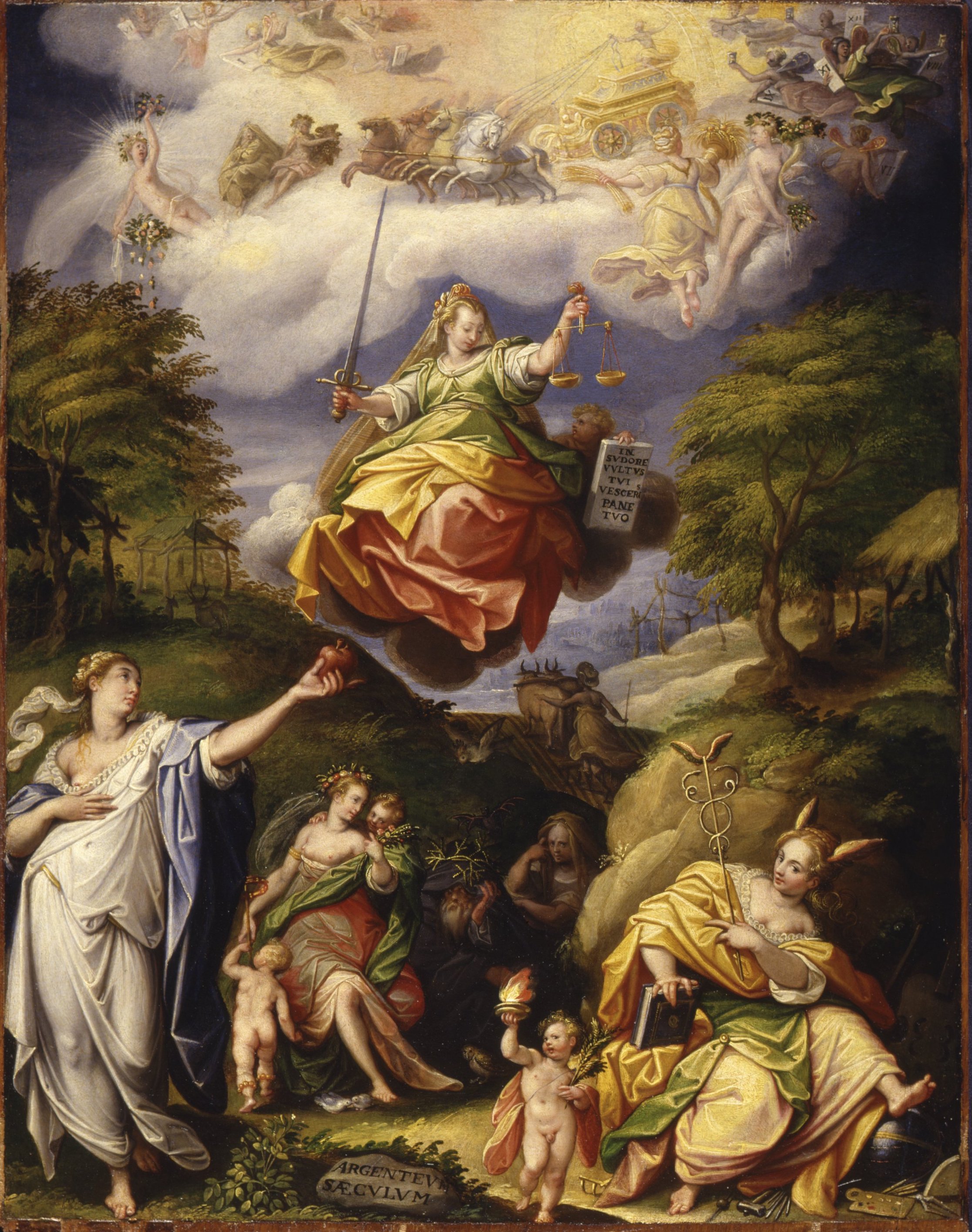 In linea con il racconto ovidiano il dipinto mostra sullo sfondo alcune rudimentali capanne e un contadino che solca un campo con l’aratro; nel cielo vola il carro di Apollo, circondato dalle ore del giorno e della notte e dalle quattro stagioni. Al centro campeggia la dea della Giustizia con la spada e la bilancia, accompagnata da un putto che mostra, iscritto su una grande tavola, un passo della Genesi (Gen 3,19) “Mangerai il pane col sudore del tuo volto”. La giovane donna seduta in primo piano sulla destra simboleggia l’Arte e la Conoscenza, mentre gli strumenti ai suoi piedi, uno scalpello, una tavolozza, un compasso e un globo, alludono alle arti meccaniche. Il rastrello, le spighe di grano e la fiaccola accesa che porta il putto accanto a lei sono gli attributi di Cerere, dea del lavoro nei campi. La figura vestita di bianco al lato opposto, che contempla adorante il cuore alzato al cielo, potrebbe essere la personificazione della Carità, mentre il gruppo composto dalla giovane fanciulla accompagnata da due putti giocosi, dal vecchio barbuto e dalla dama velata rappresenterebbe le quattro età dell’uomo. L’allegoria del dipinto dovrebbe dunque illustrare l’avvento della Giustizia divina a presiedere lo scorrere del tempo e le attività dell’uomo.