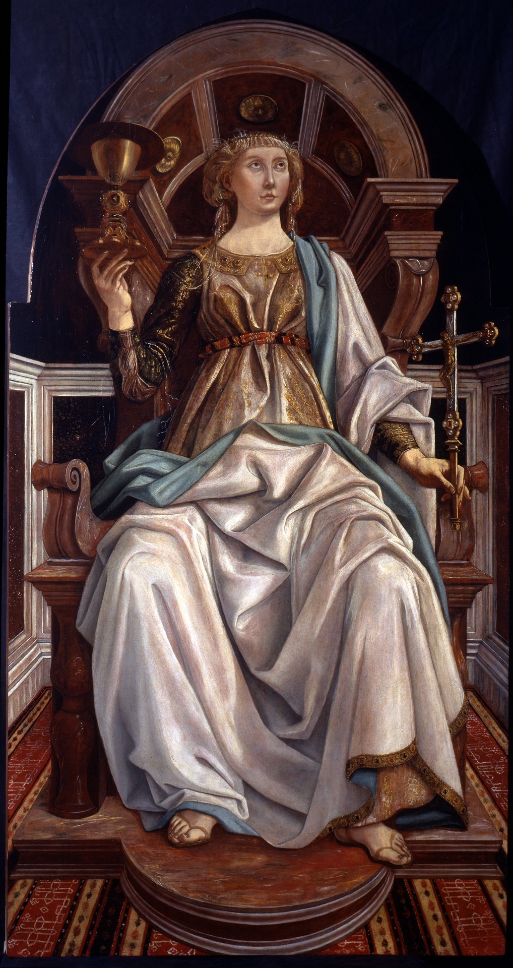 La personificazione della Fede ha le sembianze di una giovane donna colta mentre volge lo sguardo al cielo, sollevando con la mano destra il calice dell’eucarestia, coperto dalla patena, e tenendo nella sinistra una croce astile. L’opera è parte di un ciclo pittorico dedicato alle Virtù commissionato a Piero del Pollaiolo nel 1469 e destinato alla sala dell’Udienza nel Tribunale di Mercanzia in piazza della Signoria a Firenze. La tavola, insieme a quella con la Temperanza, venne eseguita entro l’estate del 1470, in parziale ottemperanza al contratto che imponeva al pittore di fornire due tavole con le Virtù ogni tre mesi, a partire dal 1 gennaio 1470, dietro un compenso di 20 fiorini per ciascun dipinto. Al Gabinetto Disegni e Stampe degli Uffizi si conserva il cartone perforato impiegato dal maestro per riportare sulla tavola il disegno della testa della Virtù (inv. 14506 F).
