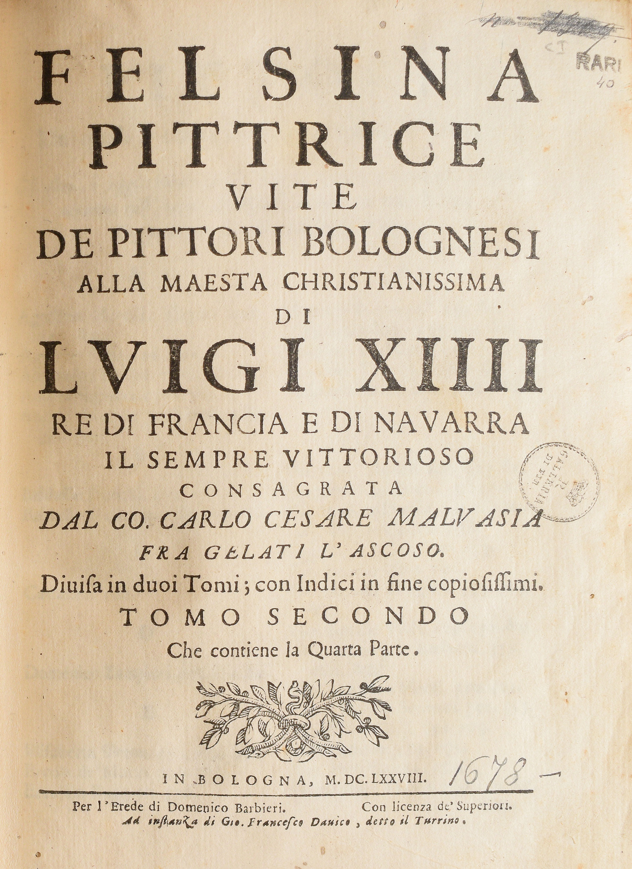 Per garantire la diffusione dell’opera anche in ambito internazionale, l’ambizioso conte Malvasia dedicò la Felsina Pittrice a Luigi XIV, inviandone subito una copia a Parigi, presso la corte del re Sole, ed una presso l’ambasciatore francese a Roma.