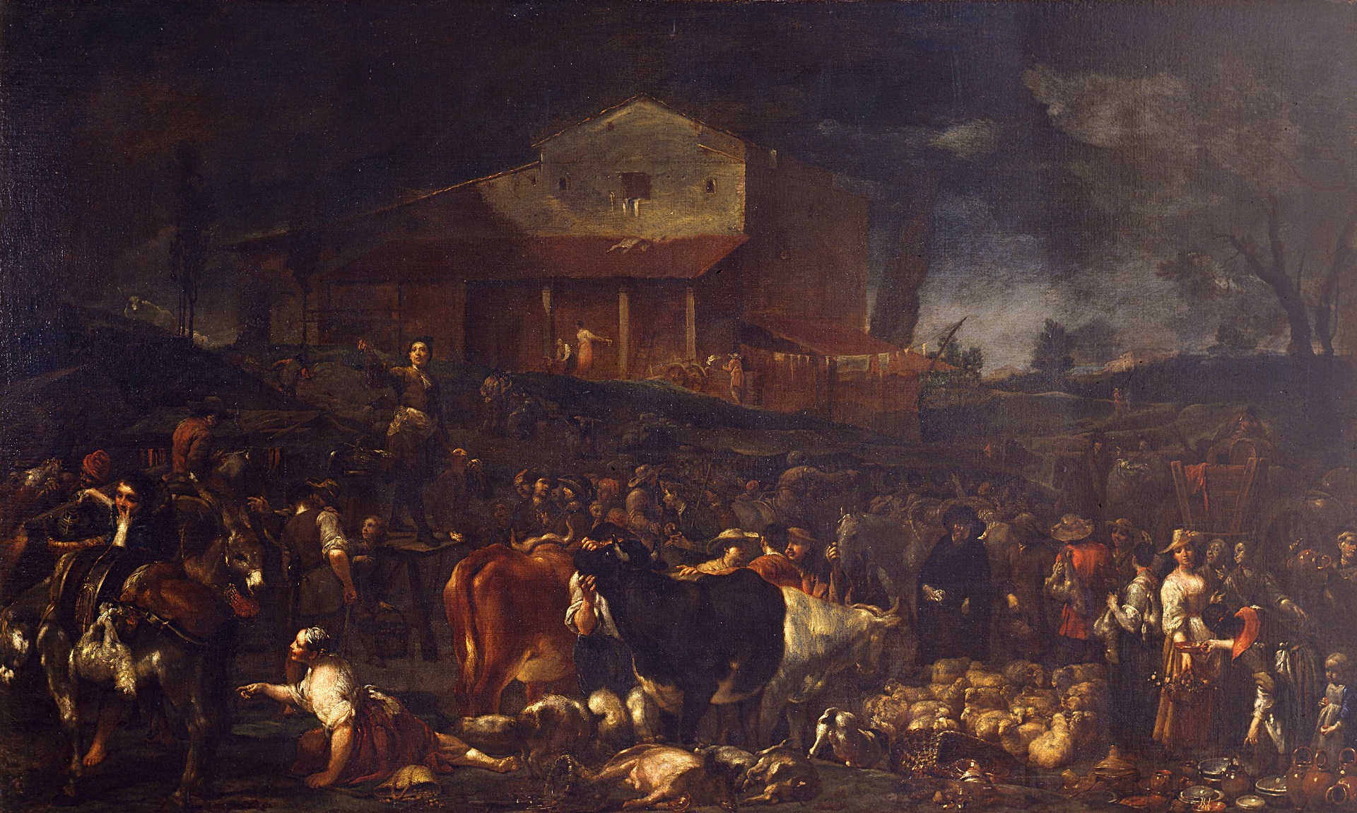 È giorno di fiera sulla collina di Poggio a Caiano e tra i mercanti di bestiame e i venditori di terraglie si aggira affaccendato in valutazioni, acquisti e trattative un popolo di villani. Sulla folla indistinta si erge un personaggio, in piedi su un tavolato da saltimbanco, che mostra al pubblico con ostentazione un dente appena estratto; sulla destra compare un uomo di chiesa in abito nero, la guancia gonfia e il fazzoletto bianco in mano, simile nella cromia alla mucca pezzata, collocata al centro in primo piano, alla quale un contadino vuole esaminare il morso. Secondo le fonti antiche molti contemporanei si riconobbero nel dipinto, apparentemente solo una scena di genere vicina alla pittura olandese o fiamminga molto apprezzata a corte, ma che in realtà rappresenta anche un ritratto in burla del popolano Antonio Morosini detto “lo Scema” che si finge cavadenti ai danni del pievano di Poggio. L’inquadratura è teatrale, impostata sulla diagonale tipica delle scenografie barocche, con l’architettura di campagna tracciata veloce, in colori liquidi, come su un tendone da fondale, mentre la luce, a sprazzi, si concentra solo su alcune figure e dettagli.