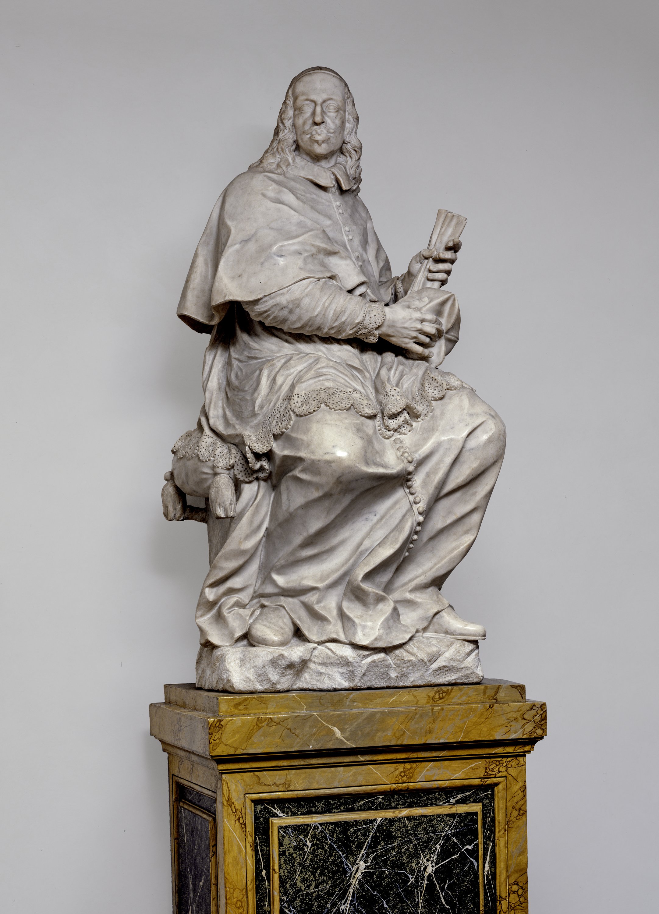 Il marmo ritrae Leopoldo de’ Medici (1617-1675) in abito cardinalizio, seduto su un seggio imbottito mentre tiene un documento tra le mani. L’opera è caratterizzata da una vigorosa torsione del corpo e da un’accurata resa dei dettagli dell’abito cardinalizio. Lo scultore sembra sfidare la durezza del marmo, grazie ad un’esecuzione realistica dei minimi particolari, come le trine che adornano il talare, i lunghi capelli inanellati che ne incorniciano il volto, con perfetto equilibrio tra la dolcezza del modellato, evidente per esempio nei lunghi favoriti, la resa accurata dei dettagli somatici e idealizzazione aulica, peraltro coerente con la raffinata personalità del personaggio rappresentato, celebrato come il “Principe dei collezionisti”. Figlio di Cosimo II de’ Medici e Maria Maddalena d’Austria, il cardinale fu personaggio di vasta cultura, grande collezionista e amante dell’arte, ma anche promotore di studi scientifici. A lui si devono l’acquisto di un ingente numero di opere, molte delle quali tuttora esposte agli Uffizi, ma soprattutto l’avvio della celebre collezione di autoritratti. La scultura fu commissionata da Cosimo III, nipote di Leopoldo, che volle dare rilievo agli autoritratti ereditati dallo zio esponendoli in un’apposita sala della Galleria. L’ambiente, noto come Sala degli Autoritratti, aveva il soffitto decorato da Pier Dandini con l’Allegoria della Toscana incoronata dalla Virtù e accompagnata dalle Arti e dalle Scienze. Come sommo omaggio a Leopoldo, al centro della sala, Cosimo III fece costruire dallo stesso Giovan Battista Foggini una tribuna, riccamente decorata in marmi policromi, destinata ad accogliere l’effigie dello zio. La tribuna, che si trovava nel corridoio di Ponente degli Uffizi in corrispondenza di quella più nota del Buontalenti nell’ala opposta dell’edificio, venne completata nel 1707, e negli anni seguenti fu descritta con grande ammirazione da molti visitatori. Della Sala e della tribuna, successivamente smantellate, rimane testimonianza in quattro disegni ora conservati presso la Österreichische Nationalbibliothek di Vienna. Una versione preliminare in terracotta della statua del cardinale è invece conservata al Skulpturensammlung und Museum für Byzantinische Kunst di Berlino (inv. n. 2163). La carriera di Giovan Battista Foggini, uno dei massimi scultori barocchi a Firenze, ricevette grande sostegno sia da parte di Cosimo III de’ Medici che del figlio il Gran Principe Ferdinando, dato che entrambi gli affidarono commissioni di prestigio sia scultoree che disegni per i preziosi manufatti in pietre dure poi realizzati dalla Galleria dei Lavori.