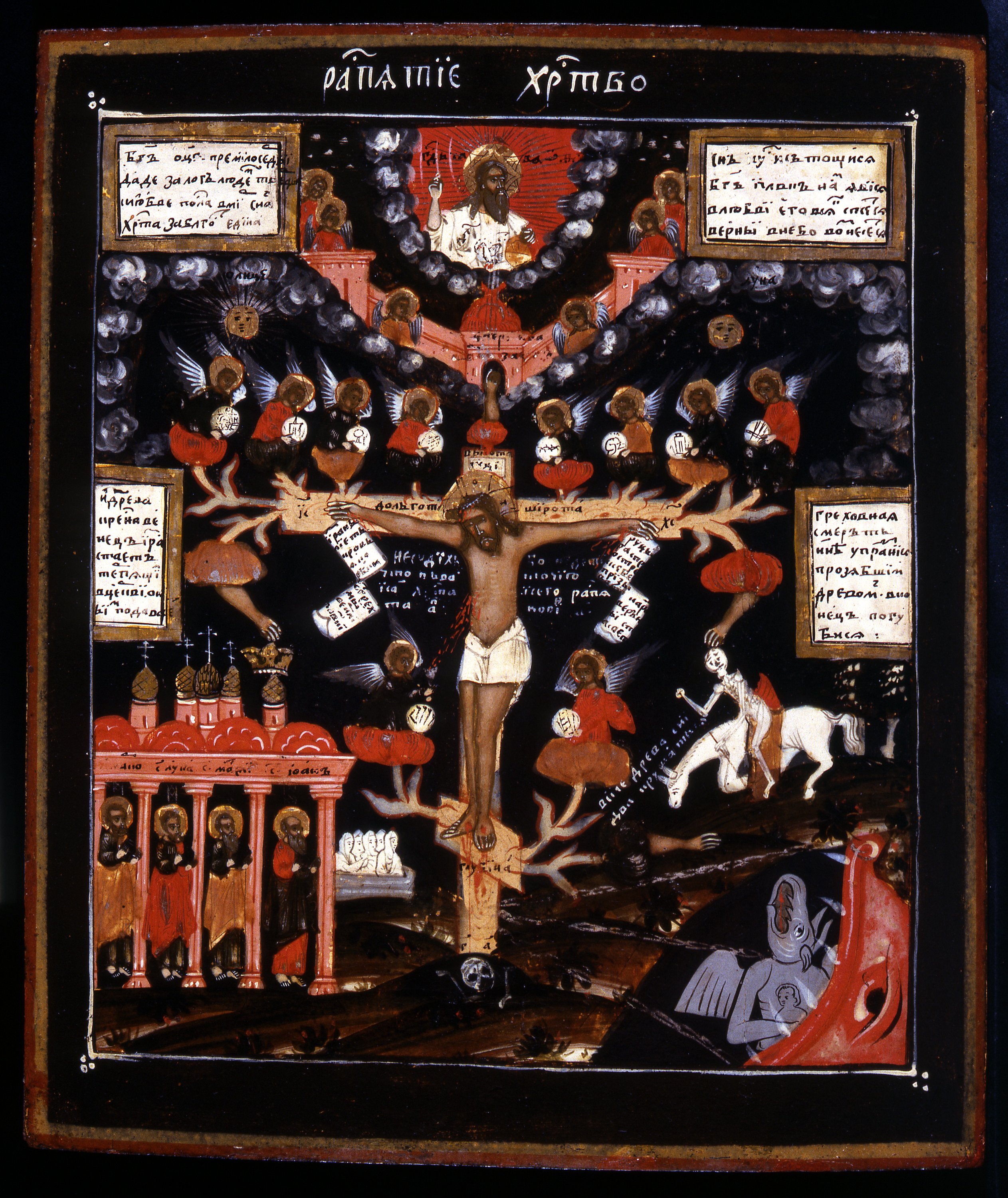 L’icona, accompagnata da iscrizioni che illustrano ogni dettaglio, celebra il sacrificio di Cristo e in contrapposizione,la forza vittoriosa sul demonio, sulla morte e sul peccato. Sembra dunque essere la trasposizione visiva di un sermone rivolto ai fedeli.