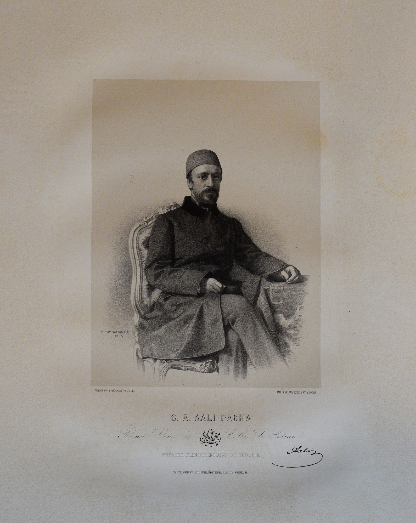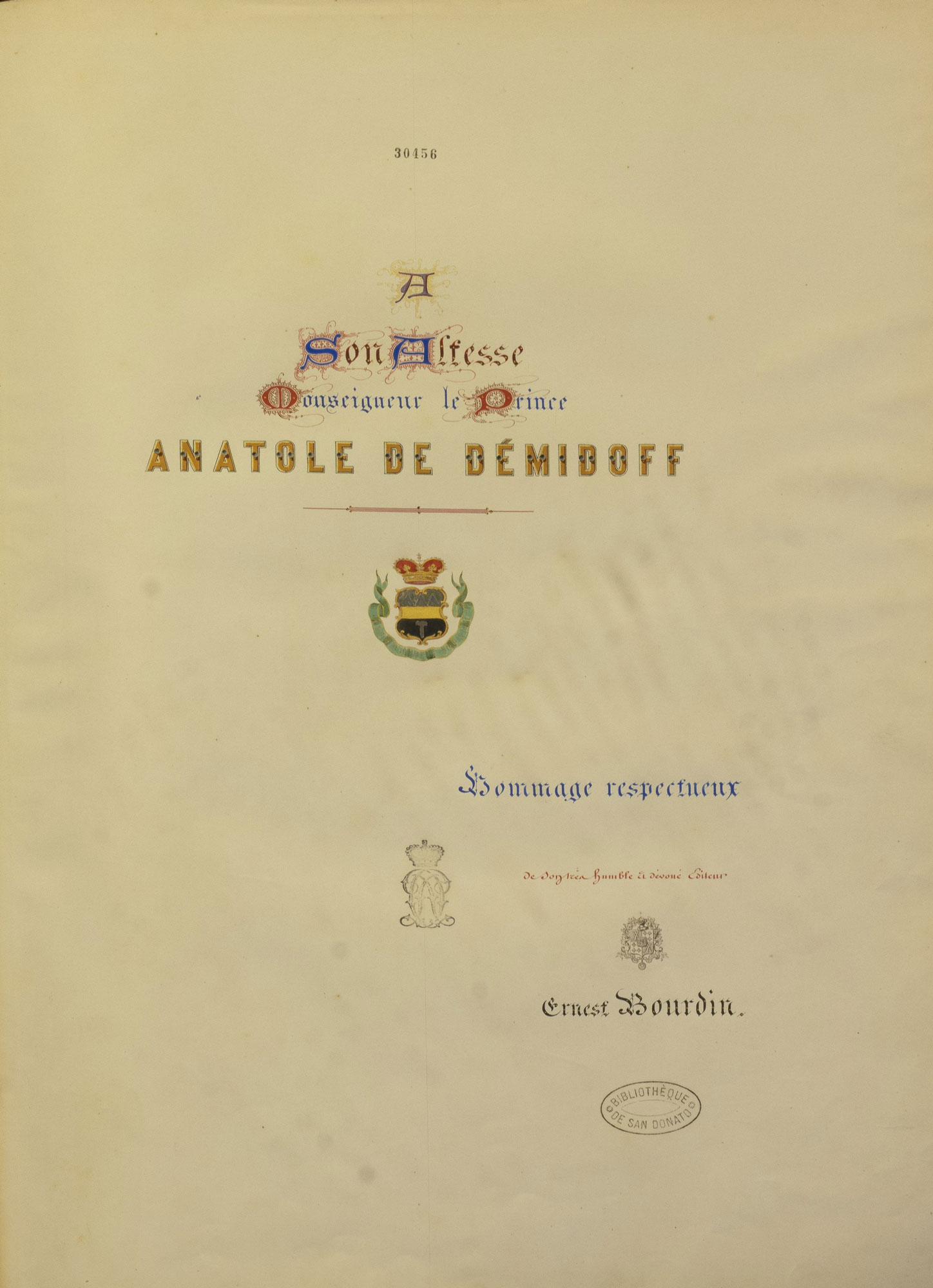 L’album che qui si presenta proviene dalla biblioteca della Villa di San Donato, oggi scomparsa, che la famiglia Demidov possedeva a Firenze. Il volume è infatti contrassegnato sia dal timbro di provenienza con la scritta “Bibliothèque de San Donato”, sia dal monogramma cifrato “AD” di Anatolij Demidov sormontato da corona ed è sfarzosamente rivestito in pelle e seta verde brillante, lo stesso colore della malachite estratta dalle miniere di famiglia. Sul contropiatto spicca un’etichetta, elegantemente incorniciata, recante la sigla “OP1”, probabile traccia di un’antica collocazione dell’esemplare nella biblioteca della Villa. La Galerie des plénipotentiaires au Congrès de Paris è un album con i ritratti fotografici e la riproduzione delle firme dei delegati al Congresso di Parigi del 1856 - fra i quali figura anche Camillo Benso Conte di Cavour come delegato del Regno di Sardegna - fondamentale la firma di un trattato di pace che ristabilisse gli equilibri geopolitici fra l’Impero russo, le potenze europee e l’Impero Ottomano dopo la terribile guerra di Crimea (1854-1856). La ‘Galerie’ fu donata a “Son Altesse, Monseigneur, le Prince Anatole de Demidoff” dall’editore Bourdin di Parigi, presso il quale Anatolij aveva pubblicato, circa vent’anni prima, il suo Voyage dans la Russie Méridionale et la Crimée, resoconto della spedizione intrapresa in quei luoghi dal principe russo nel 1837.