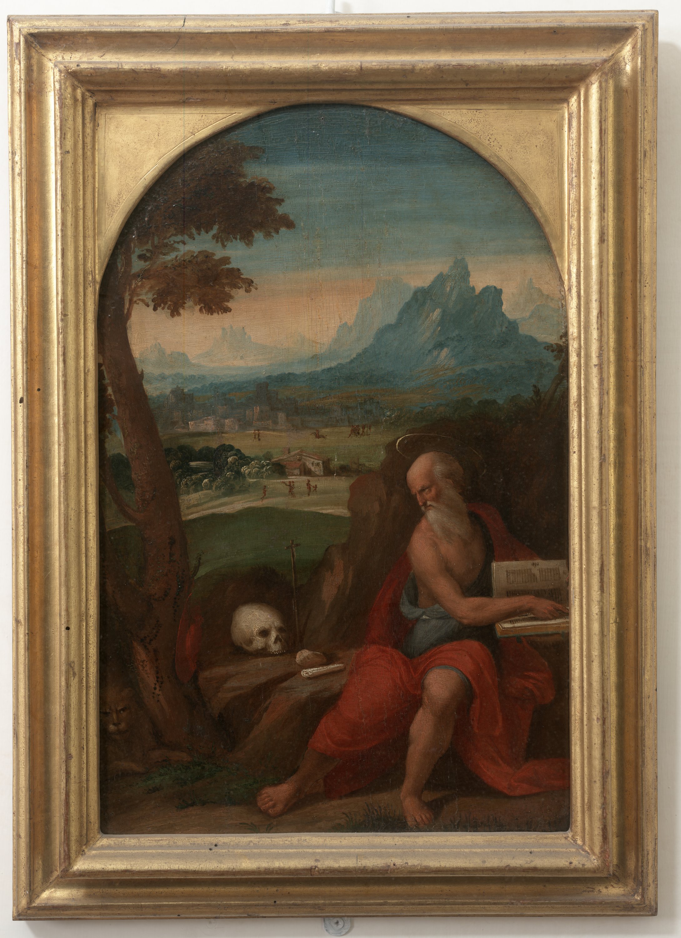 La slanciata e sinuosa figura dell’albero sulla sinistra richiama una natura benigna che offre riparo al leone e possibilità di vita all’edera. Il suo legno inoltre è simbolo della croce di Cristo: sotto le fronde si snoda la diagonale che congiunge e lega gli sguardi di San Girolamo e del leone, passando per il nudo teschio bianco, rimando simbolico alla fragilità dell’esistenza umana. Equilibrio e armonia del creato trovano così una ricomposizione ai piedi dell’albero-croce. Attribuita a Garofalo solo a metà Novecento, la tavola trova termini di confronto in altri due dipinti dell’artista che raffigurano lo stesso soggetto: uno conservato in Collezione Kress [New Orleans, Isaac Delgado Museum of Art, Kress collection, K. 1111] e il più noto San Girolamo della Gemäldegalerie di Berlino [Staatliche Museen zu Berlin,Gemäldegalerie, inv. 243].