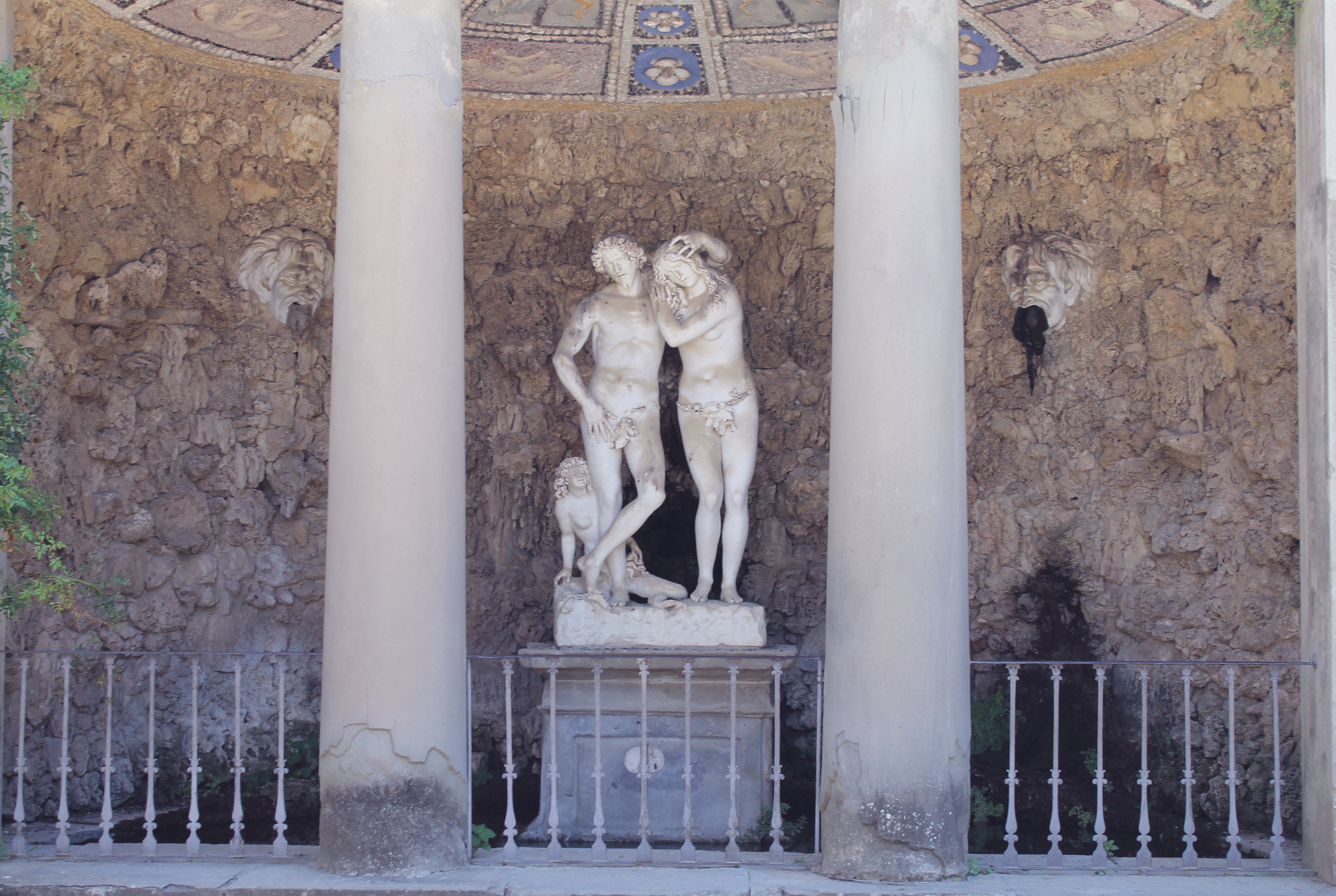 La realizzazione della Grotta, collocata in asse prospettico con il cancello di entrata, e la sistemazione di tutta l’area circostante si devono a Giuseppe Cacialli. Essa presenta un’apertura rettangolare suddivisa in tre spazi da due colonne doriche. All’interno della vasca si trova un basamento rettangolare su cui poggia il gruppo di Adamo ed Eva. Nella parete interna, a finta roccia, sono inseriti tre mascheroni, opera di Ottaviano Giovannoni. La cupola semisferica presenta decorazioni a grottesche e conchiglie inserite in riquadri geometrici.