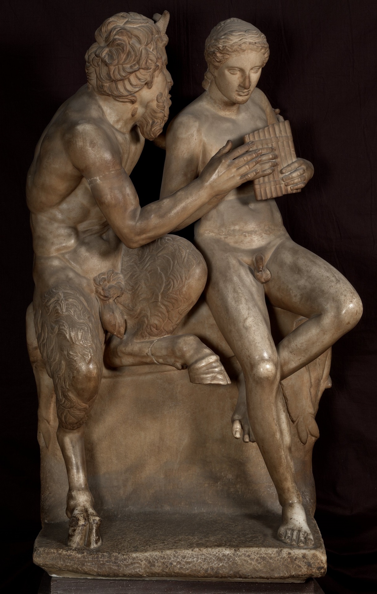 Le vicende collezionistiche di questo gruppo scultoreo risultano alquanto oscure: non si conosce infatti il luogo di rinvenimento dell’opera, presente a Villa Medici a Roma fin dal 1722, e trasportata a Firenze nel 1787. La coppia di figure rappresenta il dio Pan, dai tratti caprini, seduto al fianco del pastore Dafni, intento a suonare la siringa (syrinx). Dafni, figlio di Hermes e della ninfa Dafnide, incarna, nel mito greco, l’ideale dell’eromenos, il fanciullo di ineguagliabile bellezza capace di affascinare ogni uomo o divinità. Oltre ad Apollo, Dafni fu suo amante anche Pan che, in questo gruppo, cinge il giovane con il braccio sinistro, mentre con quello destro sembra guidarlo nell’utilizzo dello strumento. Nella figura di Pan risultano di integrazione la zampa sinistra, le corna ed entrambe le braccia, mentre nel Dafni si segnalano il braccio sinistro con la siringa, la mano destra e alcune parti della testa. Dalle fonti letterarie e dai ritrovamenti archeologici sono note diverse repliche di questo gruppo, il cui originale era forse ascrivibile al tardo ellenismo. Il carattere erotico, tuttavia, lascia qui spazio a una serie più complessa di rimandi, fra cui trovano spazio il tema della natura, della poesia bucolica e della morte tragica.