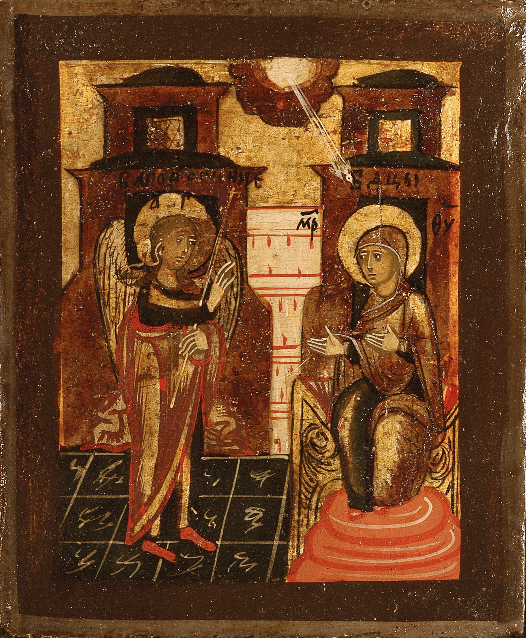 Maria riceve l’annuncio del concepimento del Figlio di Dio dall’arcangelo Gabriele seduta su un trono dorato provvisto di un’alta pedana rossa, arredo che sottolinea la dignità regale della Vergine. Un filo bianco passa sopra la mano destra della Madre di Dio, forse in riferimento al racconto dei Vangeli apocrifi secondo i quali Maria era intenta a filare quando ricevette la visita dell’angelo. Gabriele tende la mano destra verso di lei in atto benedicente, mentre con la sinistra regge lo scettro che lo connota come messaggero celeste. In alto, da una cortina di nubi, discende sulla Vergine lo Spirito Santo in forma di colomba. Fanno da sfondo alla scena due alti edifici racchiusi da una cinta muraria, forse in riferimento alla Gerusalemme celeste e alla glorificazione della Madre di Dio come “Tempio spirituale” in cui dimora il Salvatore.