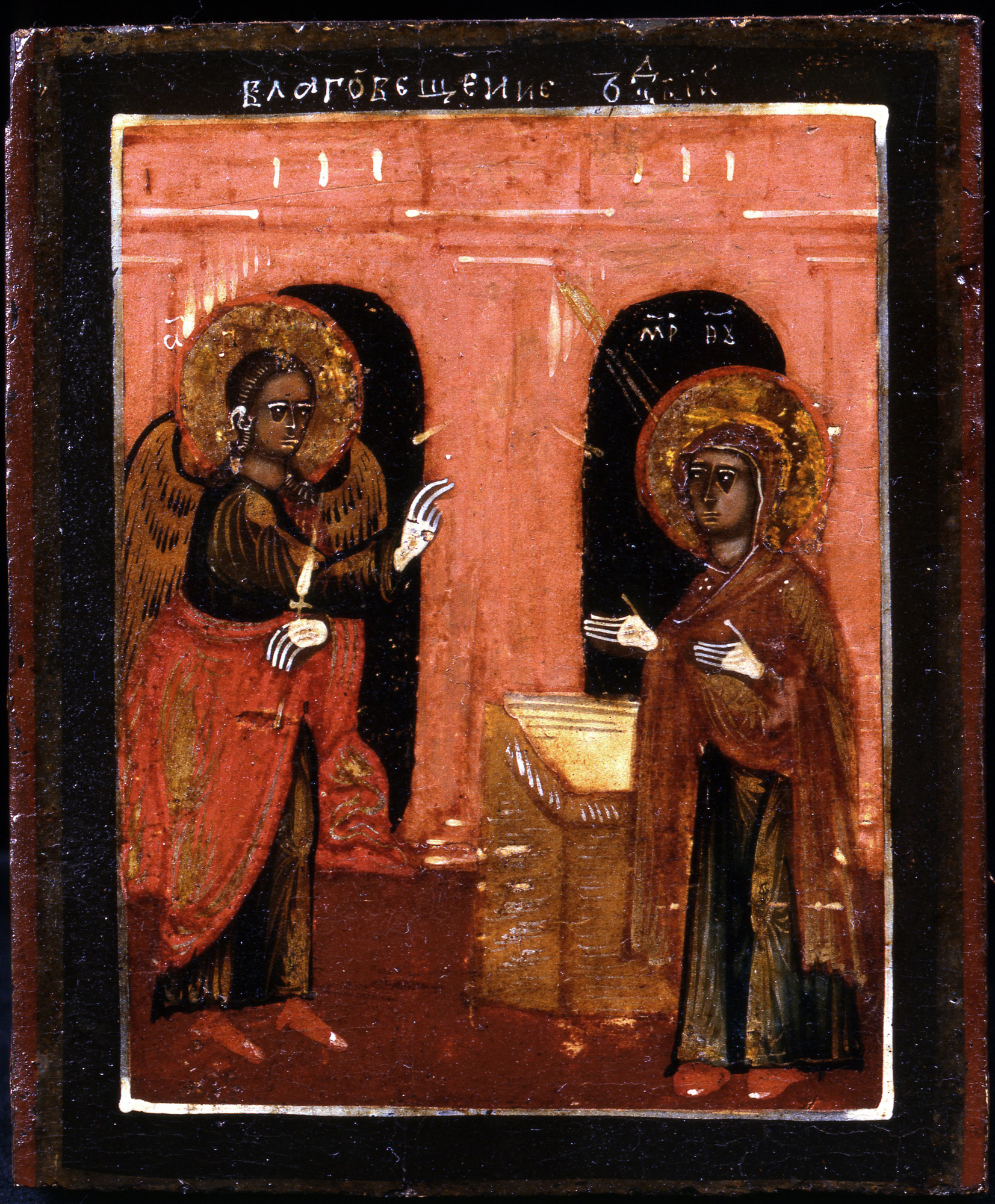 L’arcangelo Gabriele si rivolge alla Vergine Maria compiendo con la mano destra un gesto di benedizione, mentre nella sinistra regge uno scettro a forma di croce. Maria risponde all’annuncio del concepimento del Figlio di Dio portato dal messaggero celeste e sta in piedi davanti a un trono, la cui forma ricorda quella di un altare. Sopra il nimbo, è apposta l’iscrizione “MP ΘY”, monogramma della Madre di Dio. Dall’alto scendono su di lei tre raggi dorati, simbolo dello Spirito Santo.