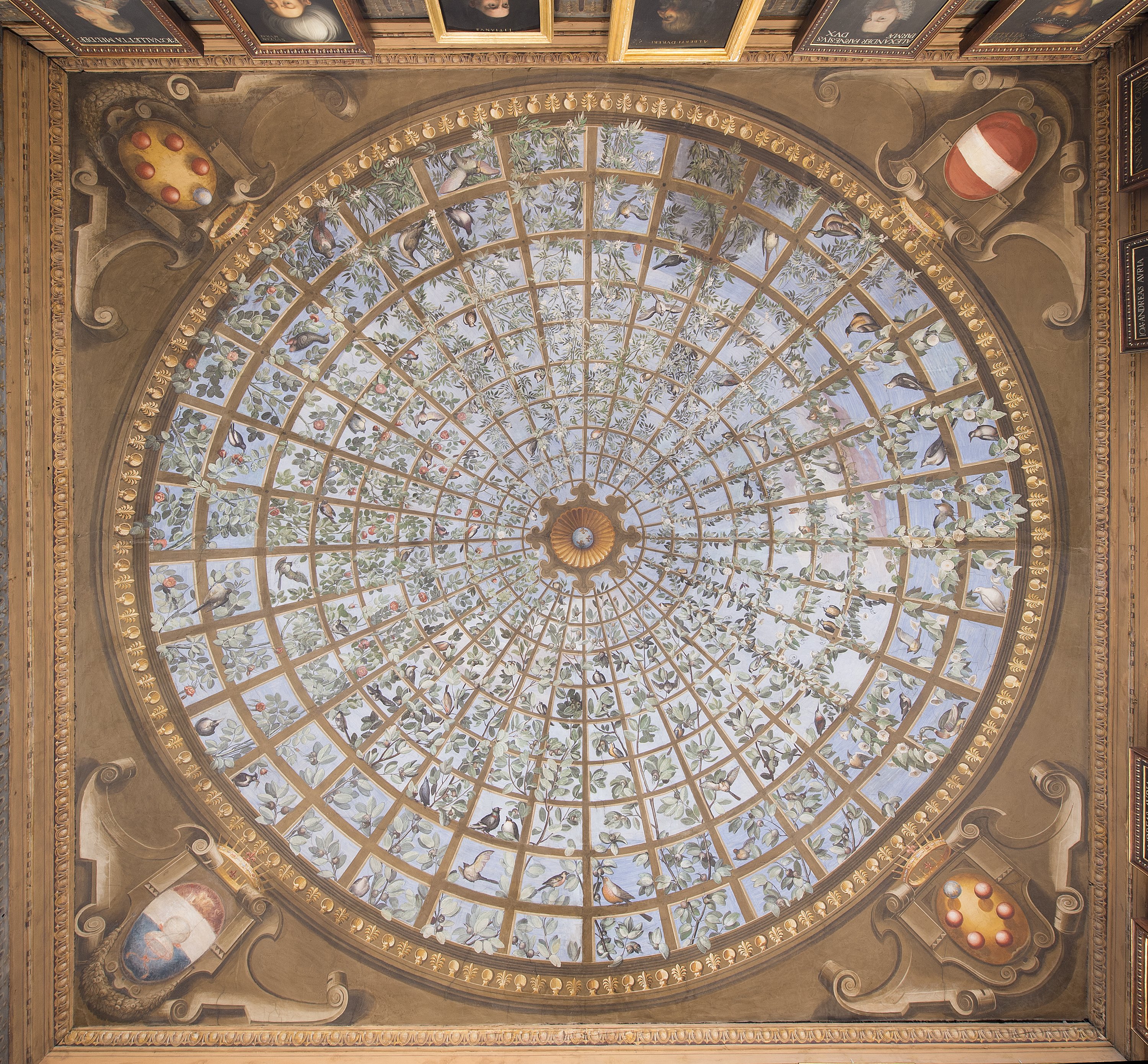 Il secondo corridoio, il più corto, che affaccia sul fiume Arno e Ponte Vecchio, fu invero l’ultimo dei tre ad essere decorato, per volere del Granduca Cosimo III de’ Medici che tra il 1696 e il 1699 incaricò i pittori Giuseppe Nicola Nasini, Tommaso Nasini e Giuseppe Tonelli di realizzare un apparato iconografico in continuità con quello del terzo corridoio, terminato nella seconda metà del Seicento, secondo uno schema che a sua volta presenta notevoli differenze rispetto a quello più antico del primo corridoio. Nei soffitti del secondo, infatti, prevale evidentemente il carattere didattico-celebrativo declinato tuttavia secondo un linguaggio radicalmente diverso da quello cinquecentesco: viene definitivamente abbandonato il genere “a grottesca” per lasciare spazio ai soggetti religiosi, con la celebrazione dei santi fiorentini e, più in generale, dei campioni toscani di fede e rigore morale che culminano con la glorificazione dei Granduchi di Toscana personificati come Virtù.