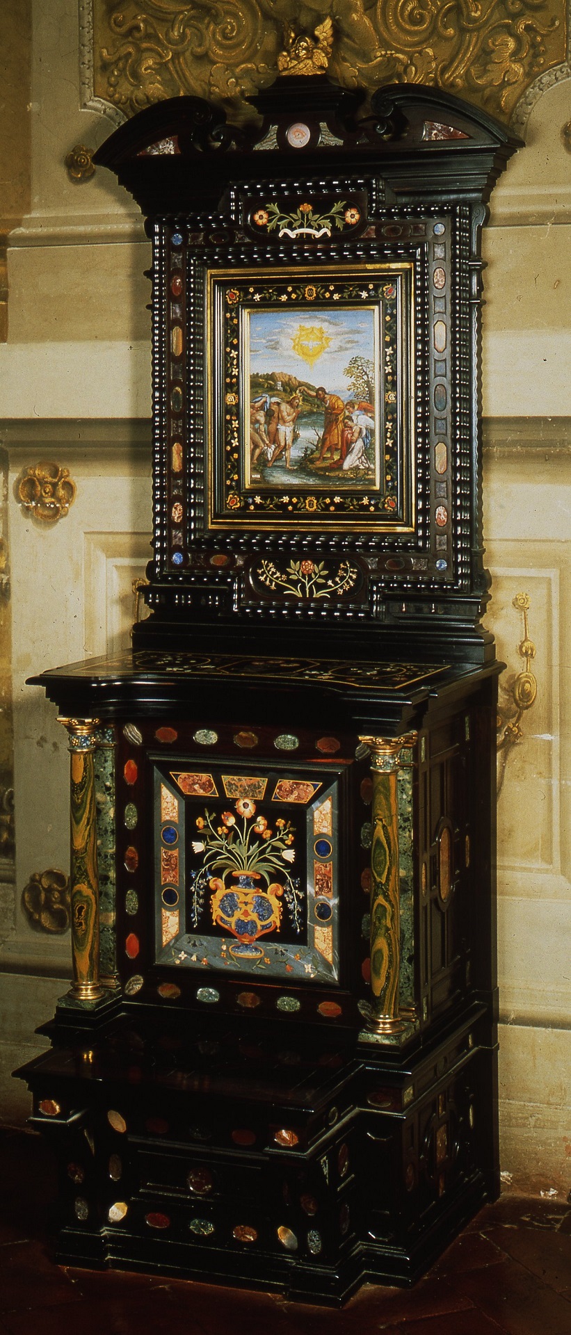 L’opera proviene dagli appartamenti della granduchessa Maria Maddalena d’Austria presso la villa del Poggio Imperiale, e più precisamente dalla sua camera da letto al piano terreno. I documenti di archivio testimoniano che il mobile in origine terminava al suo vertice con un prezioso reliquiario, oggi perduto, fissato alla testa di cherubino in bronzo dorato ancora presente nel timpano. Inoltre al posto del pannello a mosaico l’arredo presentava un dipinto su tavola raffigurante la Maddalena, ritenuto all’epoca di Leonardo da Vinci. Il quadro, ancora inserito nel mobile nel 1654, è stato identificato con la Santa Maria Maddalena del pittore fiorentino Francesco di Ubertino Verdi, detto il Bachiacca, conservata presso la Galleria Palatina di Palazzo Pitti.