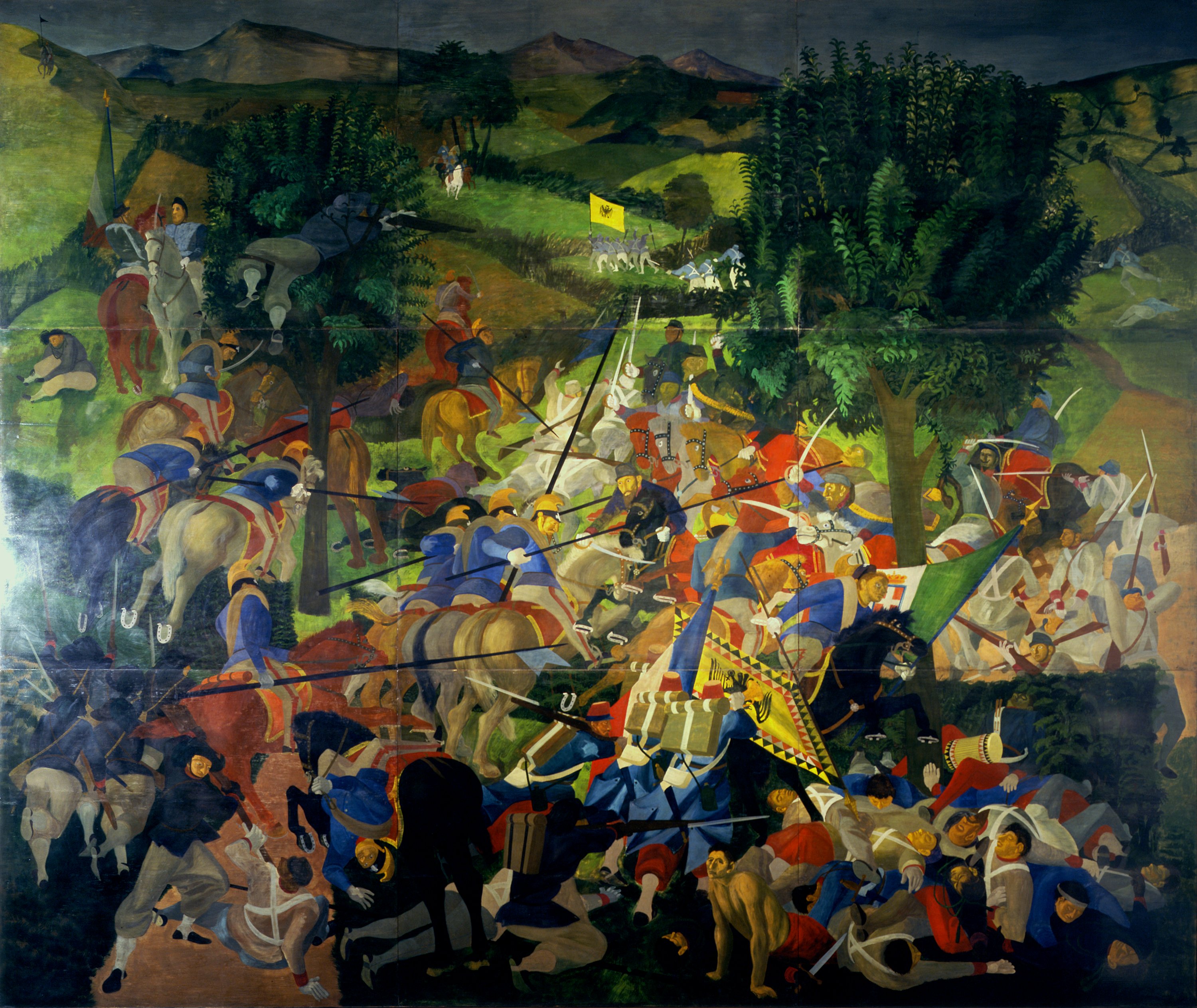 Nel 1936, in piena epoca fascista, Corrado Cagli dipinge nel suo studio romano 9 pannelli con grande velocità, come richiesto dalla tecnica pittorica scelta, la tempera a encausto dalla rapida asciugatura. I pannelli sono quindi assemblati a Milano, con l’aiuto dell’amico scultore Mirko Basaldella, sulla parte di fondo della Sala delle Priorità Italiche progettata dallo studio BBPR per il Palazzo dell’Arte, sede della VI Triennale Internazionale. Il Direttorio della Triennale aveva richiesto un tema di storia patria: grazie alla mediazione di Sironi, Cagli ottiene di poter lavorare all’opera senza sottoporre al Direttorio alcun bozzetto, mettendosi dunque al riparo da interventi censori. Ecco quindi che la battaglia risorgimentale si offre quale tema ideale per la celebrazione di alti valori morali e civili: “Scelsi deliberatamente un tema legato alla storia del Risorgimento italiano […]: era una specie di antidoto al veleno della retorica fascista” (Cagli, 1967).