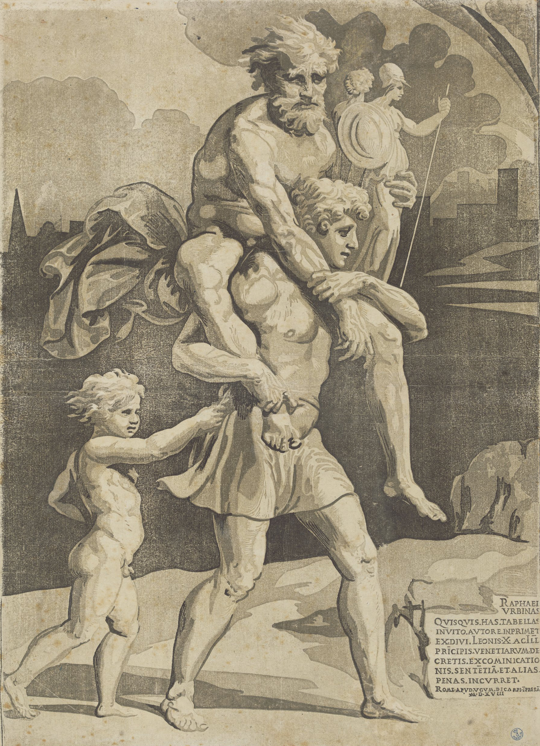Per dimensione, impegno tecnico e dichiarata autografia, questa grande stampa, menzionata già da Vasari, costituisce una sorta di manifesto con cui Ugo da Carpi rivendicava l’invenzione della nuova tecnica del chiaroscuro xilografico, a imitazione degli effetti del disegno. Il gruppo di figure trae ispirazione da un celebre brano raffigurato nell’affresco con l’Incendio di Borgo, eseguito da Raffaello e allievi tra 1514 e 1517 nelle Stanze Vaticane. Il grande formato accentua qui l’effetto monumentale delle figure, alle quali la cromia degli inchiostri, nella graduale tonalità dei grigi-bruni, conferisce l’aspetto più di statue che di figure dipinte. Da questa stampa, datata al 1518, tra le prime realizzate da Ugo da Carpi a Roma e da subito divenuta assai celebre, l’incisore noto come il ‘Maestro B del Dado’ trasse una copia in controparte a bulino, a testimoniare una fortuna del soggetto che ebbe poi ulteriore, vasto influsso e derivazioni in varie tecniche e media.