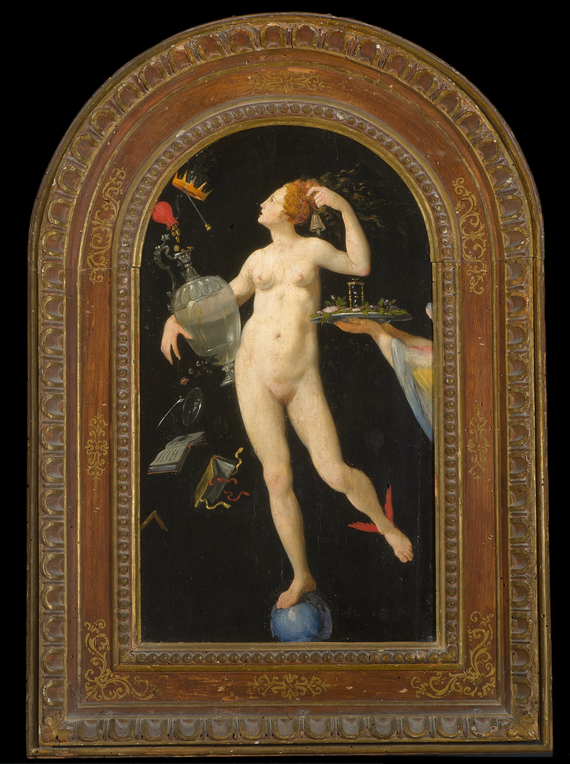 La tavoletta, in origine lo sportello di un mobile o il retro di uno specchio, raffigura la dea Fortuna corredata di tutti i suoi attributi. La dea è rappresentata in equilibrio su un globo terrestre, simbolo dell’instabilità che la caratterizza. Le ali rosse al piede sinistro indicano la sua fuggevolezza. Alla sua destra cadono una corona con uno scettro, un calamaio, due libri e un regolo, tutti simboli di poteri e mestieri terreni soggetti alla volubilità della dea. Le monete che scivolano nel vaso da un borsellino e ne escono trasformate in farfalle rappresentano la fugacità della ricchezza. Una figura alata, possibile raffigurazione del Tempo o della Morte, porge alla Fortuna un vassoio con una clessidra e dei fiori, memento del tempo che scorre e della transitorietà delle cose terrene.