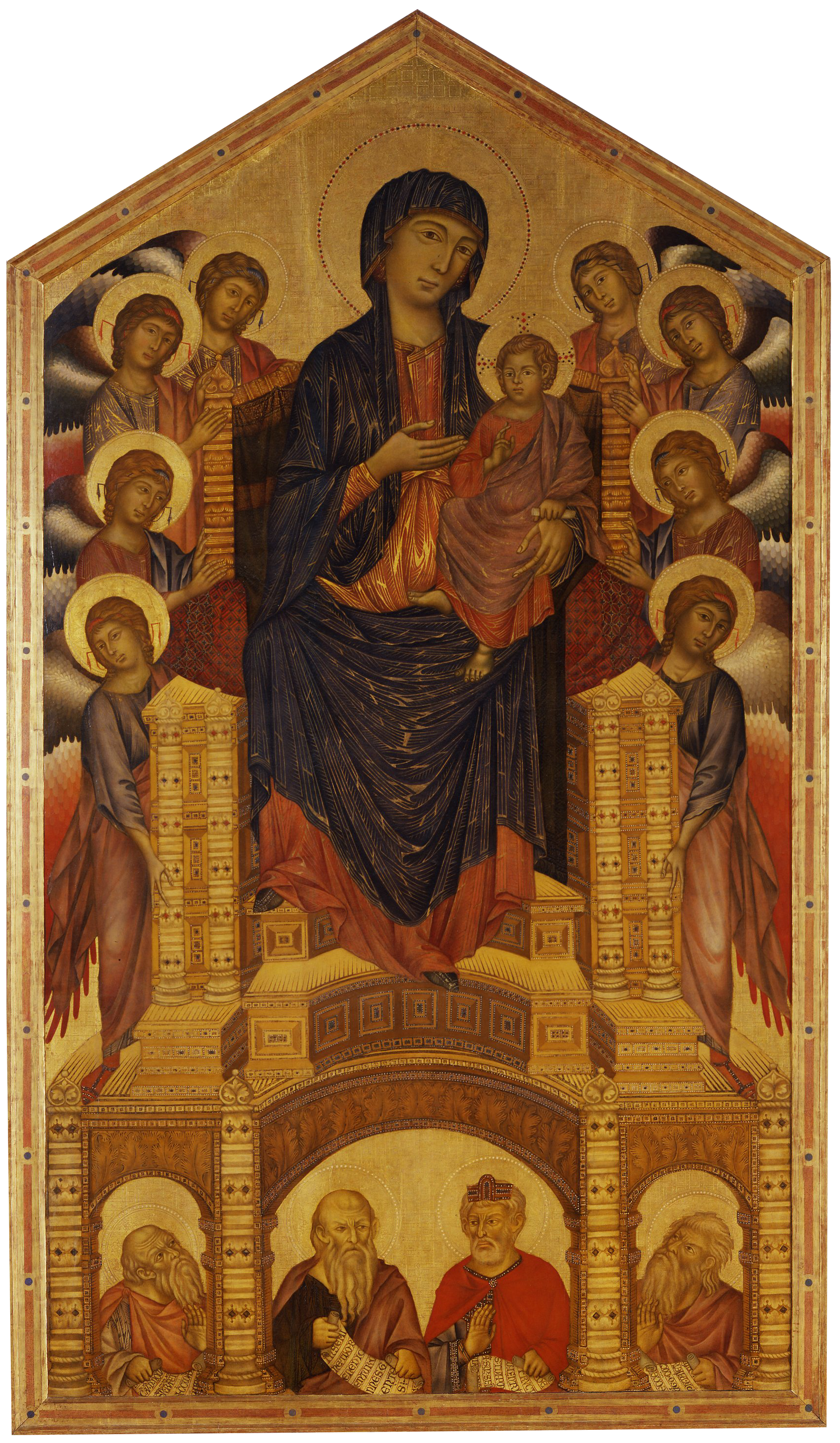 Proveniente dalla chiesa vallombrosana di Santa Trinita a Firenze, il dipinto è ricordato fin dal XVI secolo come opera di Cimabue, il più importante pittore fiorentino del XIII secolo, attivo oltre che in Toscana, a Roma, ad Assisi e a Bologna. Sopra un grande trono eburneo, imponente e articolato come un’architettura, la Vergine indica con la mano destra il Figlio che tiene in braccio, secondo il modello bizantino della Odigitria, cioè colei che mostra la via della salvezza. Gesù Bambino, abbigliato come un antico filosofo, benedice e stringe una pergamena arrotolata, forse il rotolo della Legge. Le vesti di Maria e del Figlio sono caratterizzate da una preziosa decorazione dorata, detta agemina, caratteristica della tradizione pittorica bizantina e in gran voga nella pittura italiana medievale. Intorno al gruppo mariano, otto angeli dalle splendide ali variopinte sorreggono delicatamente il trono. Piuttosto insolita nell’iconografia della Madonna in Maestà è la raffigurazione, al di sotto del trono, di alcuni profeti dell’Antico Testamento (da sinistra: Geremia, Abramo, David e Isaia) che tengono filatteri con brani delle Sacre Scritture allusivi ai misteri dell’Incarnazione e della Verginità di Maria.
