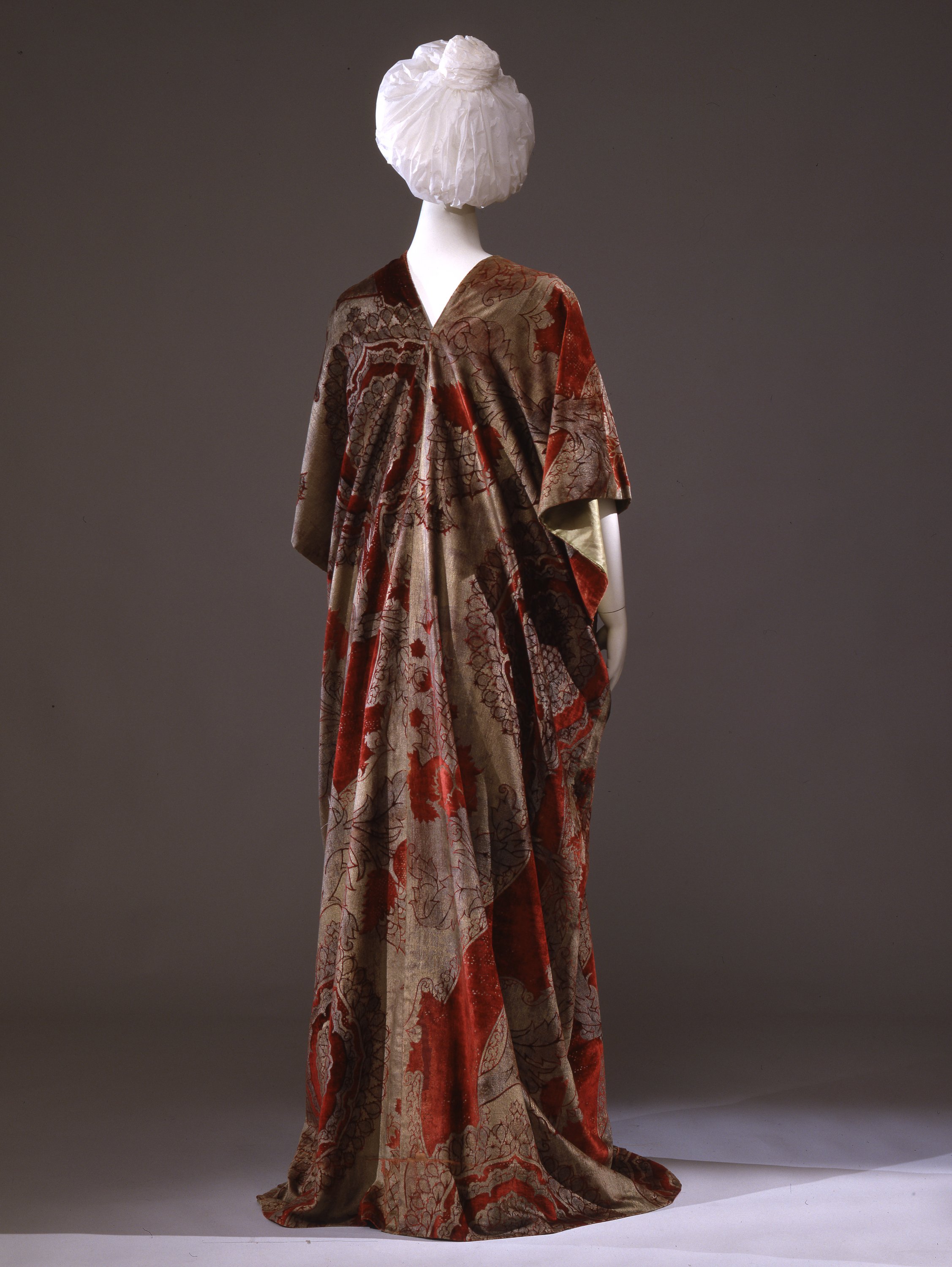 E' un Mantello di tipo kimono, in quattro teli rettangolari, aperto sul davanti, in velluto di seta cremisi stampato in oro a imitazione di velluti quattrocenteschi, senza collo e maniche strutturati. Una volta indossato, il mantello si apre in uno scollo a V creando l'effetto di ampie maniche al gomito. La fodera è in taffetas di seta verde. Il Mantello fu confezionato da Mariano Fortuny (1871-1949) per Eleonora Duse (1858-1924). La solennità dell'incedere sulla scena e la drammaticità dei gesti non lasciavano spazio a indumenti costrittivi: per tale ragione la Duse comprese e amò gli indumenti destrutturati di Fortuny, abiti d'ispirazione colta, che riproponevano, come in questo esemplare, patterns decorativi mutuati dalla tradizione rinascimentale.