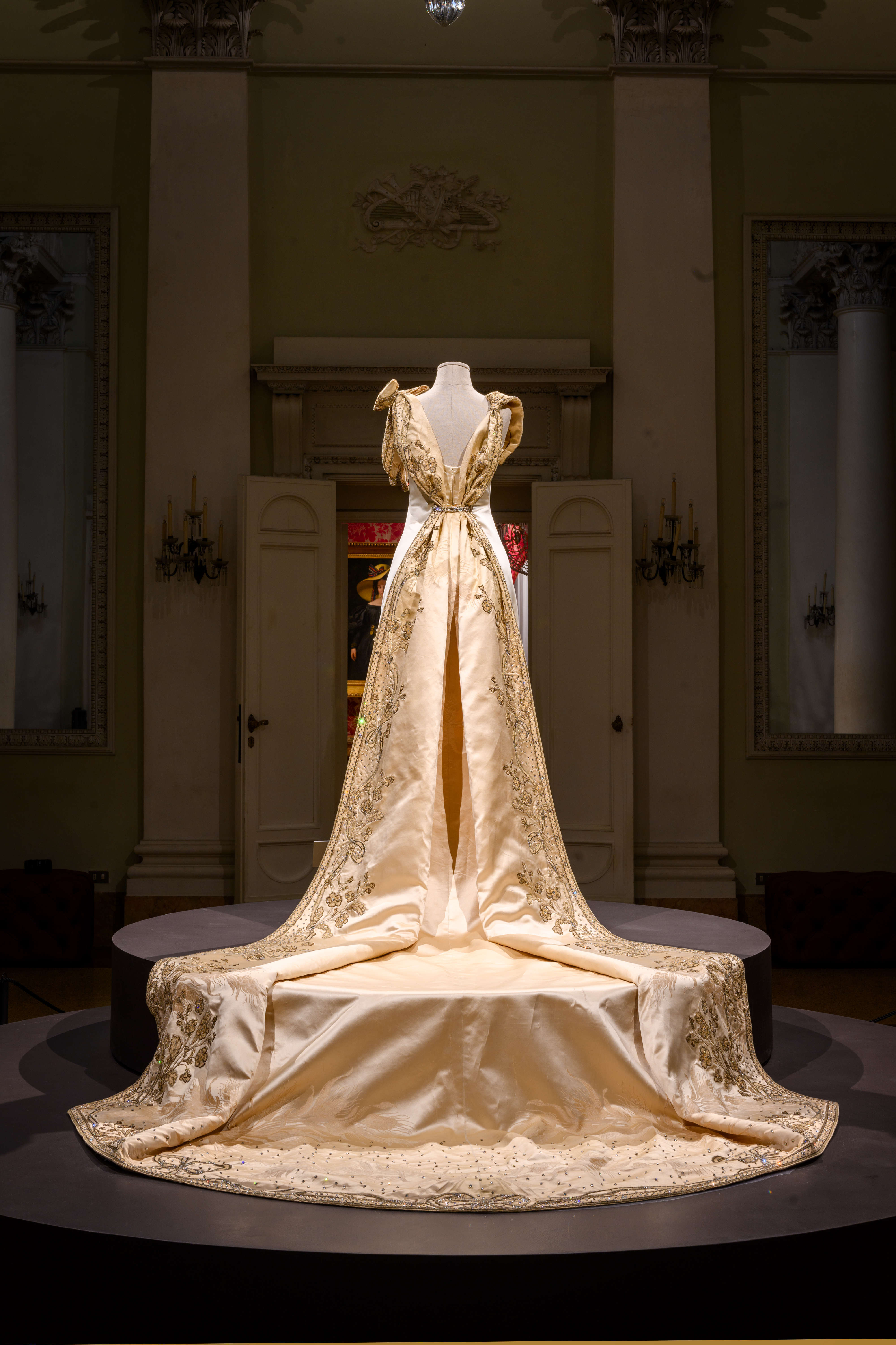 Questo manto di corte, confezionato per Donna Franca Florio, dama di corte della Regina Elena, moglie di Vittorio Emanuele III di Savoia, dal maggio 1902, fu da lei indossato anche a Vienna e a Berlino, alle corti di Francesco Giuseppe e Guglielmo II.