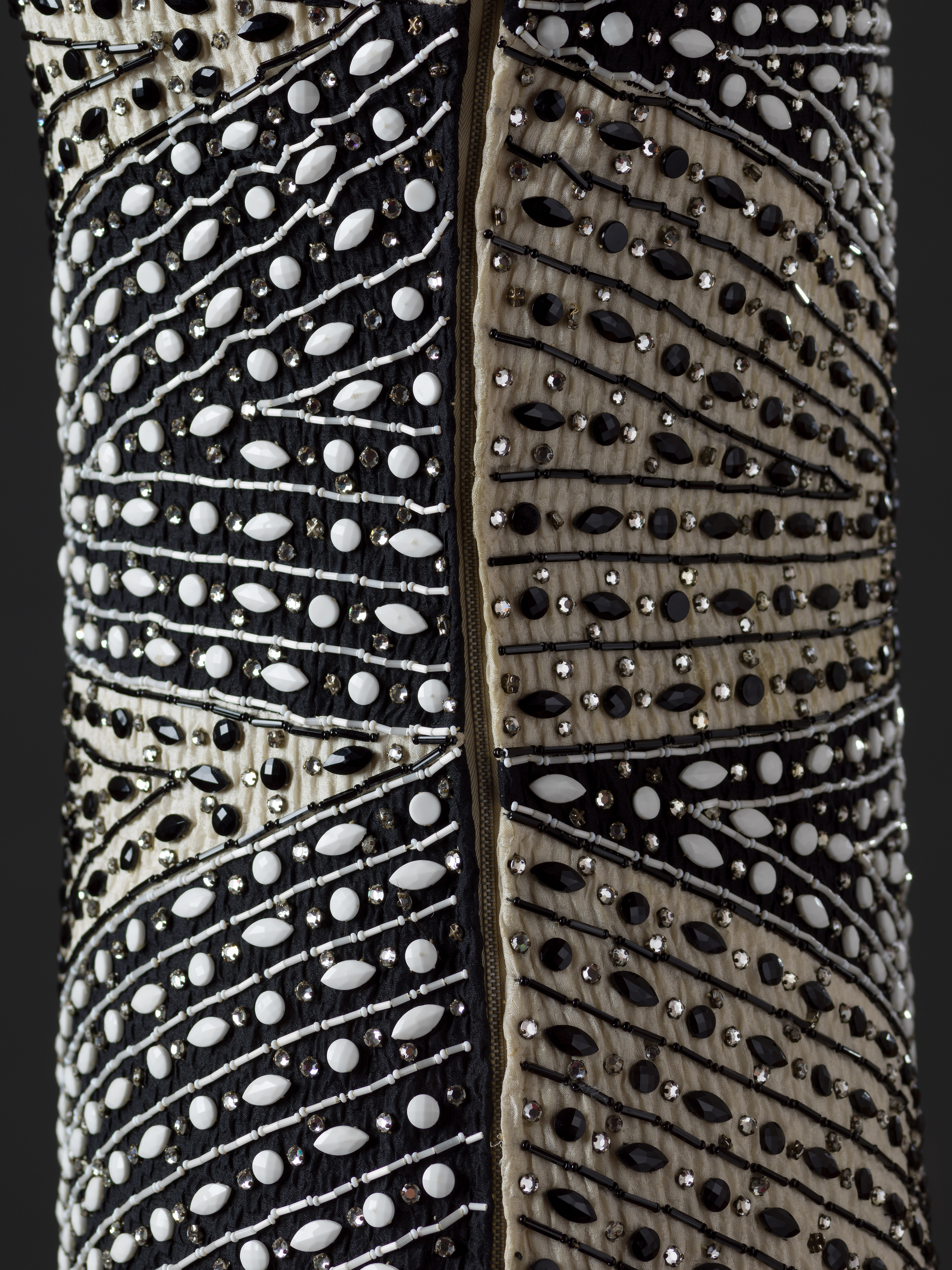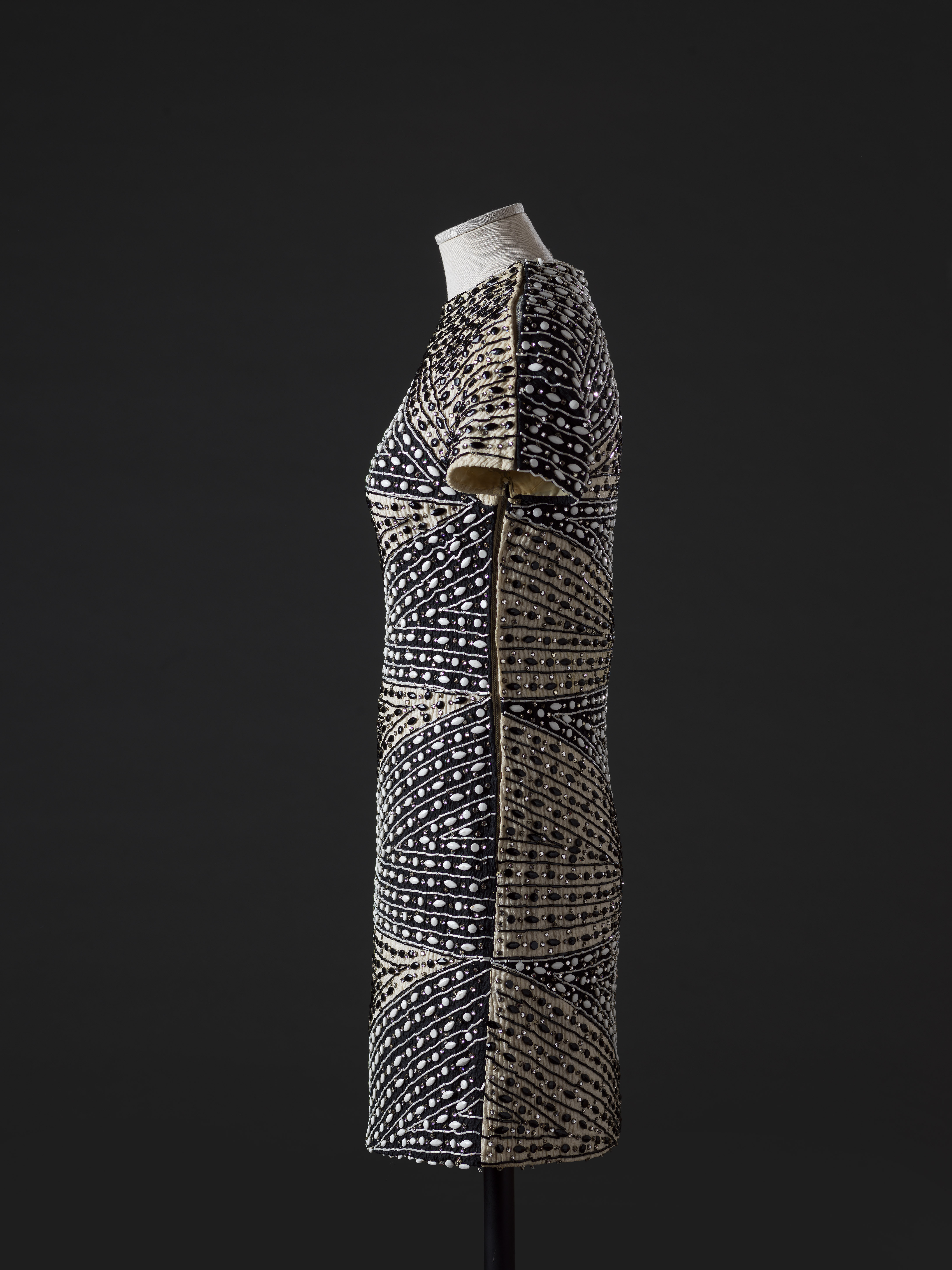 Miniabito in crêpe di seta bianco e nero dal disegno geometrico a losanghe, ricamato con strass, jais bianco e nero e perline bianche e nere. Il girocollo e le maniche sono corte.
