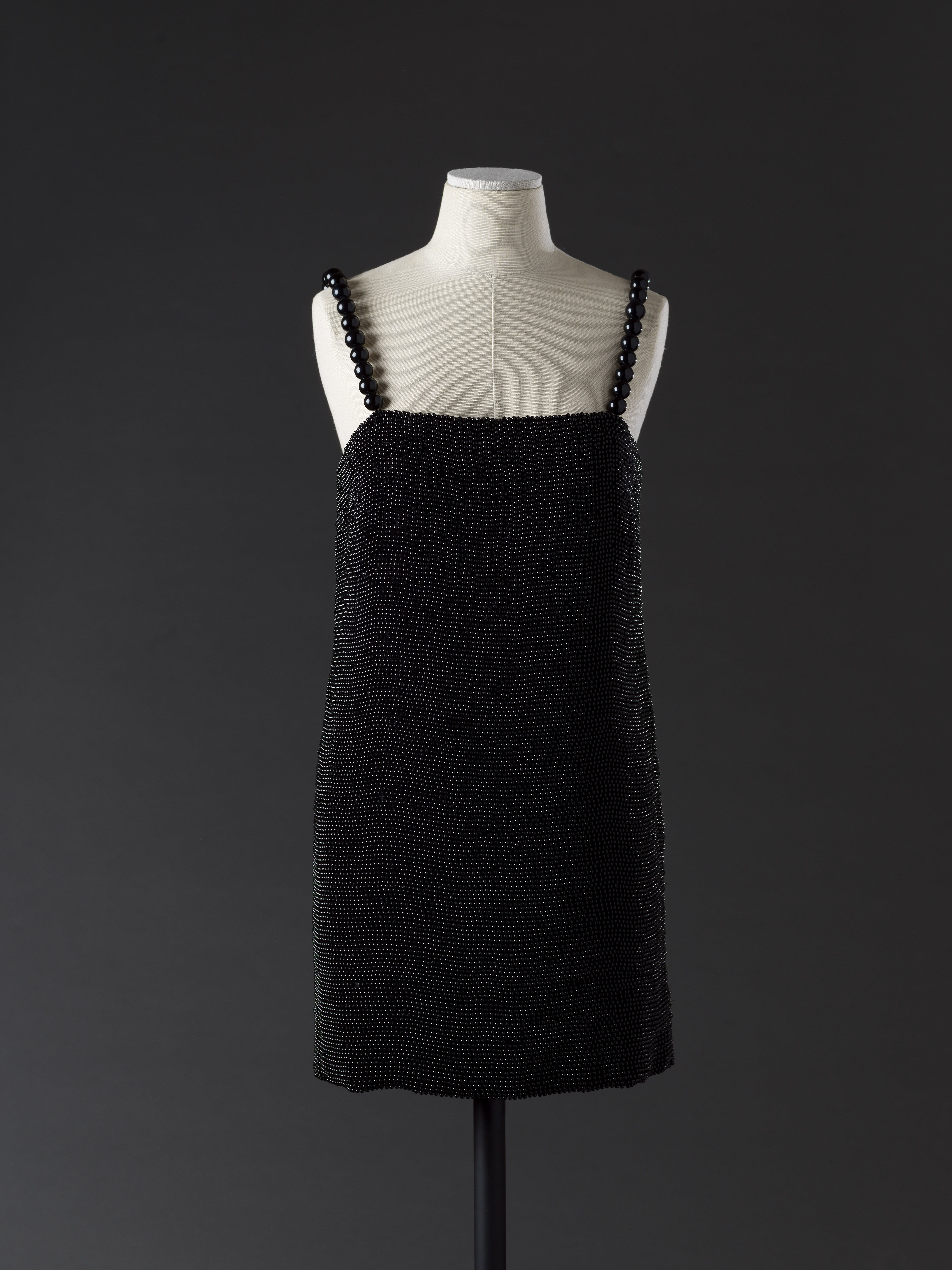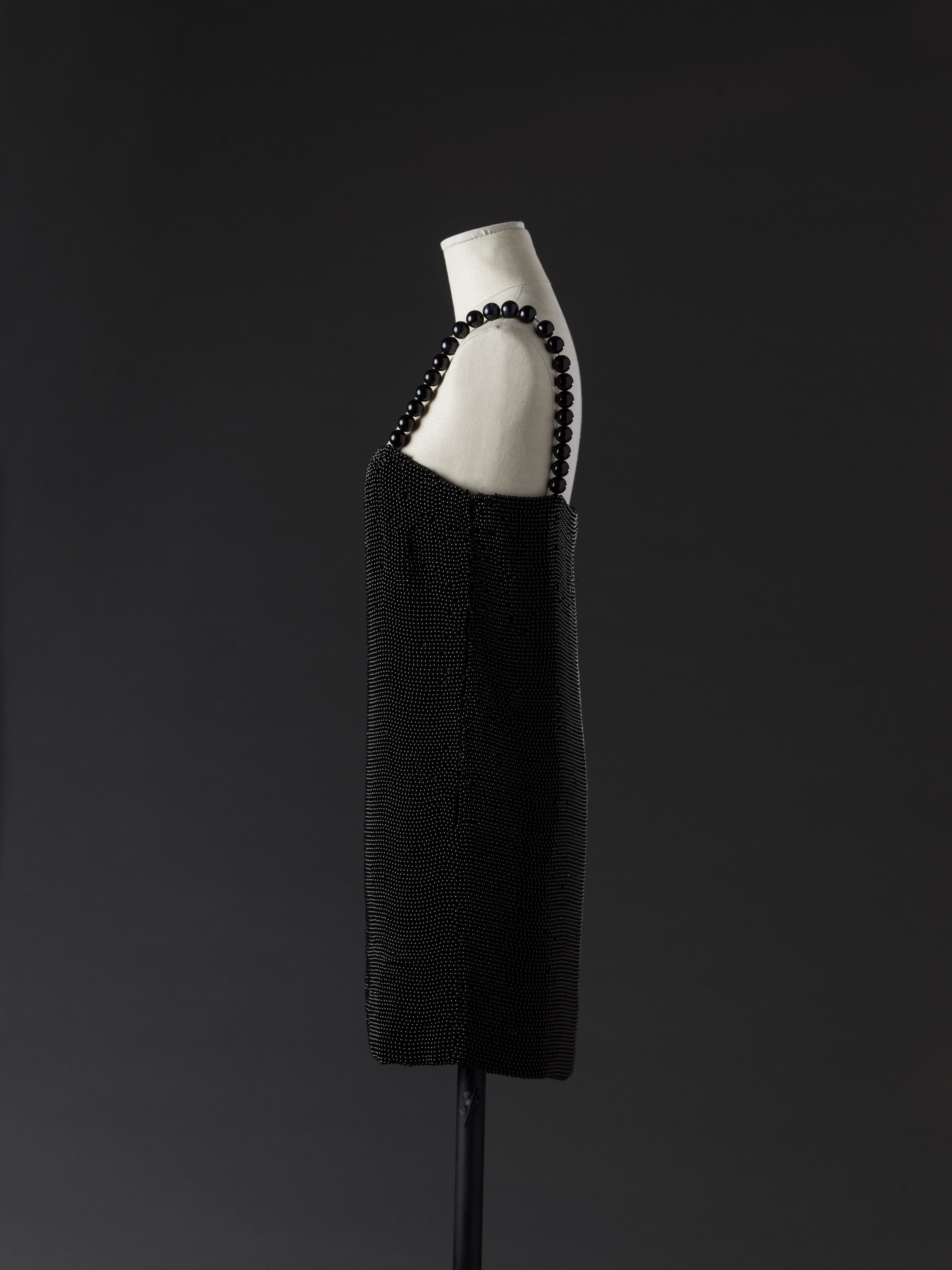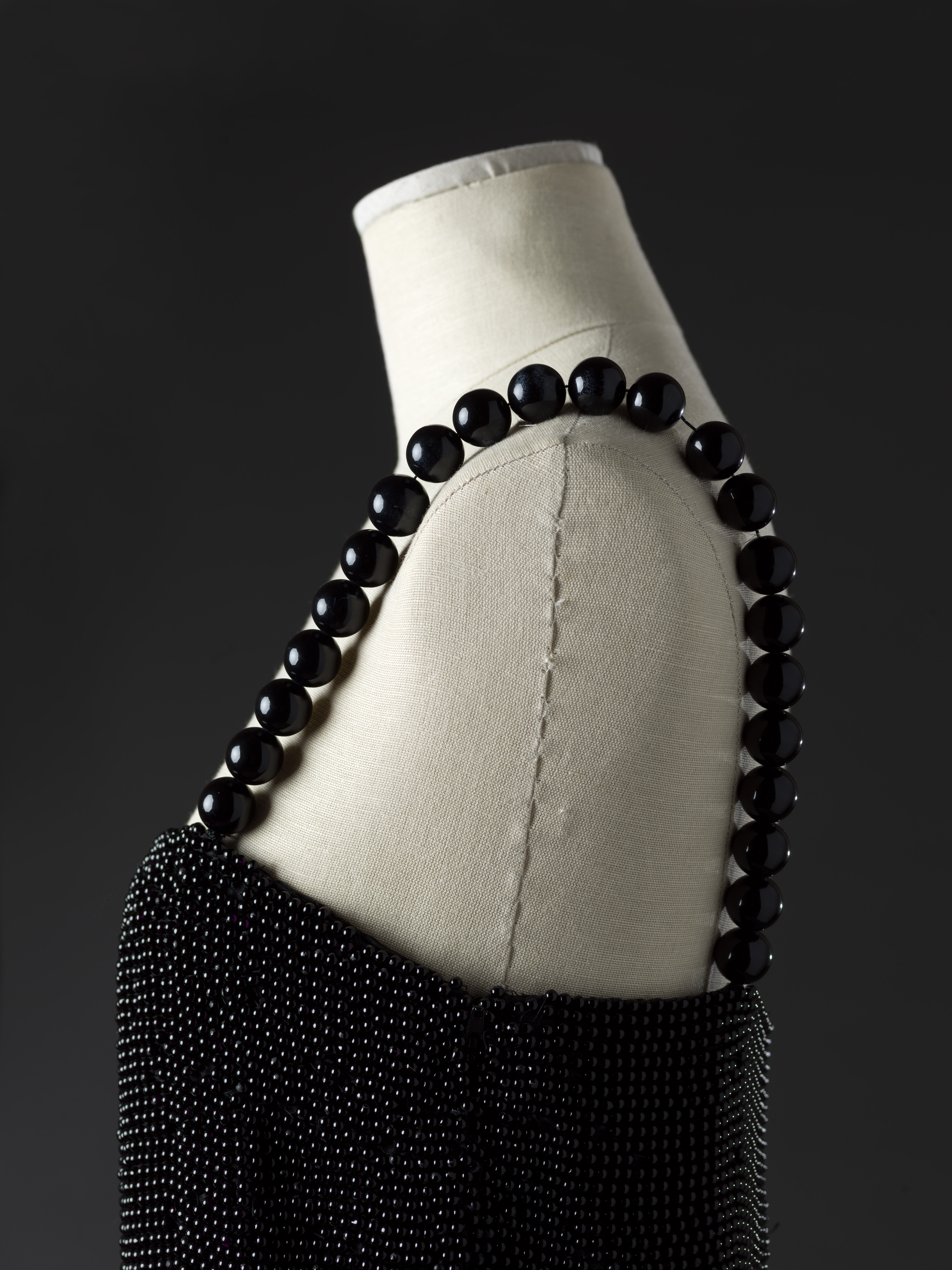 sorretto da spallini di perle rotonde nere di grossa dimensione. L’abito è stato realizzato per