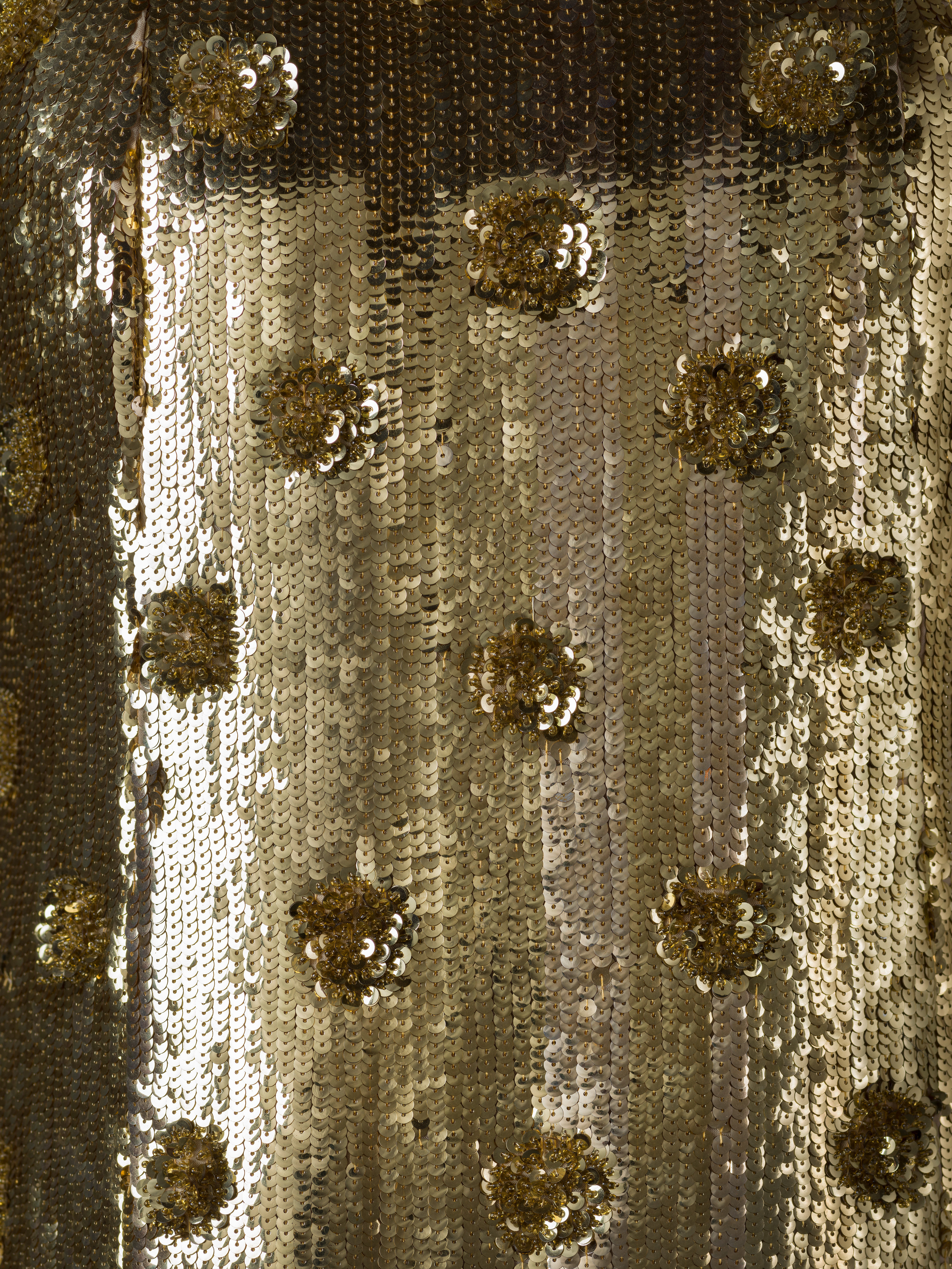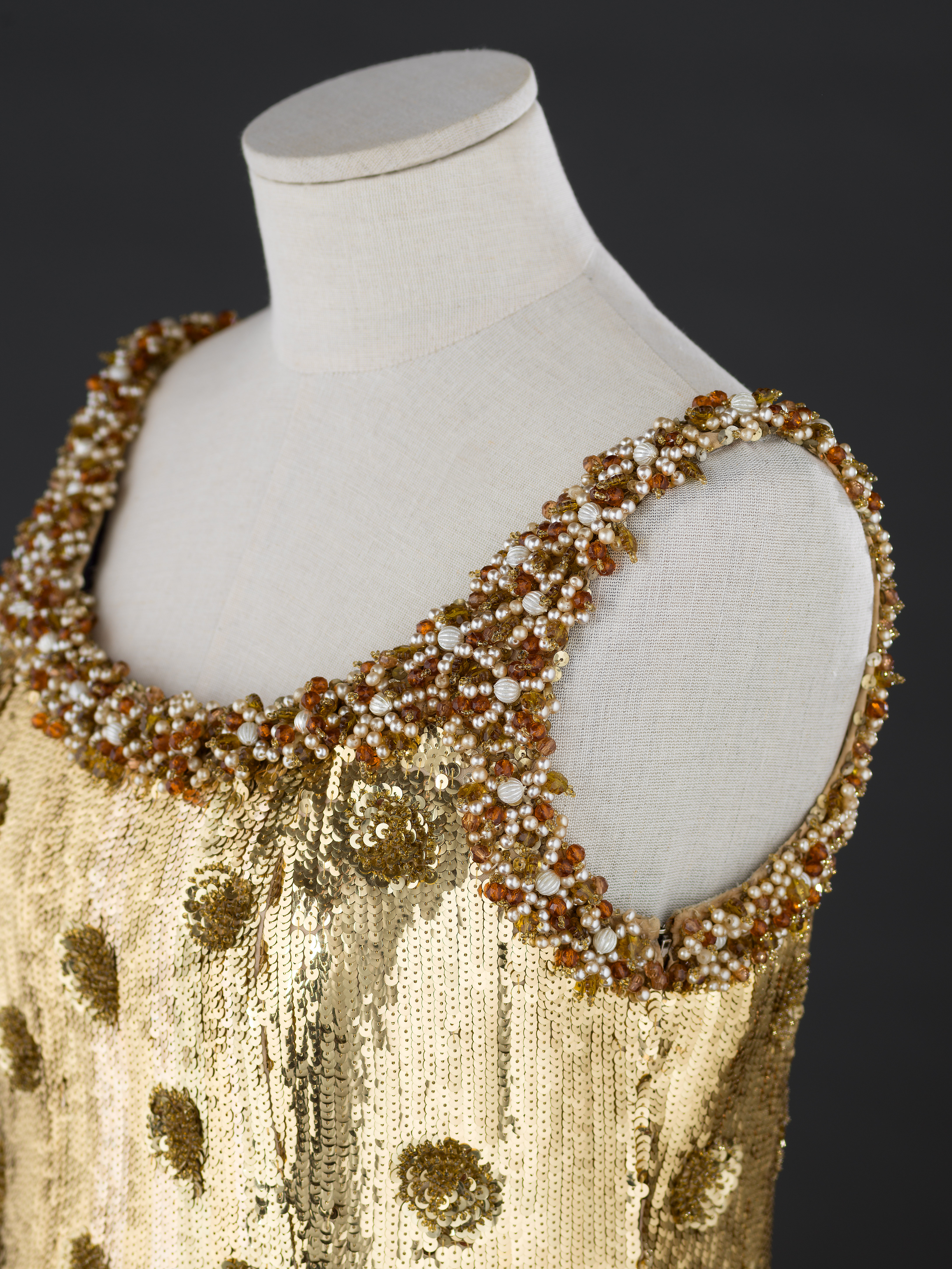 Miniabito senza maniche in organza interamente ricamata di paillettes dorate con roselline a rilievo in paillettes e perline di vetro dorato; bordo in perline e cristalli in gradazione dal bianco al giallo; scollo rotondo e spacco laterale sinistro; chiusura a cerniera sul fianco sinistro. Fodera in bemberg e organza. Indossato da Catherine Spaak - dono Umberto Tirelli Dono Umberto Tirelli, 1986
