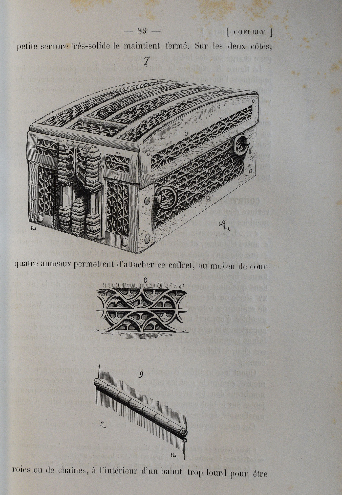 Fra gli esemplari provenienti dalla dispersa biblioteca della Villa Demidov di San Donato, si trova un testo molto noto, all’epoca, come il repertorio del Mobilier, pubblicato a Parigi nel 1872, in cui l’architetto francese Viollet-Le-Duc descriveva accuratamente, con bellissimi disegni di sua mano, gli oggetti d’uso comune nel Medioevo: dai mobili, ai gioielli, all’abbigliamento, alle armi. L’opera testimonia gusti e interessi di Pavel Pavlovič (1839-1885), nipote ed erede di Anatolij Demidov (1813-1870).