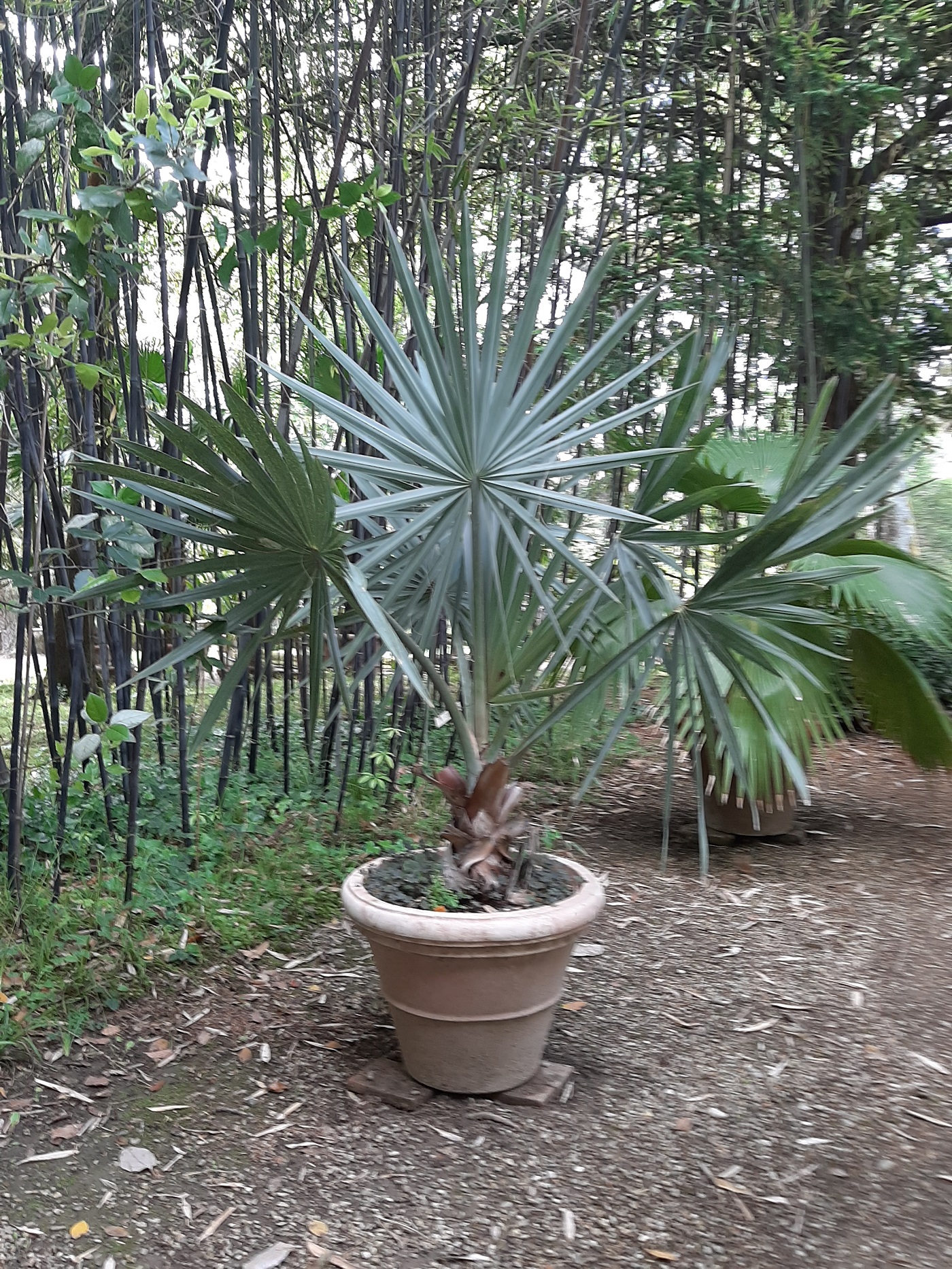 Originaria del Madagascar, questa palma ha un fusto corto e tozzo che negli esemplari giovani conserva la base delle vecchie fronde, mentre con il passare degli anni tende a divenire liscio; le fronde sono ampie fino a 150-200 cm, di forma a ventaglio, costituite da segmenti nastriformi, rigidi ed appuntiti; le giovani foglie sono di colore verde sfumato di viola porpora, mentre le fronde adulte sono di colore blu argento, ricoperte da una sottile patina cerosa di colore bianco argento. Ogni fronda di questa pianta è sostenuta da un lungo picciolo rigido, lungo fino a 150-180 cm, che porta sui lati alcune spine acuminate. La chioma è molto particolare in quanto perfettamente tondeggiante. Le piante più adulte resistono senza problemi fino a temperature che arrivano a -3/4°C per brevi periodi, ma prediligono un clima mite e temperato. La varietà a foglie verdi soffre già a temperature di 0°C.