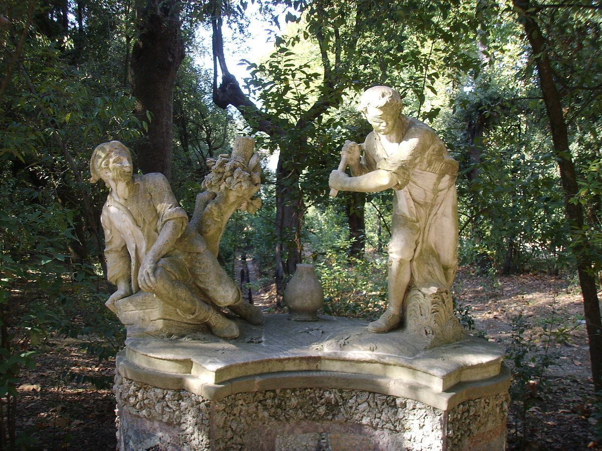 Il Gioco della Pentolaccia fa da pendant al Gioco del Saccomazzone, entrambi collocati alla fine del Viottolone nel Giardino di Boboli. Qui, un giovane bendato cerca di colpire una pentola di coccio posizionata a terra, mentre alla sua destra il compagno divertito osserva, in particolare lo scultore ha scelto di rappresentare il momento in cui il giocatore fallisce il colpo, suscitando l’ilarità del compagno. Questo gruppo scultoreo venne ordinato da Pietro Leopoldo, il quale affidò la commissione a Giovanni Battista Capezzuoli che, tra il 1778 e il 1780 circa, scolpì il Gioco della Pentolaccia conferendogli un particolare gusto settecentesco, quasi rococò. È interessante ricordare l’esistenza di una versione del Gioco della pentolaccia in gesso, probabilmente il modello preparatorio per il marmo, nel quale si accentua la spontanea vitalità dei gesti, bloccati in pose transitorie, dando risalto alle espressioni volutamente caricaturali dei personaggi, ai limiti del grottesco. Inoltre, tanto nel modello quanto nella versione definitiva, si nota l’attenzione che lo scultore ripone nei dettagli, minuziosamente indagati, come le camicie aperte a evidenziare il petto nudo, le giacche spiegazzate con le maniche arrotolate, i calzoni corti e aderenti che evidenziano le membra robuste. Il gruppo scultoreo, pertanto, si inserisce nel filone giocoso e popolaresco delle sculture collocate lungo i viali di Boboli, con cui si mettono in evidenza episodi di vita quotidiana, a cui talvolta è necessario aggiungere una vena grottesca, connaturata al manierismo, che durante il Cinquecento e il Seicento porta all’alterazione della realtà. Questa tradizione trova il suo precedente nella scultura tardo-ellenistica che il Capezzuoli vivifica attraverso la conoscenza dei soggetti pastorali e dei giochi galanti tipici della pittura di Fragonard e Boucher.