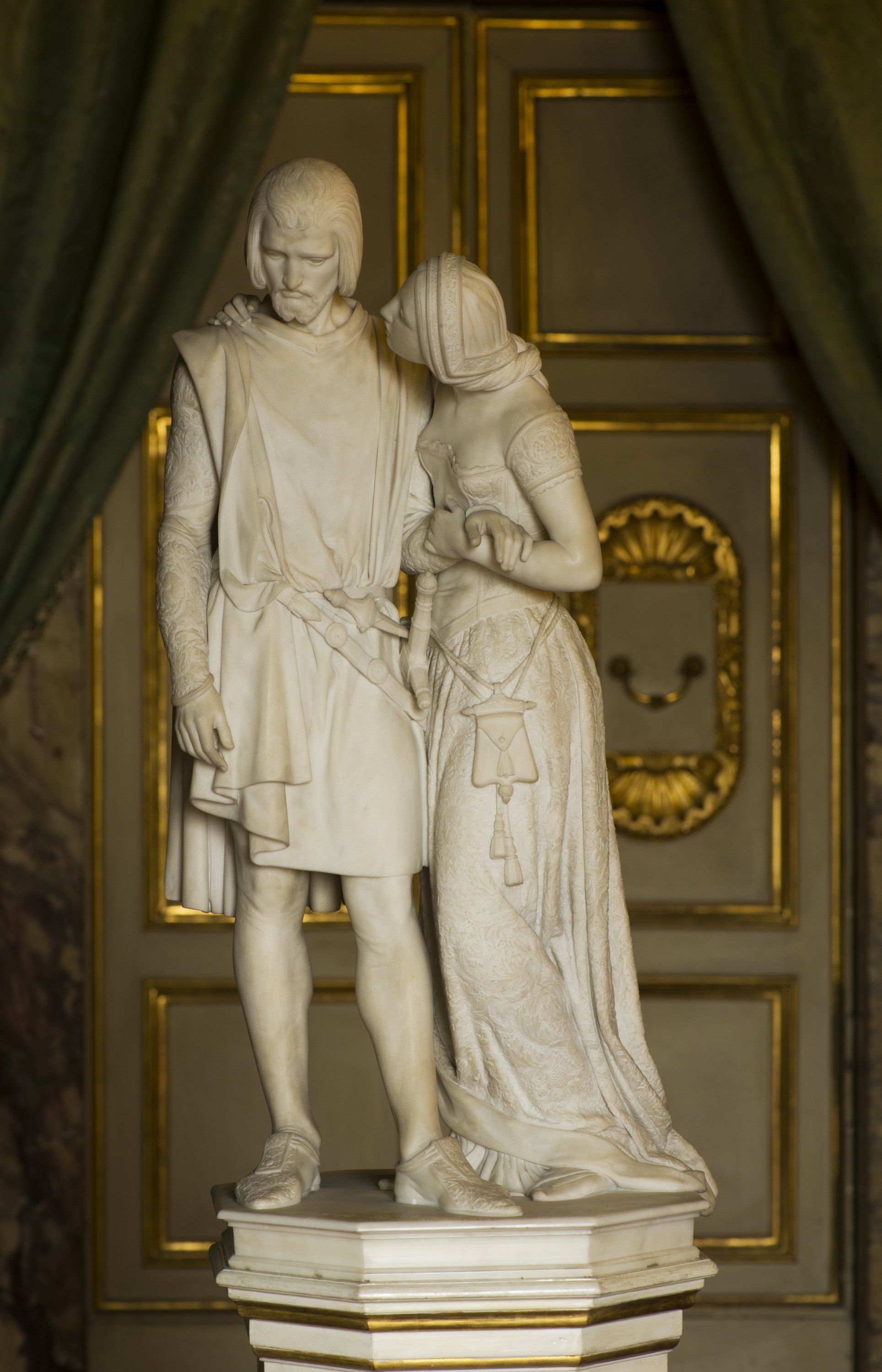 Come già rilevavano i contemporanei, più che i versi della Divina Commedia, furono questa rielaborazione romantica dell’episodio dantesco e soprattutto l’omonima opera di Donizetti rappresentata al Teatro della Pergola nel 1842, a suggerire al Fedi l’argomento e la giusta messa in scena del suo gruppo, che è appunto una fedele trasposizione figurativa del passo del Sestini. Lo scultore mette in scena l’episodio secondo il gusto del contemporaneo melodramma: il sospettoso marito, in preda alla gelosia, accoglie con freddezza le manifestazioni d’affetto della moglie, già meditando in cuor suo propositi di vendetta: «Ma poi che il castellan la mensa tolse / e restan soli nella chiusa stanza, / le bianche braccia al collo ella gli avvolse, / siccome avea di far sovente usanza; / poi con ingenua e tenera sembianza / la strinse, e ne sperò bel cambio invano / qual di persona morta era la mano».