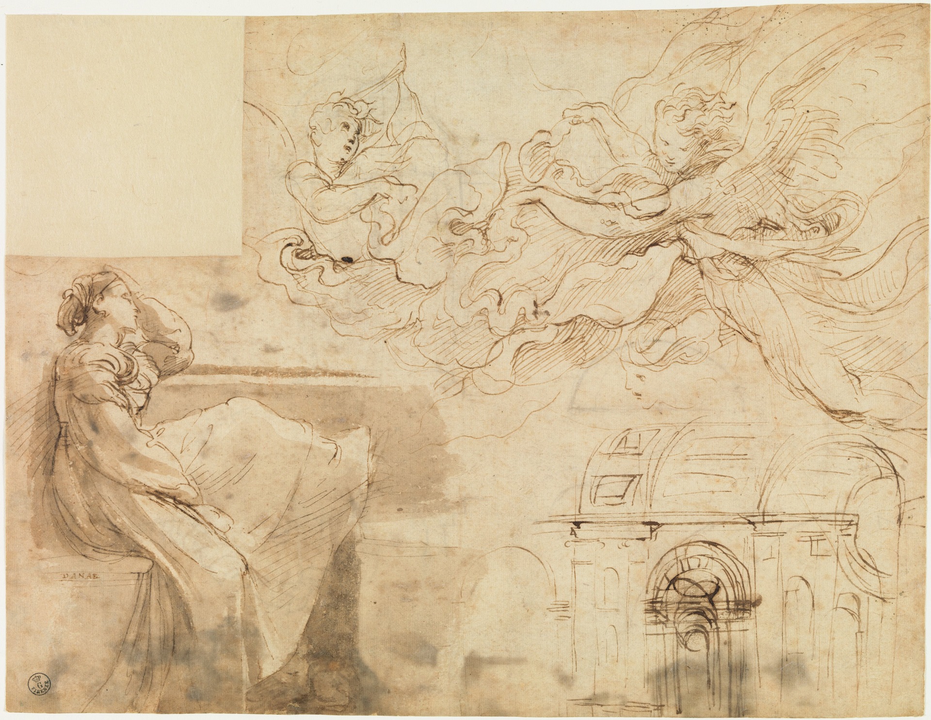 La figura di giovane donna trae la sua prima ispirazione da un rilievo di un sarcofago antico un tempo nella collezione Albani del Drago a Roma, oggi nel Museo Nazionale Romano in Palazzo Altemps, che un’interpretazione tradizionale ma erronea identifica come una Nova nupta, ovvero una fanciulla in atto di essere abbigliata per le nozze. L’indicazione proposta dalla scritta “DANAE”, vergata in inchiostro sul margine anteriore del sedile, suggerisce però che per l’Urbinate il rilievo potesse prestarsi a un’interpretazione del mito di Danae; l’eroina sarebbe quindi appoggiata al parapetto della finestra nella torre in cui il padre Acrisio l’aveva rinchiusa per scongiurare il pericolo della sua morte per mano del futuro figlio di Danae. Si tratta di un’interpretazione originale e in continuità con l’iconografia medievale: Danae nel Medioevo, in quanto figura della concezione verginale, riconduceva infatti alla Madonna e all’incarnazione del Verbo; Raffaello intese perciò rimarcare la sua innocenza nel concepimento di Perseo, raffigurandola completamente vestita e del tutto priva delle connotazioni erotiche delle figure concepite in seguito dal Correggio e da Tiziano.