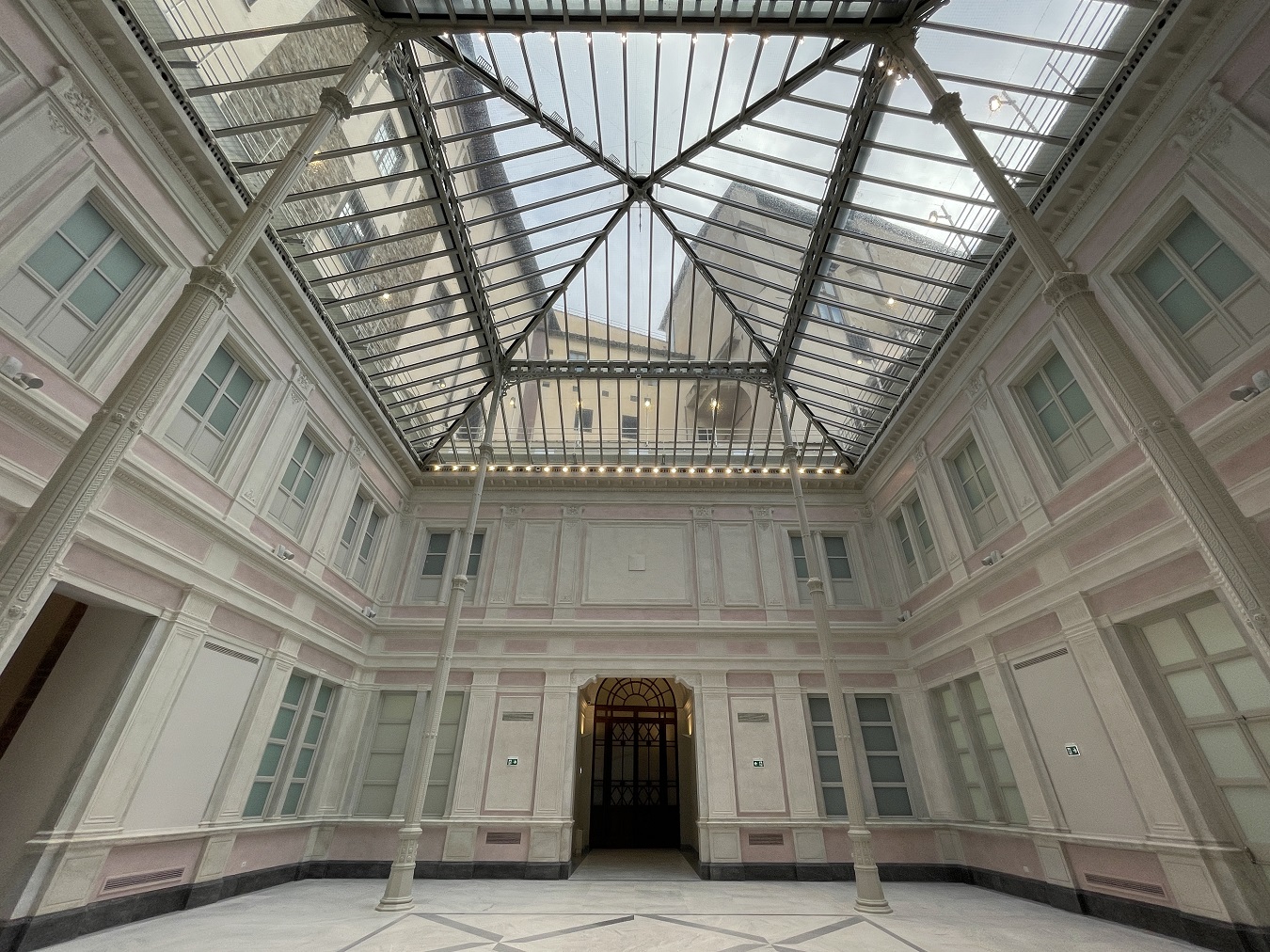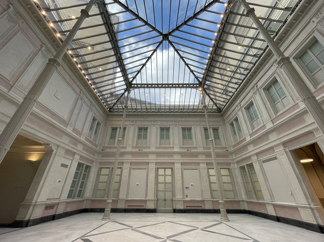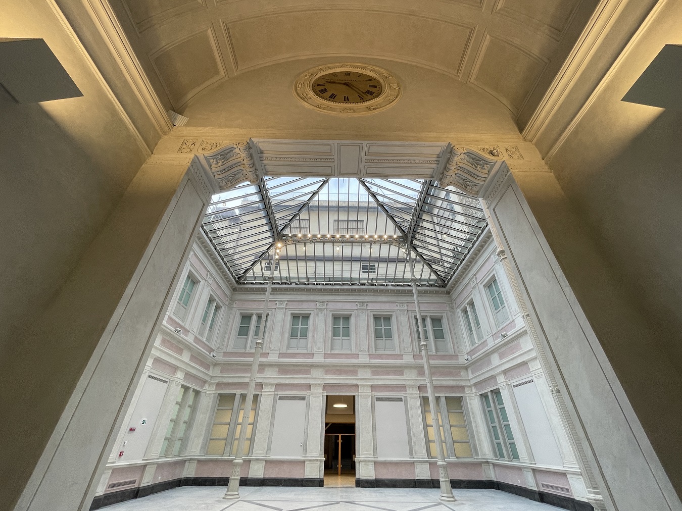 Il progetto fu affidato a Mariano Falcini (Campi Bisenzio, 10 maggio 1804 – Firenze, 11 novembre 1885); Sull’esempio de Les Halles parigine e della Galleria Vittorio Emanuele II di Milano, l’architetto progettò un leggero lucernario in ghisa e cristallo per coprire gli spazi aperti del cortile delle Carrozze e realizzare la sala di distribuzione delle lettere dell’Ufficio Postale. Anche a Firenze si sperimentarono così nuovi materiali per nuove strutture che, a partire dall’Ufficio Postale, sarebbero state a breve realizzate: la stazione telegrafica al piano terreno di Palazzo Medici Riccardi, il Giardino dell’Orticoltura, i mercati coperti di San Lorenzo e di Sant’Ambrogio. L’articolato padiglione poggia su esili colonne elegantemente decorate; i prospetti interni sono caratterizzati dalla scansione verticale in due ordini di lesene delicatamente decorate a stucco, fasce marcapiano e un ricco cornicione; queste partizioni inquadrano ampie finestre, false aperture e specchiature ad intonaco. La soluzione architettonica risulta ordinata, simmetrica e ricercata.