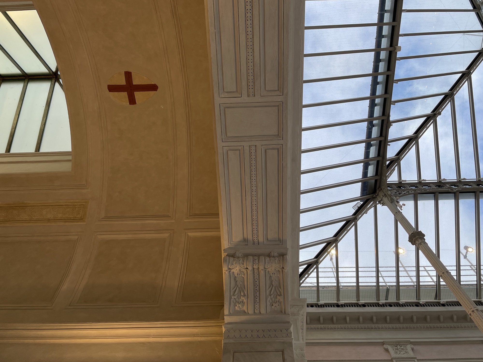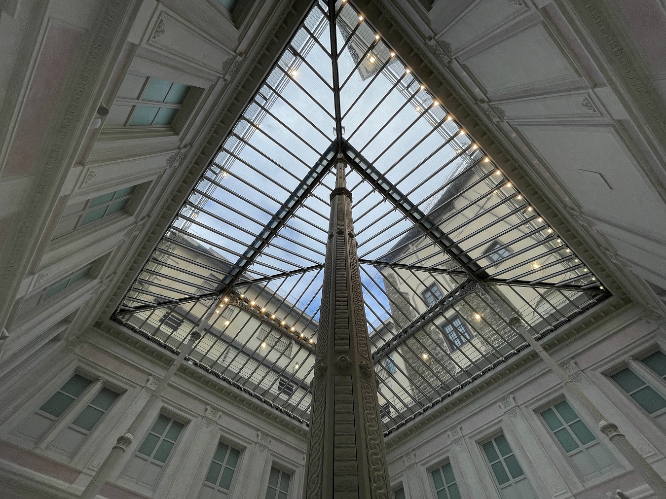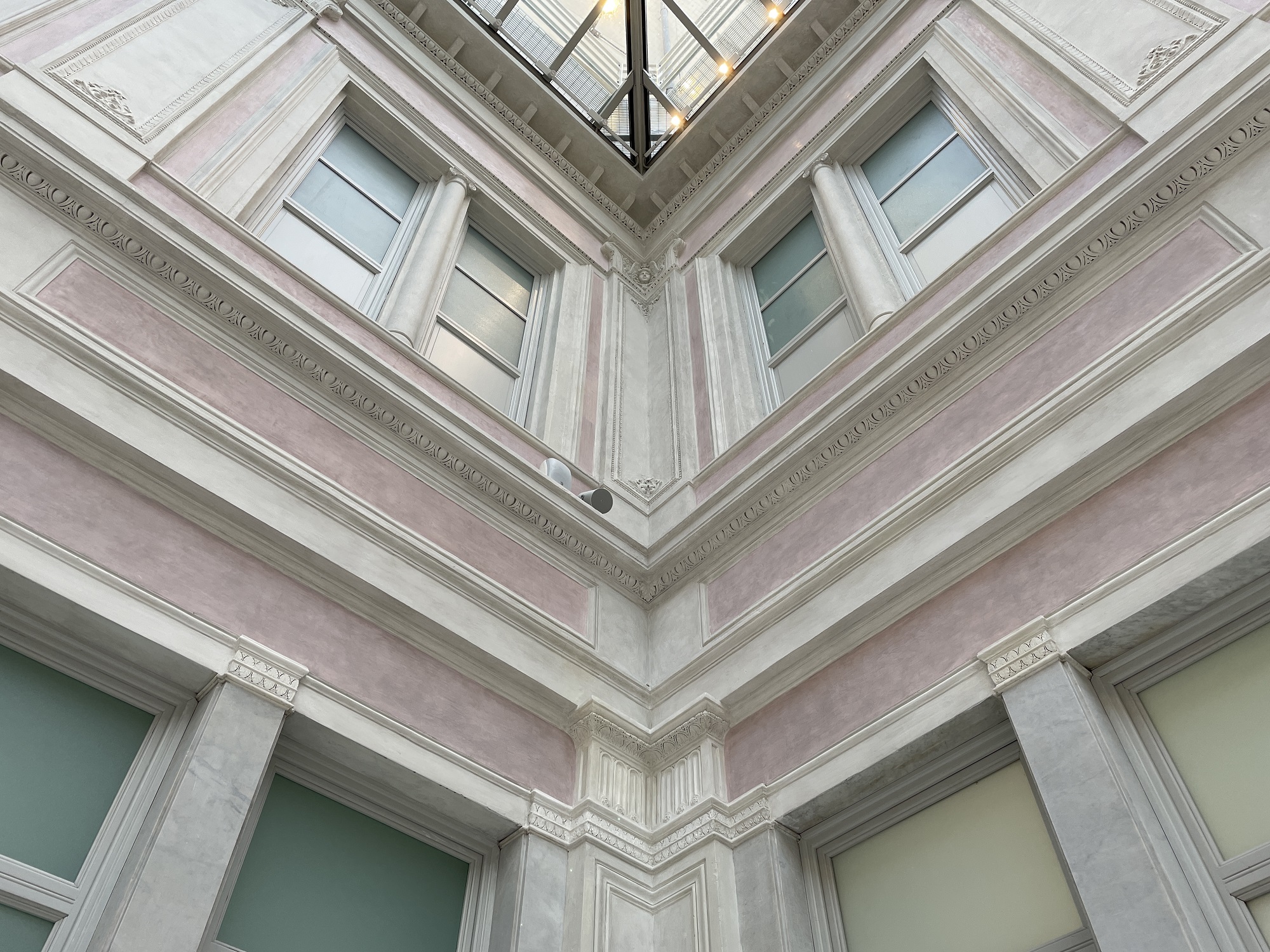 Il progetto fu affidato a Mariano Falcini (Campi Bisenzio, 10 maggio 1804 – Firenze, 11 novembre 1885); Sull’esempio de Les Halles parigine e della Galleria Vittorio Emanuele II di Milano, l’architetto progettò un leggero lucernario in ghisa e cristallo per coprire gli spazi aperti del cortile delle Carrozze e realizzare la sala di distribuzione delle lettere dell’Ufficio Postale. Anche a Firenze si sperimentarono così nuovi materiali per nuove strutture che, a partire dall’Ufficio Postale, sarebbero state a breve realizzate: la stazione telegrafica al piano terreno di Palazzo Medici Riccardi, il Giardino dell’Orticoltura, i mercati coperti di San Lorenzo e di Sant’Ambrogio. L’articolato padiglione poggia su esili colonne elegantemente decorate; i prospetti interni sono caratterizzati dalla scansione verticale in due ordini di lesene delicatamente decorate a stucco, fasce marcapiano e un ricco cornicione; queste partizioni inquadrano ampie finestre, false aperture e specchiature ad intonaco. La soluzione architettonica risulta ordinata, simmetrica e ricercata.