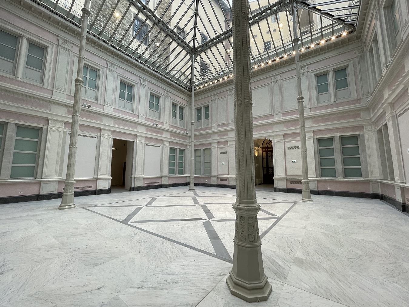 La costruzione delle Reali Poste è attestata da una copiosa documentazione che consente di datare i lavori al periodo 1864-1869. Per le lavorazioni speciali, o per impianti tecnologici peculiari, furono scelte ditte specializzate di Torino e di Oltralpe. L’impianto di illuminazione, alimentato a gas, era costituito da globi di cristallo della fabbrica L.A. Due imponenti orologi collocati nella sala principale furono realizzati da orologiai torinesi, i Fratelli Granaglia. Infine, un caso particolare è la portentosa struttura di ghisa realizzata dall’Opificio meccanico del Pignone di Pietro Benini.