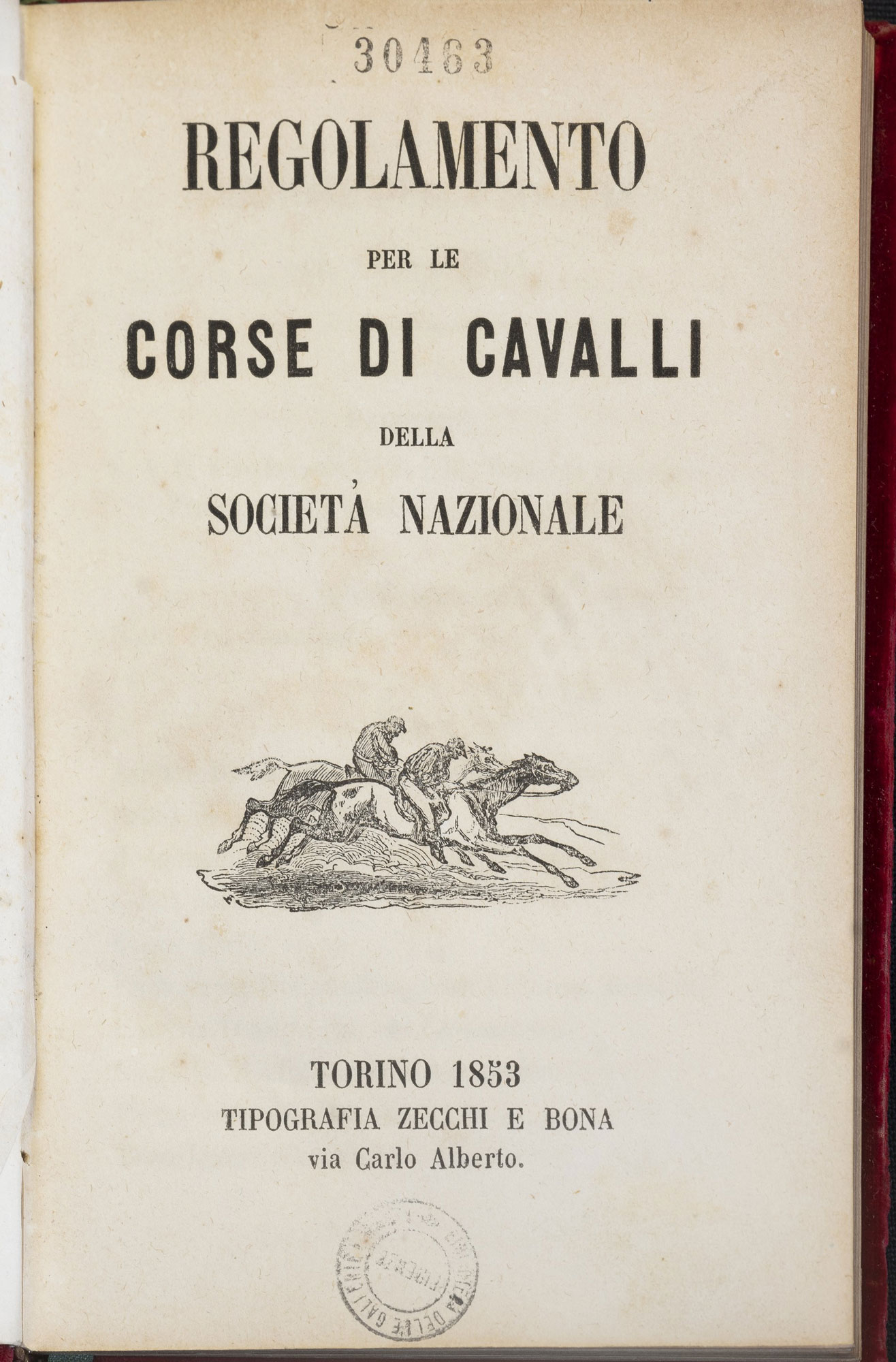 Regolamento per le corse di cavalli della Società Nazionale, Torino, Tipografia Zecchi e Bona, 1853
