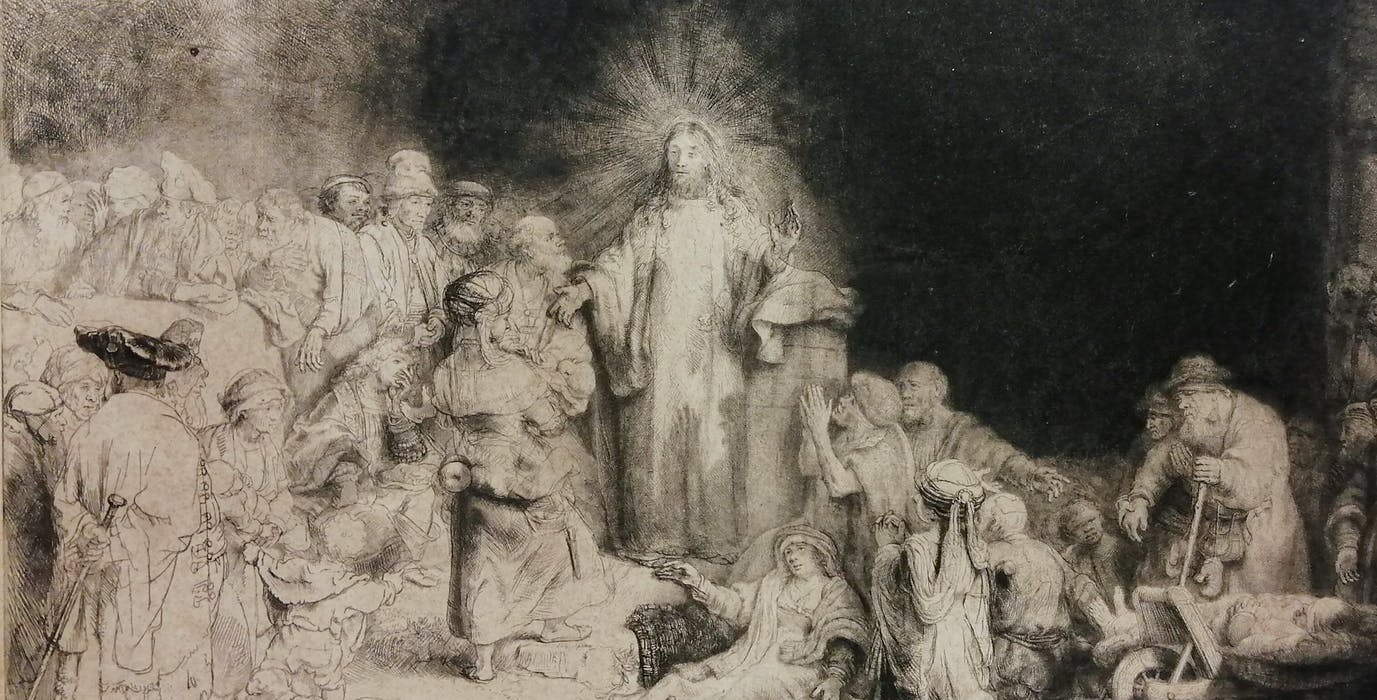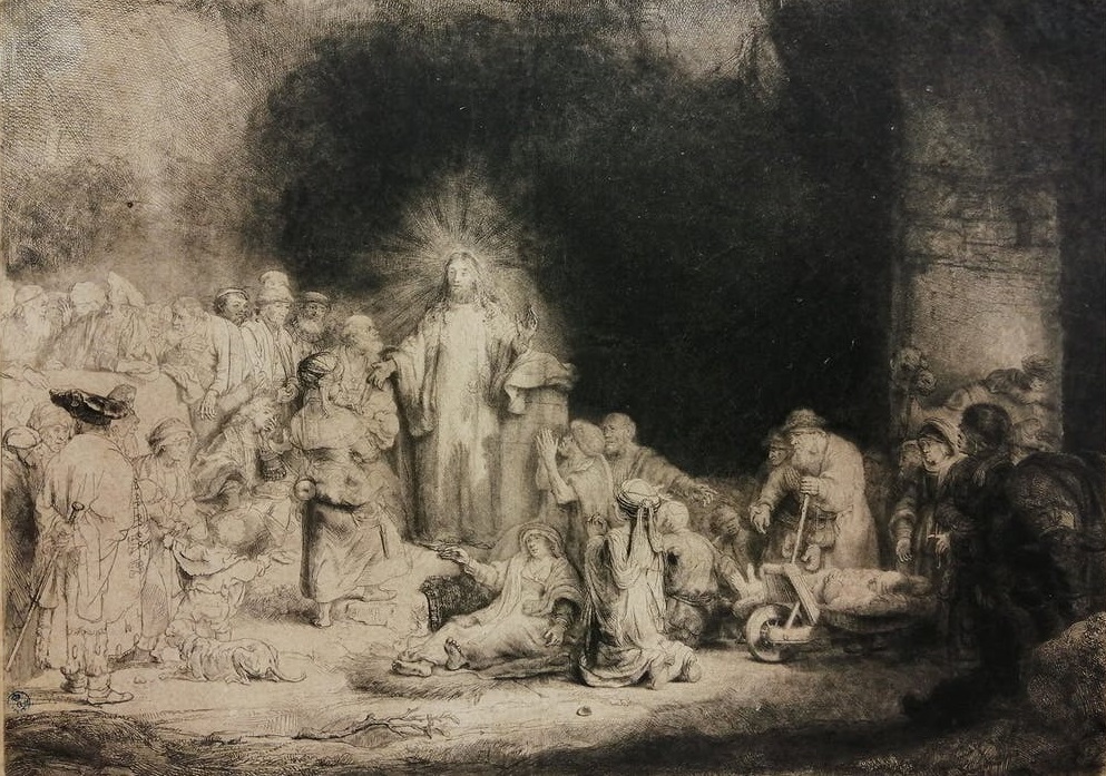Figura miracolosa e salvifica per eccellenza è Gesù, qui presentato secondo il racconto evangelico di Matteo (“Gesù partì dalla Galilea e andò nel territorio della Giudea, al di là del Giordano. E lo seguì molta folla e colà egli guarì i malati”, Mt 19,1-2). Rembrandt riunisce in un’unica scena diversi episodi mettendoli a confronto con un personale e organico sforzo di interpretazione. Quella che ne deriva è una delle sue più celebri incisioni, che accosta il tema della guarigione dalle infermità a quello della purezza dell’anima - “Lasciate che i bambini vengano a me, perché di questi è il regno dei cieli” (Mt 19, 14).