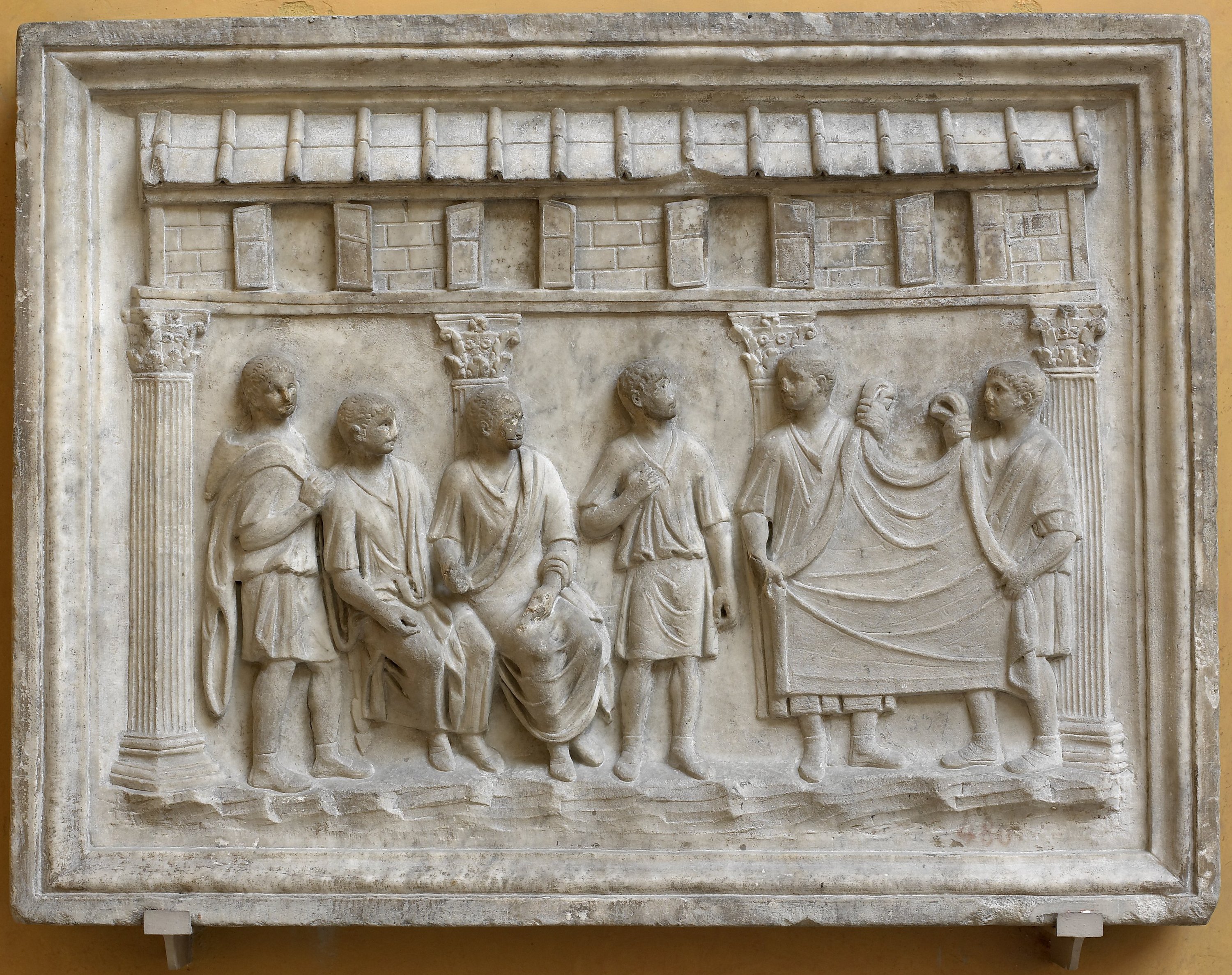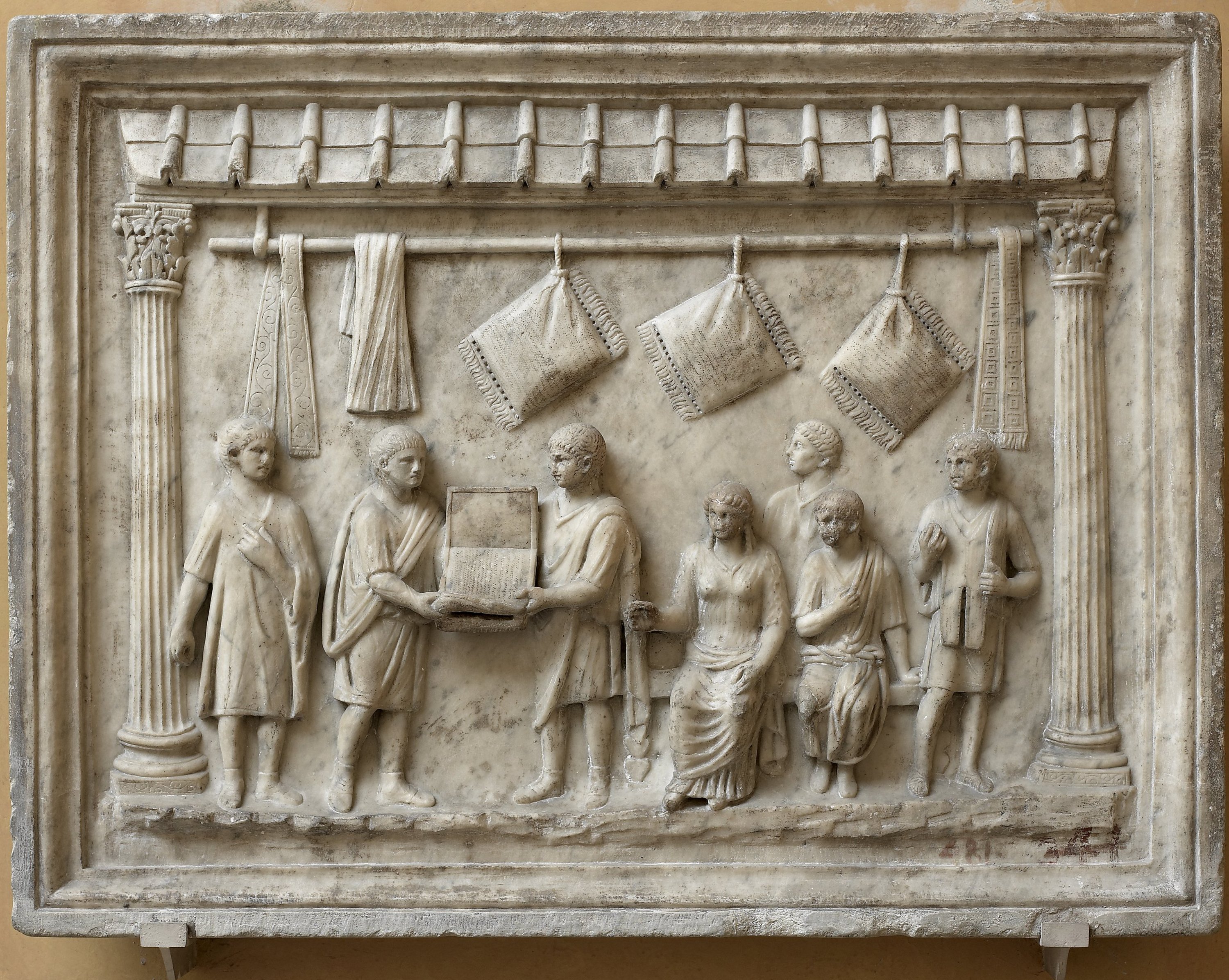 L’antica Roma, come i municipi più illustri, brillava per negozi di lusso, che animavano i luoghi di convegno e passeggio della gente ricca ed elegante di Roma. Ne offrono un esempio due splendidi rilievi provenienti dal monumento funebre di un ricco mercante, che resta purtroppo anonimo, non essendo stata tramandata l’iscrizione che ne ricordava il nome. Le due opere raccontano in modo piuttosto vivido, grazie alla buona qualità del rilievo, l’attività di una bottega di stoffe e cuscini, che il defunto aveva voluto ornasse il suo sepolcro a perenne ricordo del successo professionale e personale raggiunto in vita.