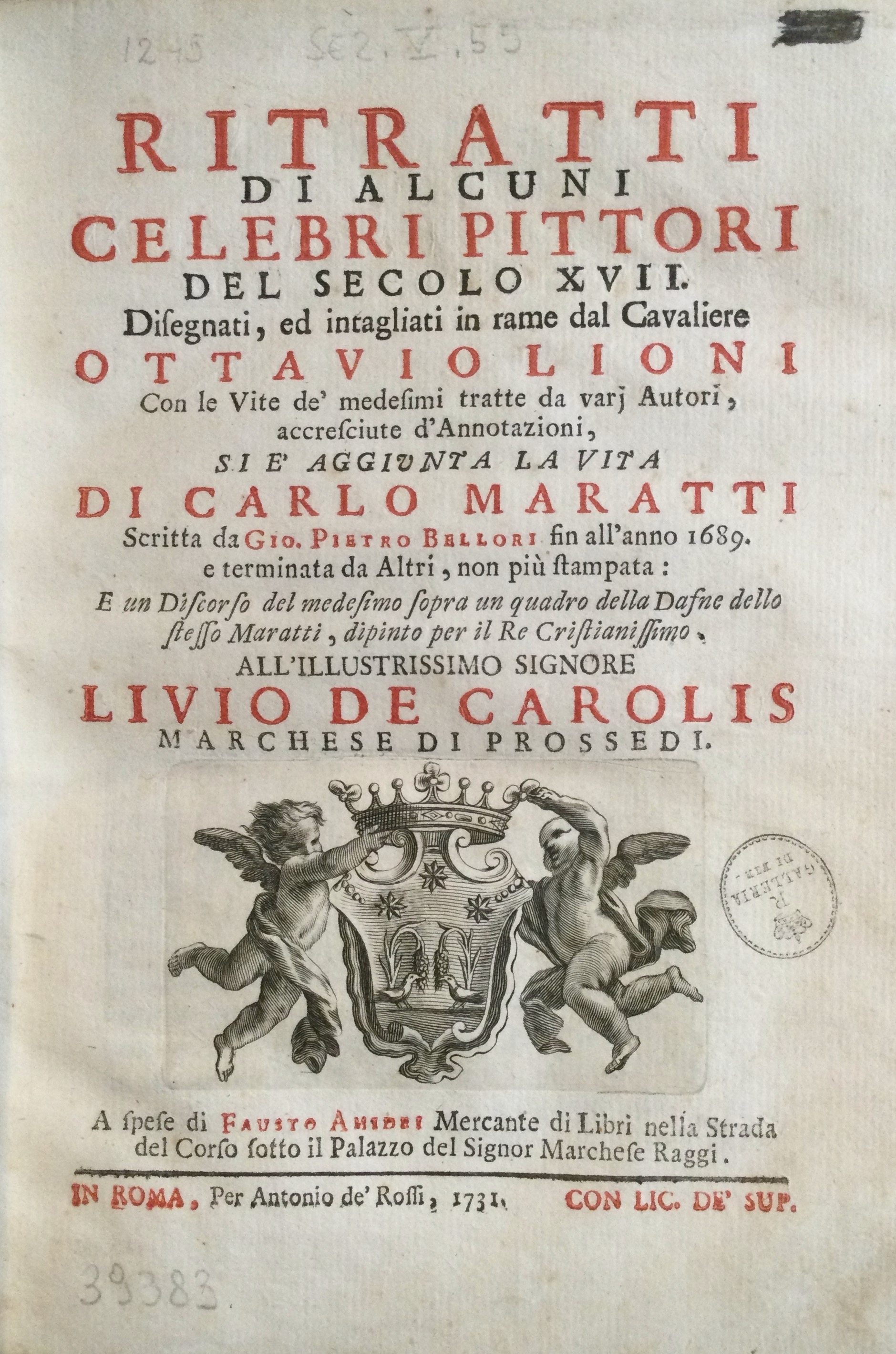 L'esemplare è mutilo dei ritratti di Giuseppe Cesare d’Arpino e Simon Vouet; il ritratto di Carlo Maratta è tuttora attribuito ad autore ignoto; le medaglie raffiguranti Gian Lorenzo Bernini e Carlo Maratta sono state incise da M. Tuscher.