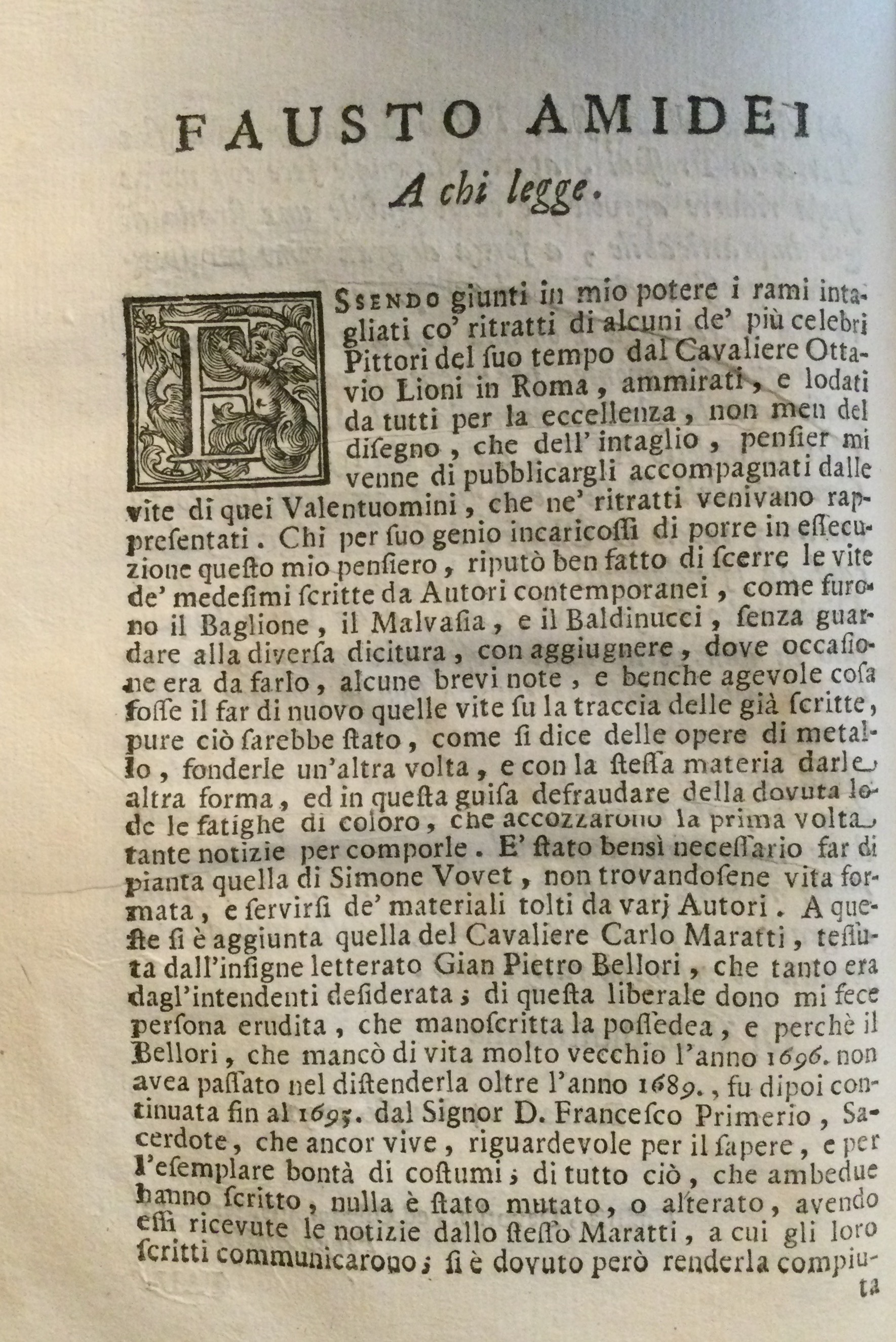 Quando Fausto Amidei, libraio romano del XVIII secolo, entrò in possesso di alcune matrici incise dal Leoni a bulino e acquaforte nel periodo 1622-1625 raffiguranti noti pittori italiani del suo tempo, ebbe l’idea di realizzare una pubblicazione a stampa dove tali ritratti venissero accompagnati dalle storie delle vite dei soggetti rappresentati. Il progetto si collocava sulla scia della tradizionale storiografia artistica inaugurata da Giorgio Vasari e poi ripresa da molti suoi epigoni nel corso dei secoli successivi, ma trovò nei propositi dell’Amidei un’originale declinazione: le note biografiche da utilizzare per accompagnare i ritratti erano in questo caso già edite e scritte da autori diversi, con l’eccezione della vita di Carlo Maratta scritta da Giovanni Pietro Bellori esistente al tempo solo in forma manoscritta. Le biografie furono estrapolate perlopiù da Le vite de’ pittori, scultori et architetti di Giovanni Baglione – come quella dello stesso Leoni preceduta dal suo autoritratto inciso - da Felsina pittrice vite de pittori bolognesi di Carlo Cesare Malvasia per quella del Guercino e da Notizie dei professori del disegno da Cimabue in qua di Filippo Baldinucci per quella di Gian Lorenzo Berini e ristampate con piccole modifiche, aggiunte e omissioni. Nel caso della biografia di Simon Vouet, probabilmente non disponibile in forma integrale, si decise di comporla mettendo assieme frammenti di autori vari.