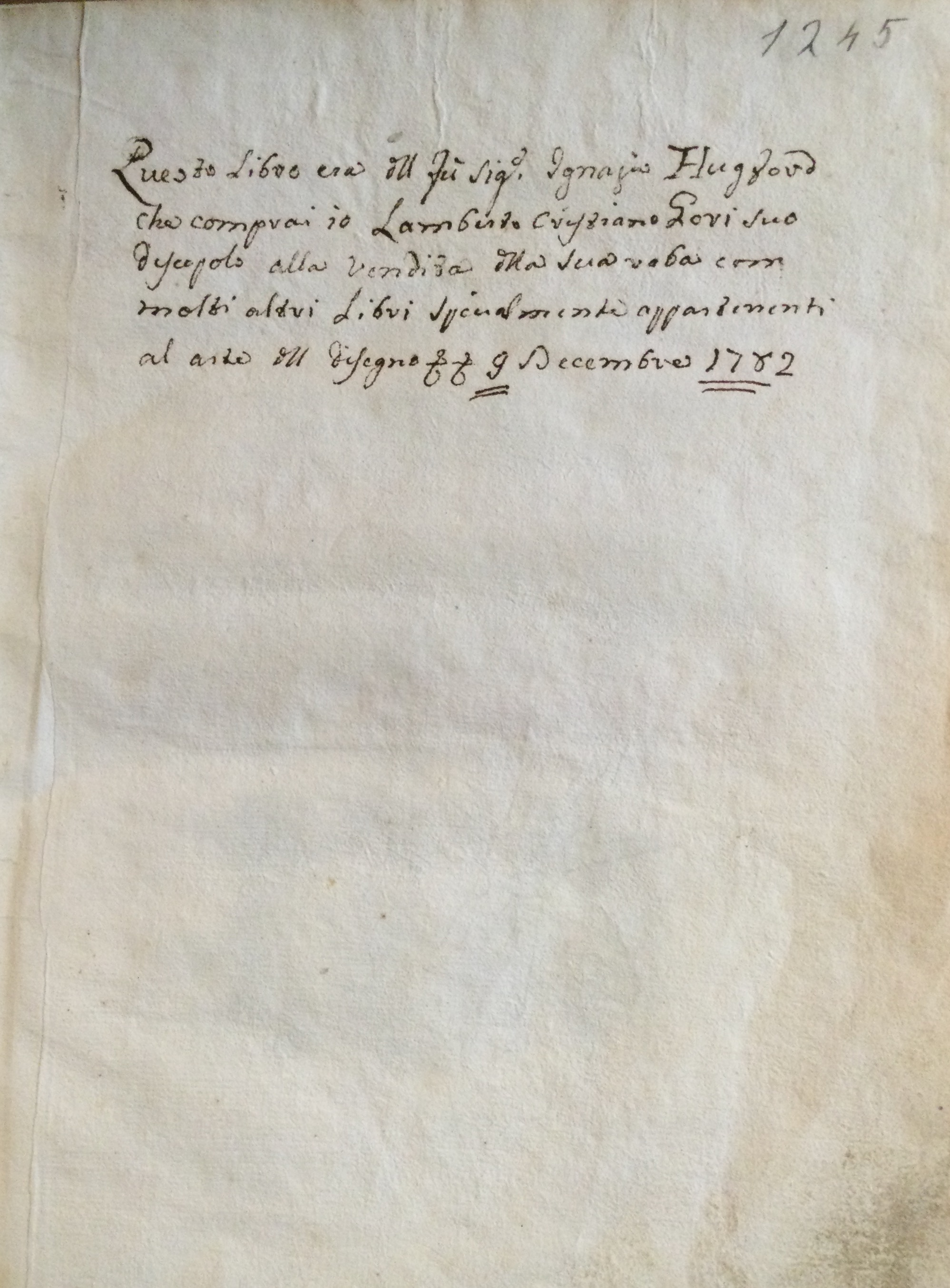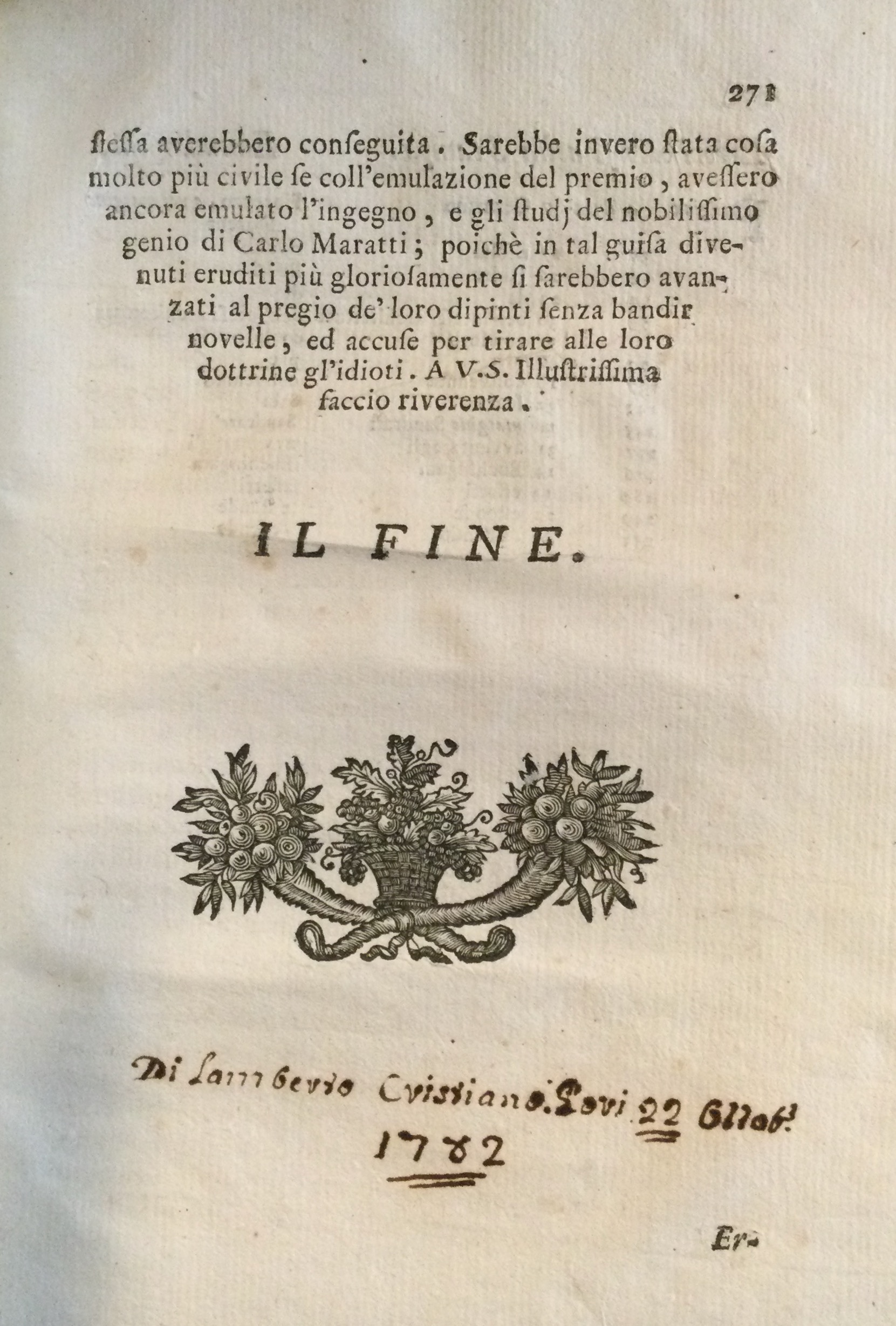 Il volume contiene una dedicatoria del curatore a Livio de Carolis marchese di Prossedi - facoltoso committente di palazzi e fontane tra la capitale e i territori del frusinate e del latinense - e una nota ai lettori, nella quale viene illustrato il piano dell’opera e i passaggi per la sua realizzazione. Una nota di possesso manoscritta documenta l’appartenenza dell’opera all’artista fiorentino del XVIII secolo Lamberto Cristiano Gori, il quale dichiarava di suo pugno di averla acquistata a una vendita di beni di proprietà di Ignazio Hugford, fratello del monaco vallombrosano Enrico Hugford. Presso di loro, il Gori aveva appreso fin da piccolo i rudimenti del disegno e la tecnica della scagliola, nella quale egli si affermò come uno dei più originali interpreti della sua epoca.