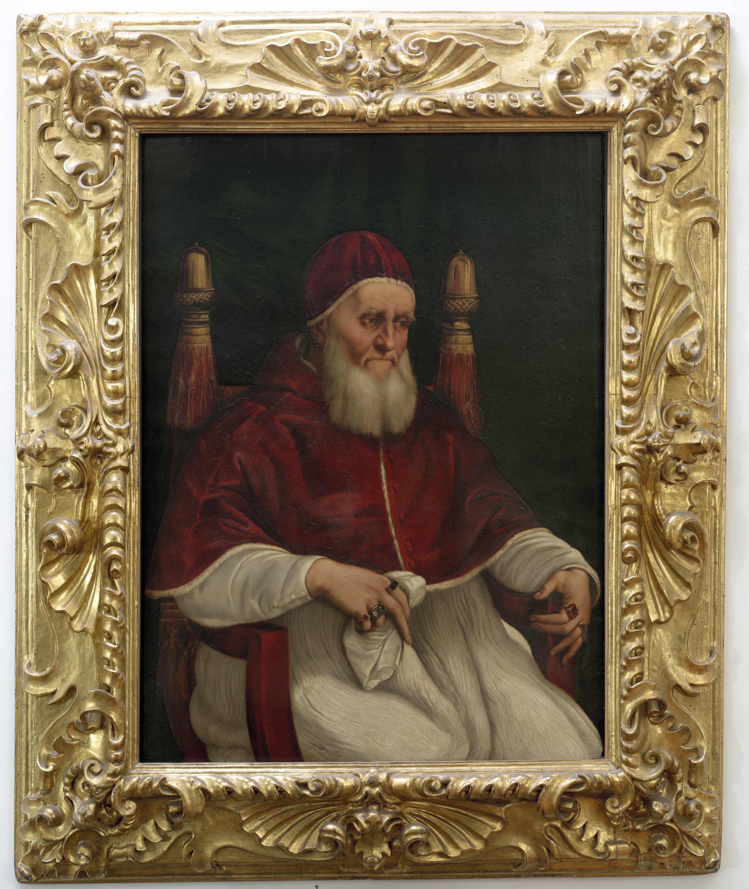 Raffaello era giunto a Roma nell’autunno del 1508 e in breve tempo aveva conquistato il favore del papa che gli aveva affidato la decorazione di quattro grandi ambienti prescelti per stabilire il suo nuovo appartamento privato, oggi noti come “Stanze di Raffaello”. Raffaello portò a termine la prima delle sale, quella denominata “della Segnatura”, nel 1511 ed è a questo periodo all’incirca che risale anche il progetto del ritratto di Giulio II. Il papa viene raffigurato su una sedia camerale i cui montanti hanno una terminazione a forma di ghianda: si tratta di un brillante espediente di Raffaello per richiamare i simboli araldici della famiglia Della Rovere (le ghiande appunto, frutti del rovere). Lo spazio è definito da un tendaggio che in origine doveva avere un colore verde bottiglia, oggi non più apprezzabile a causa dell’ossidazione dei pigmenti e del conseguente viraggio del colore in una tonalità bruno scuro. L’espressione assorta del ritrattato, che fissa un punto indefinito davanti a sé, e la posizione delle mani ingioiellate- una stringe un fazzoletto, l’altra sembra quasi volersi aggrappare al bracciolo- formano un insieme di grande intensità emotiva. Non è tanto la sontuosità dell’abbigliamento, sebbene attentamente congegnato, a colpire lo spettatore, quanto i gesti del protagonista, l’espressione del suo volto stanco e cadente, còlto negli ultimi anni di vita tormentati dalle vicissitudini del lungo conflitto con la Francia e dalle perdite territoriali che ne erano derivate. Proprio a seguito di quegli avvenimenti, Giulio II decise di lasciarsi crescere la barba e di portarla in segno di lutto fino a che non avesse riconquistato i territori sottratti. L’impatto provocato sul pubblico del tempo dall’effigie di quel papa “terribile” e insieme vecchissimo è testimoniato dalle parole di Giorgio Vasari nella biografia di Raffaello, dove precisa che il dipinto era “tanto vivo e verace che faceva temere il ritratto a vederlo, come se proprio egli fosse il vivo” ed aggiunge una importante notizia riguardo alla sua iniziale collocazione “la quale opera è oggi in Santa Maria del Popolo”. Il dipinto di cui parla il biografo, identificato in passato con l’esemplare della Galleria Palatina, è oggi invece unanimemente riconosciuto nella versione conservata alla National Gallery di Londra, peraltro eseguita a olio su tavola. Il nostro quadro, invece, pervenuto a Firenze con l’eredità di Vittoria della Rovere, è da ritenersi una seconda versione sul medesimo modello preparatorio, verosimilmente eseguita dagli allievi dell’Urbinate per essere inviata a Urbino, in omaggio alla famiglia regnante cui il papa apparteneva.