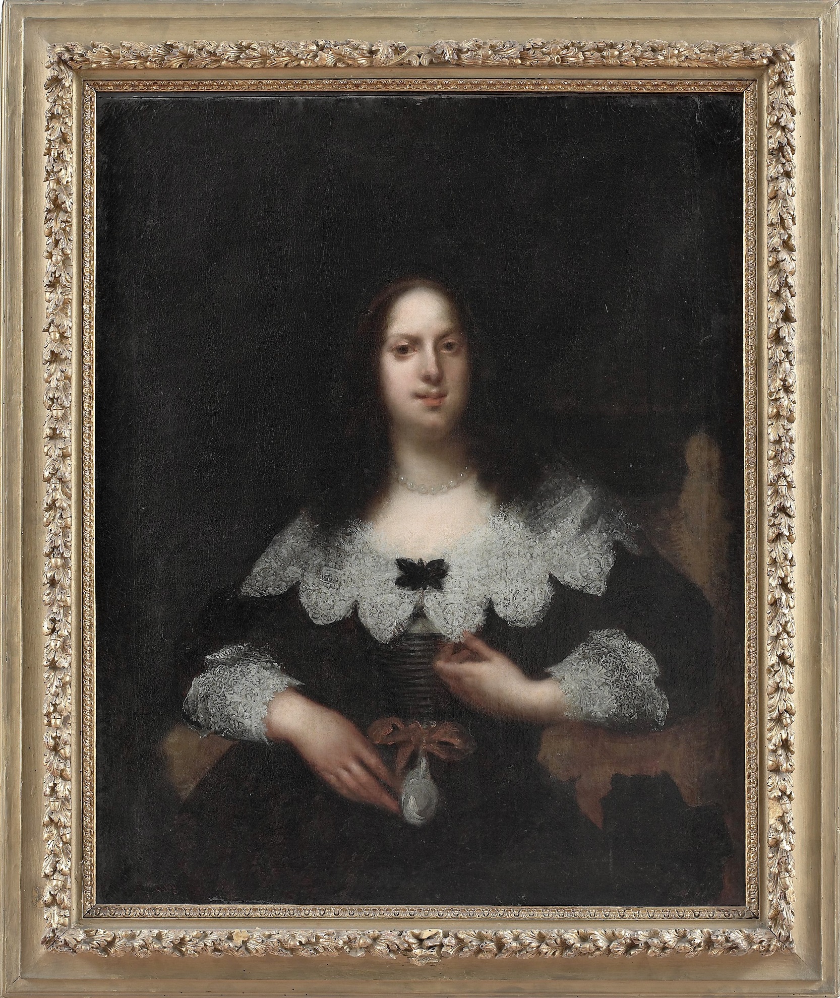 La granduchessa, donna dalla viva curiosità intellettuale e grande mecenate, è qui immortalata, poco più che ventenne, da Francesco Furini. Il pittore fiorentino ne delinea con abilità le fattezze trattando con una stesura veloce e apparentemente incompiuta gli elementi della composizione ritenuti secondari, come la poltrona su cui è seduta. Il medaglione d’argento che le orna la veste sembrerebbe riportare il suo emblema: un’ostrica con all’interno una perla.