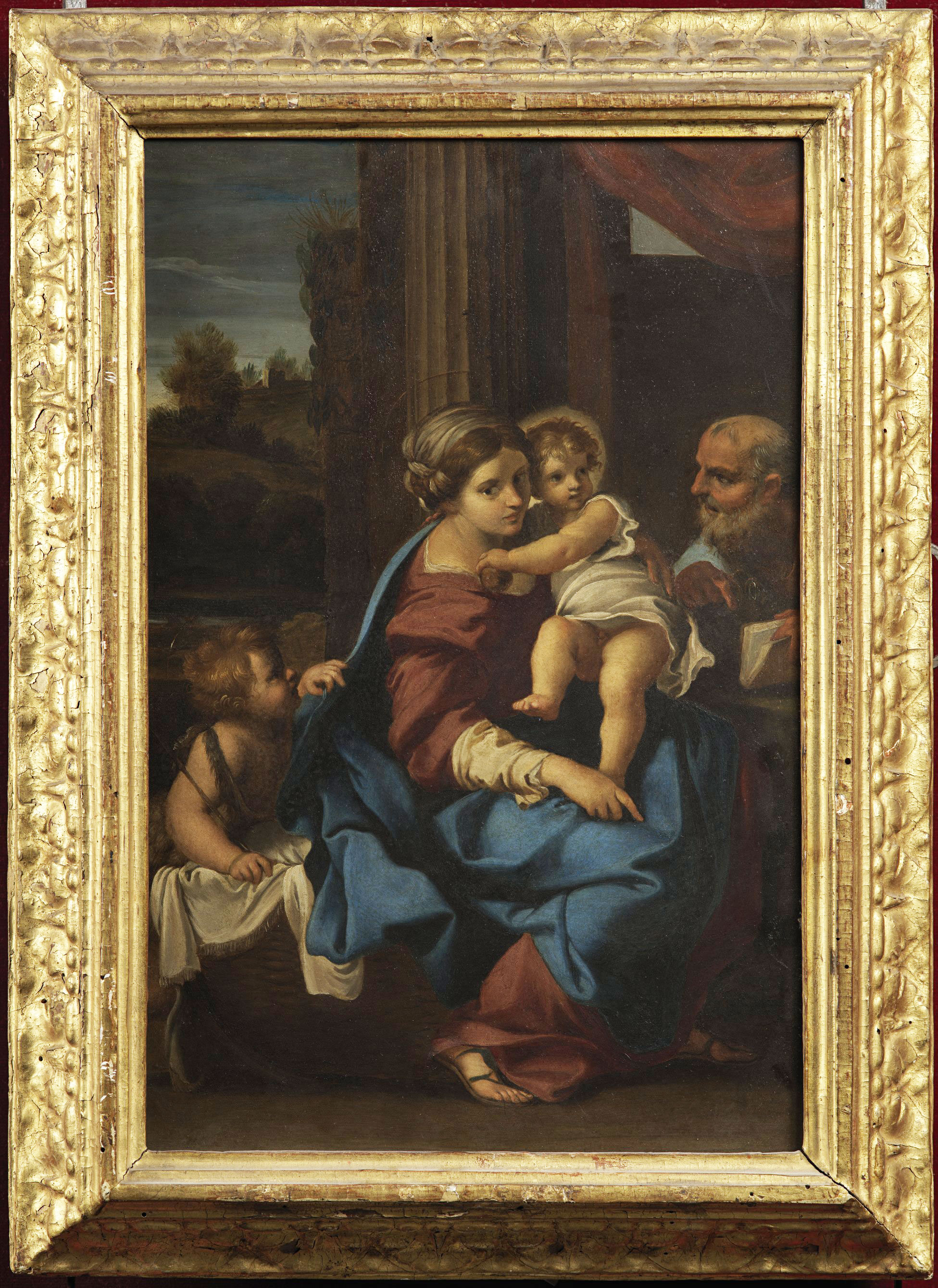 Questa scena molto intensa si svolge in un largo paesaggio assolato, delimitato dai ruderi antichi presso i quali i protagonisti sono riuniti in un animato scambio di gesti e di sguardi. Maria, seduta un po’ precariamente sul bordo della culla in vimini, stenta a tener fermo il suo bambino irrequieto che giocherella con la mela, simbolo del peccato originale che egli stesso è chiamato a redimere con il suo sacrificio sulla croce. San Giuseppe, intento alla lettura di un libro, inserisce per un attimo l’indice tra le pagine per tenere il segno e si toglie gli occhiali per prestare attenzione al figlio. Sul lato opposto spunta San Giovannino, riconoscibile per la tunichetta di pelli e la croce astile, si avvicina alla Vergine scostando il manto blu per prendere parte a quel tenero scambio di affetti.