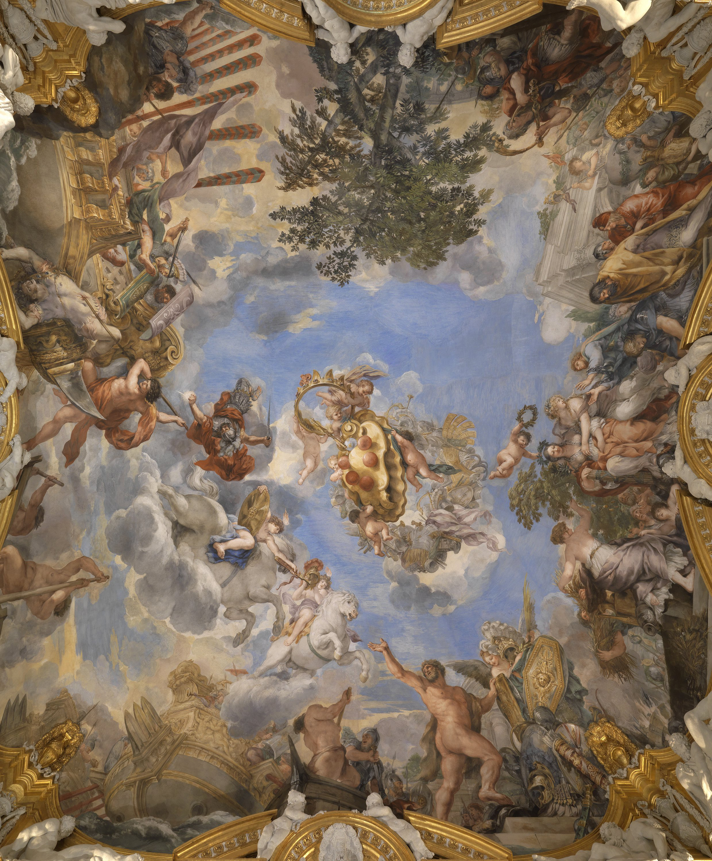 Al centro della volta, sollevato in volo da uno stuolo di cherubini, è lo stemma mediceo, sormontato da una corona che reca iscritto al suo interno il nome di Ferdinando II de’ Medici, committente dell’illustre impresa decorativa. Per la partitura teatrale e il vorticoso disporsi dei personaggi nel soffitto, la sala raggiunge, forse più di altre stanze, l’illusionismo barocco della celebre volta di Palazzo Barberini che Pietro da Cortona aveva da poco terminato di affrescare a Roma con il Trionfo della Divina Provvidenza.