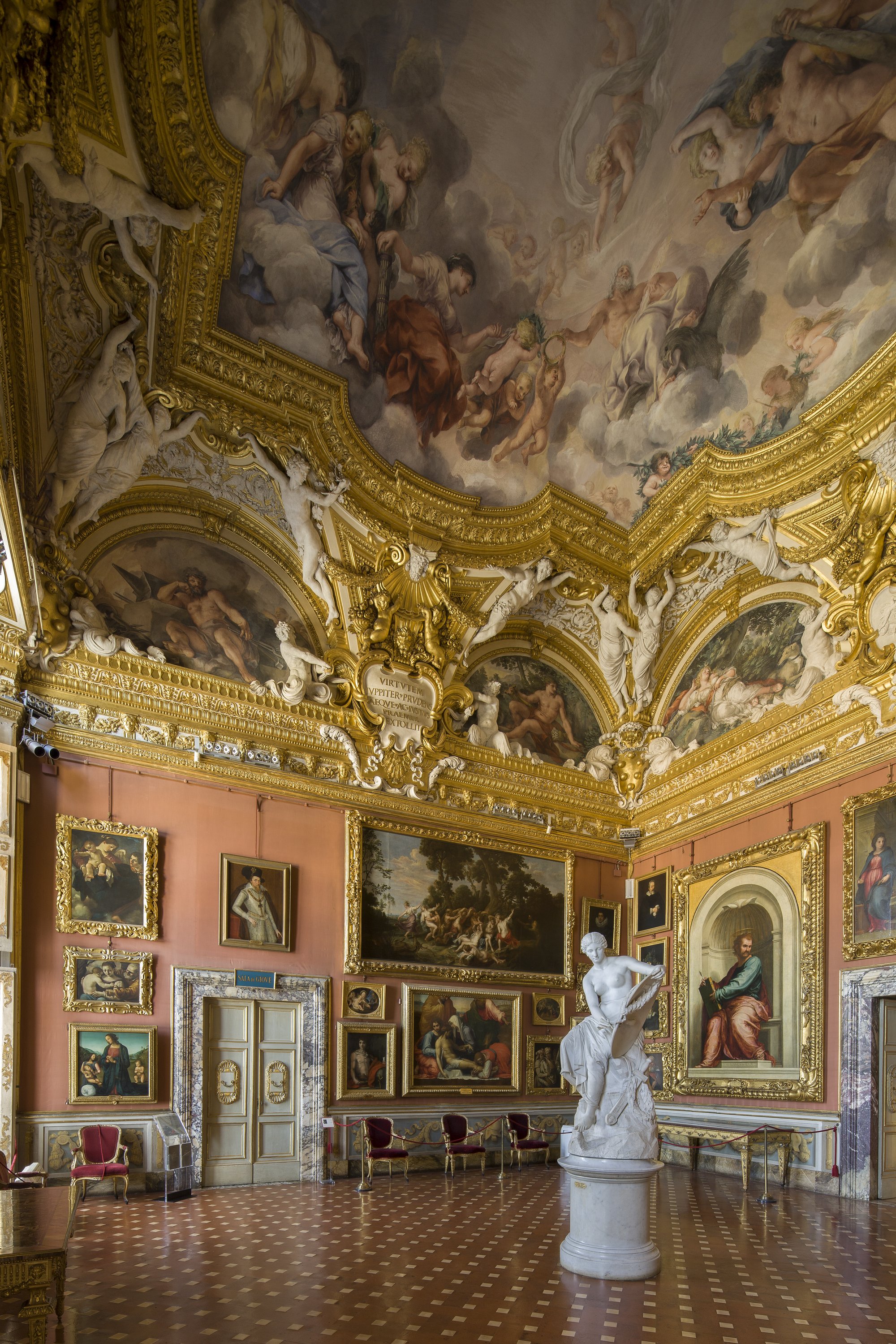 La sala in epoca medicea era adibita a Sala dell’Udienza o del Trono, e ancora oggi si notano, al di sotto della volta affrescata, i ganci a cui veniva appeso il baldacchino che sovrastava il podio dove il granduca teneva le udienze pubbliche. Il ricco complesso ornato di affreschi, stucchi bianchi e dorati, e pennacchi decorati con conchiglie, esalta il ruolo pubblico di questo ambiente e rappresenta la summa delle capacità artistiche di Pietro da Cortona, che qui dissemina invenzioni straordinarie nei più piccoli dettagli. Tutto è attribuibile alla sua regia, a partire dai molti disegni preparatori – oggi in gran parte conservati presso il Gabinetto dei Disegni e delle Stampe delle Gallerie degli Uffizi –, fino al diretto coordinamento delle maestranze impegnate sui ponteggi: pittori, doratori, muratori e stuccatori.