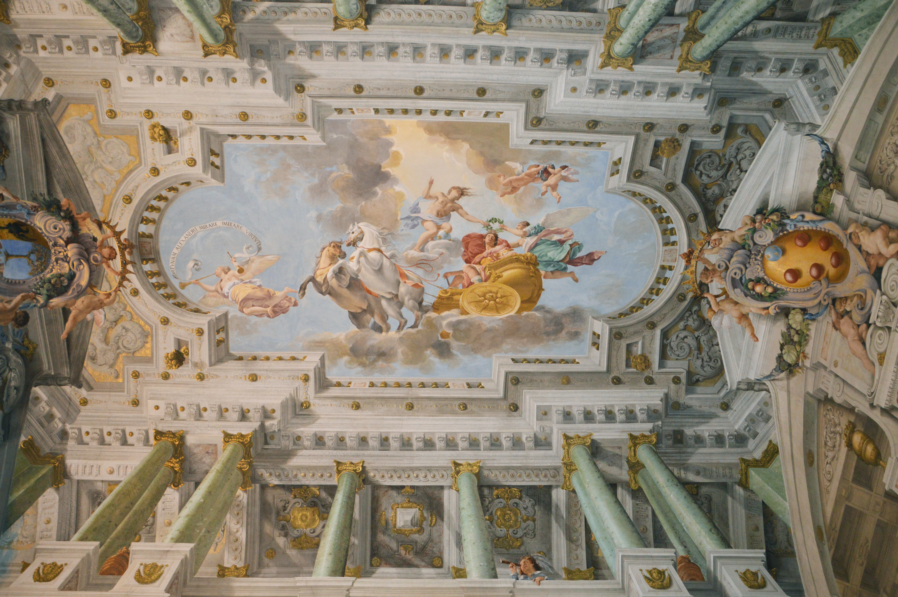 Al centro del soffitto campeggia la scena raffigurante l’Apoteosi di Alessandro Magno: l’imperatore è seduto sul carro di trionfo, tirato da due cavalli bianchi ed incoronato con l’alloro da Apollo, protettore delle Lettere e delle Arti. Sulla sinistra la Fama con la tromba ne annuncia il trionfo e regge un cartiglio che invita ad emularne le virtù. Le imprese di Alessandro sono affrescate sulle pareti a monocromo e lumeggiate d’oro al fine di impreziosire e vivacizzare il tessuto cromatico della sala. Sulla parete centrale è dipinto, al di sotto dell’imponente stemma mediceo, il busto di marmo di ‘Alessandro morente’, il cui originale greco, nelle collezioni medicee dal 1580, è oggi esposto agli Uffizi. La celebrazione di Alessandro alludeva alla figura di Ferdinando II come protettore delle scienze e delle arti, asceso al potere come il condottiero macedone in giovane età.