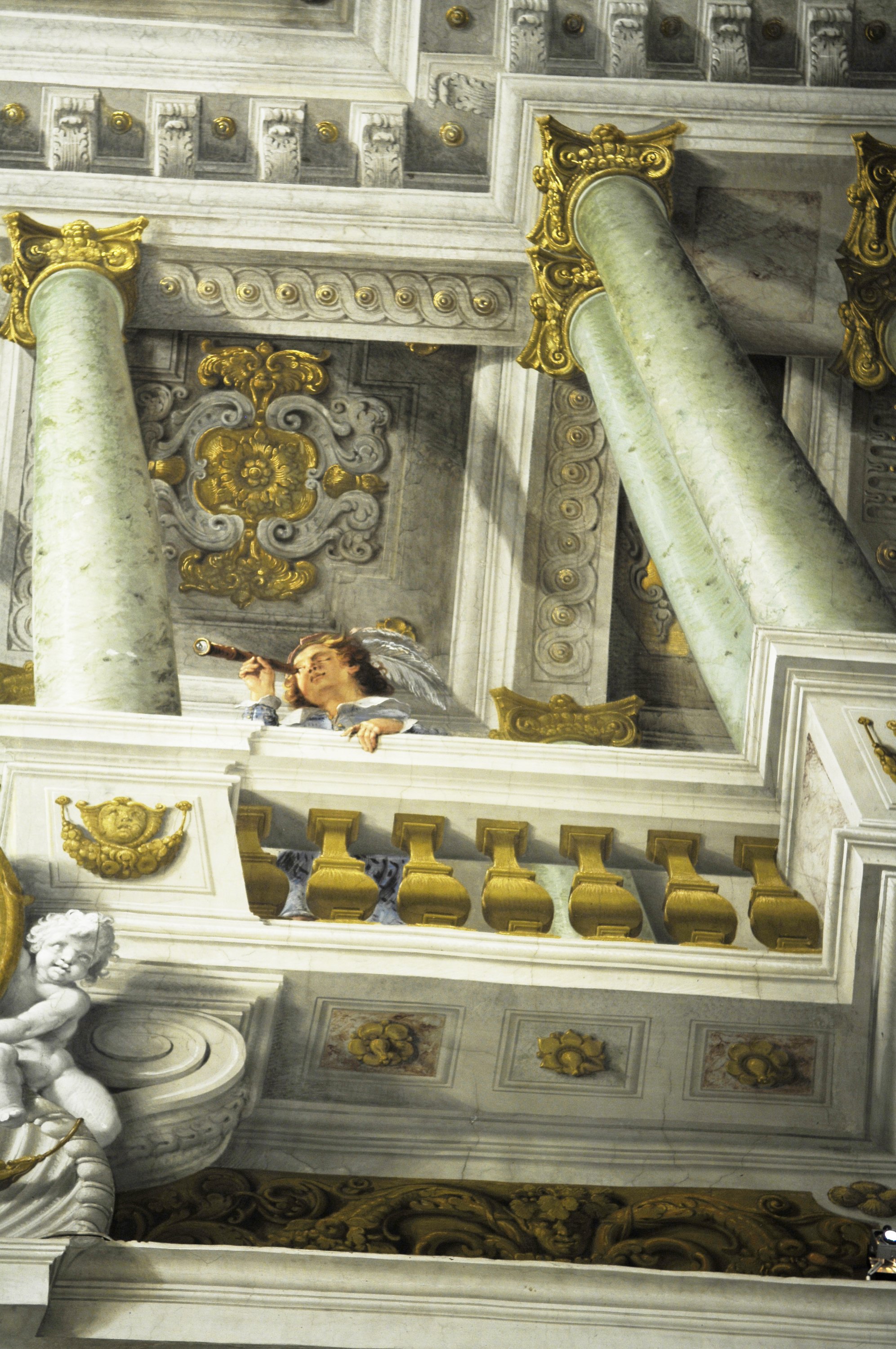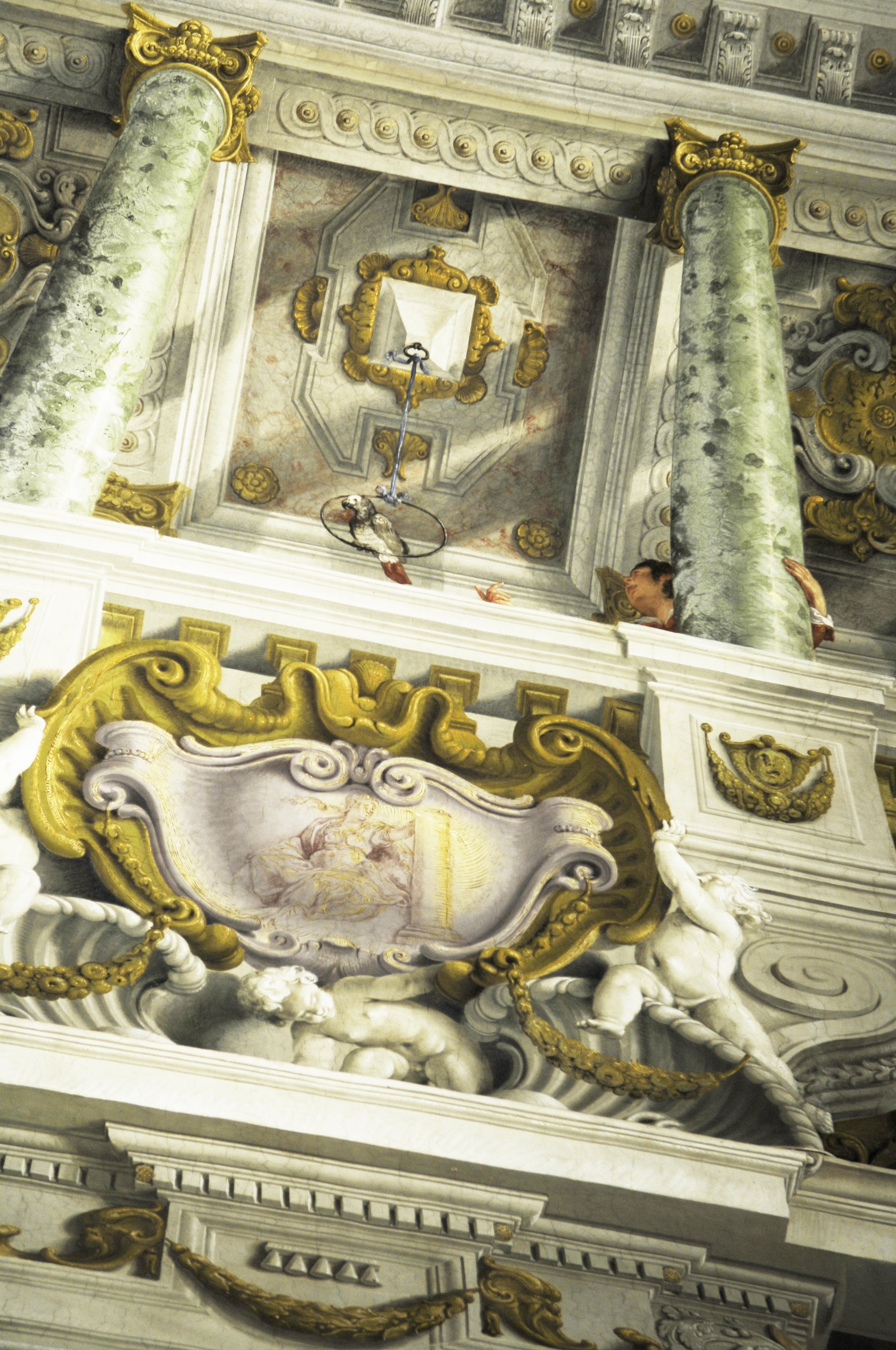 Anche in questa stanza compaiono, tra le finte architetture, personaggi della vita di corte, come un bambino che gioca con il pappagallo, e un giovane che scruta il cielo con il cannocchiale, allusivo alle rivoluzionarie scoperte di Galileo Galilei, che proprio in quel periodo, seppur protetto dai Medici, subiva il processo che lo portò all’abiura.