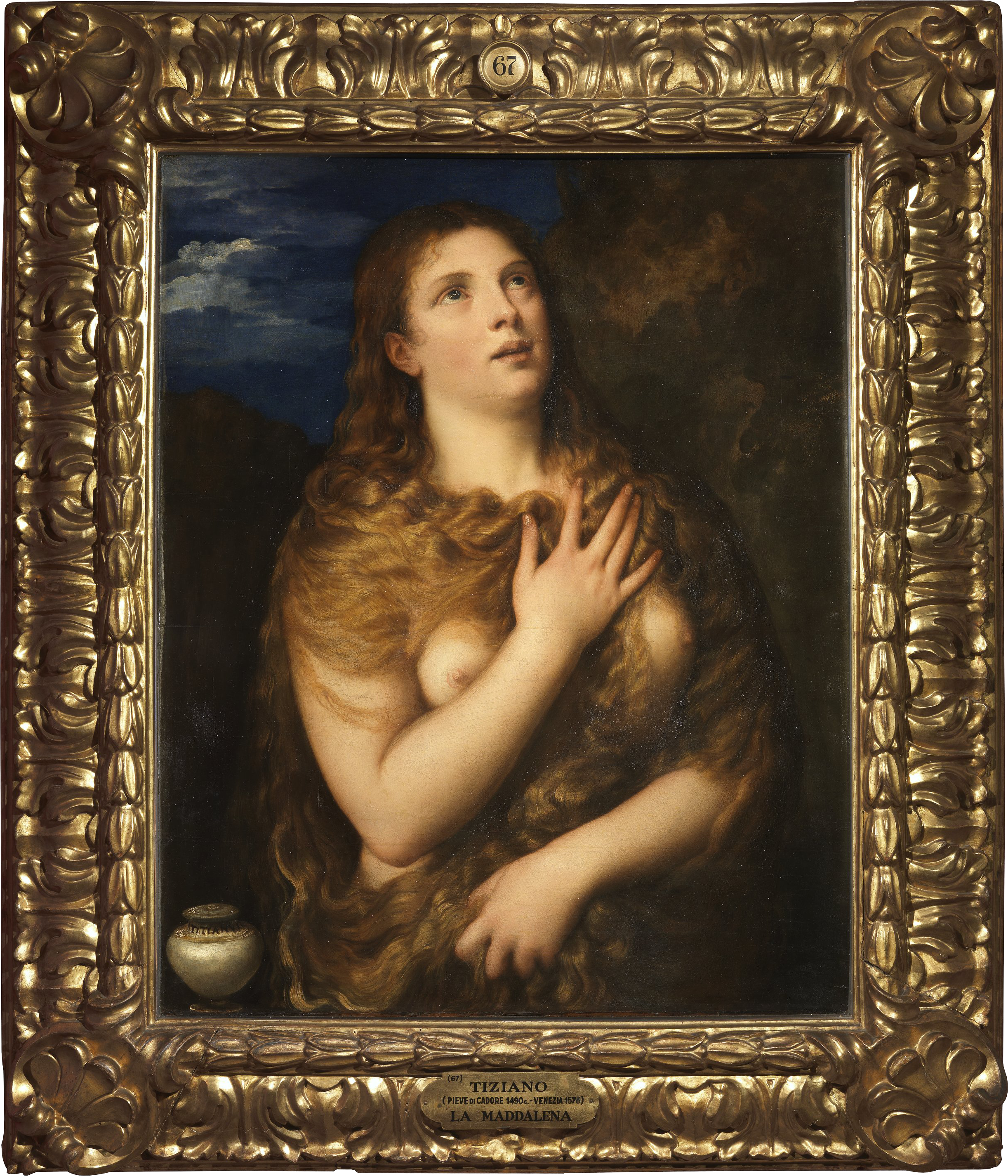 L’opera raffigura il soggetto della Maddalena penitente che fu quello più spesso replicato da Tiziano durante la sua lunga attività artistica, secondo un’iconografia destinata ad aver larga fortuna per l’inconsueto e audace fascino erotico che prorompe dal nudo femminile della santa in atto di rivolgere con devozione gli occhi al cielo. La Maddalena che Tiziano ci presenta è la prostituta pentita, la donna dal passato dissoluto che, recatasi, secondo il racconto evangelico (Luca 7, 36-50), nella casa di Simone il fariseo per chiedere perdono a Gesù, versa lacrime di pentimento sui piedi del Redentore, asciugandoli poi con i lunghi capelli e profumandoli con l’unguento prezioso, racchiuso nel vasetto su cui il pittore appone la propria firma. E’ una figura satura di femminilità, che Tiziano descrive con una pennellata densa e pastosa dalle tonalità calde, evidenziando gli occhi intrisi da lacrime cristalline e il meraviglioso manto di capelli biondo ramati sparsi a coprire la nudità dei seni palpitanti – è nuda perché risoluta a spogliarsi di tutto il suo passato. Per quest’immagine in cui persistono ambiguamente l’idea della peccatrice e della penitente, il pittore potrebbe aver fatto posare qualche cortigiana veneziana, come molte ve ne furono nel Cinquecento che, pentitesi e convertite, poterono prendere a modello di redenzione il dipinto tizianesco che ebbe gran fortuna e fu ampiamente replicato dal maestro e dalla sua bottega.